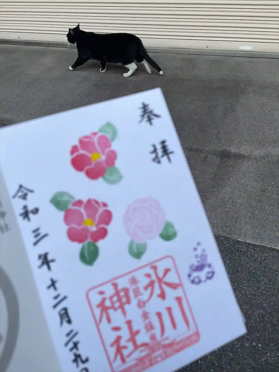 スマホの中に社内の猫さんと朱印帳のツーショット1枚あり、