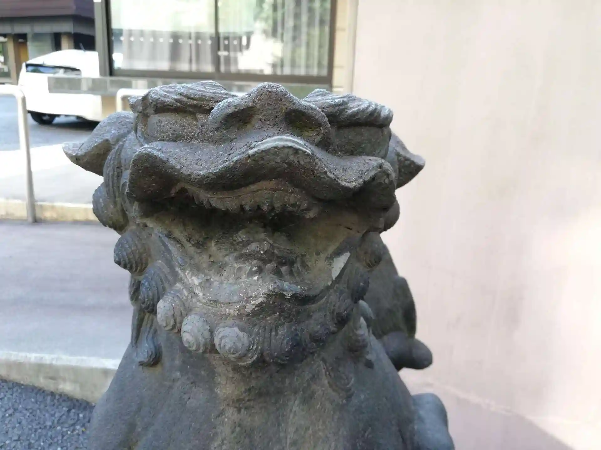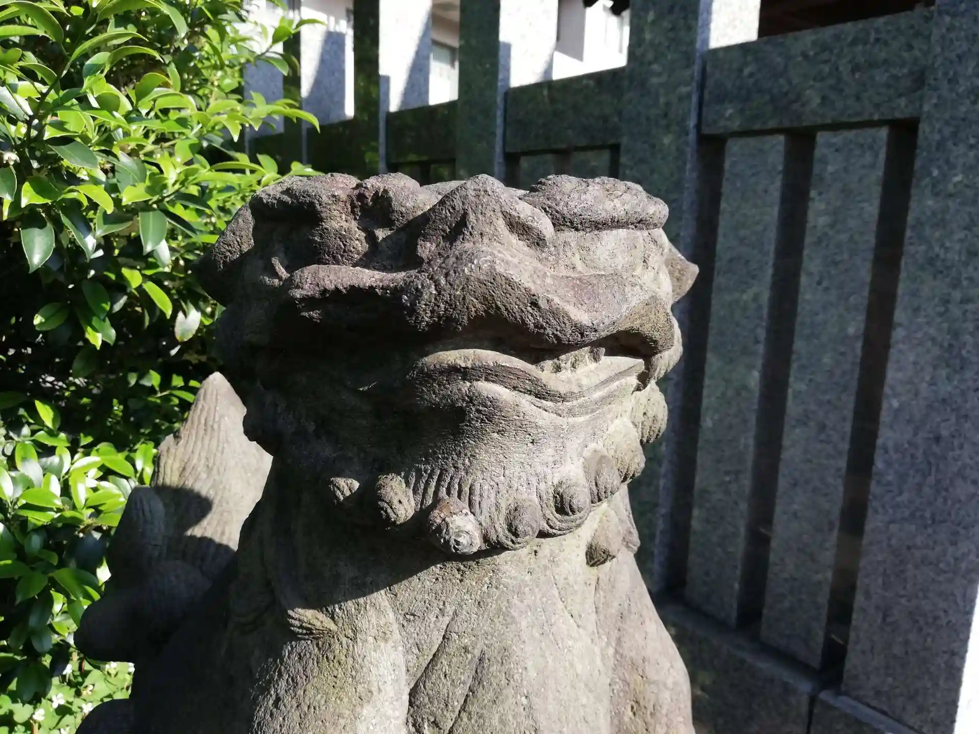 剛健な狛犬。角があります