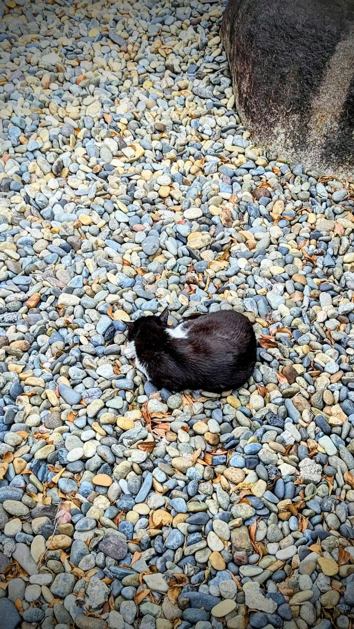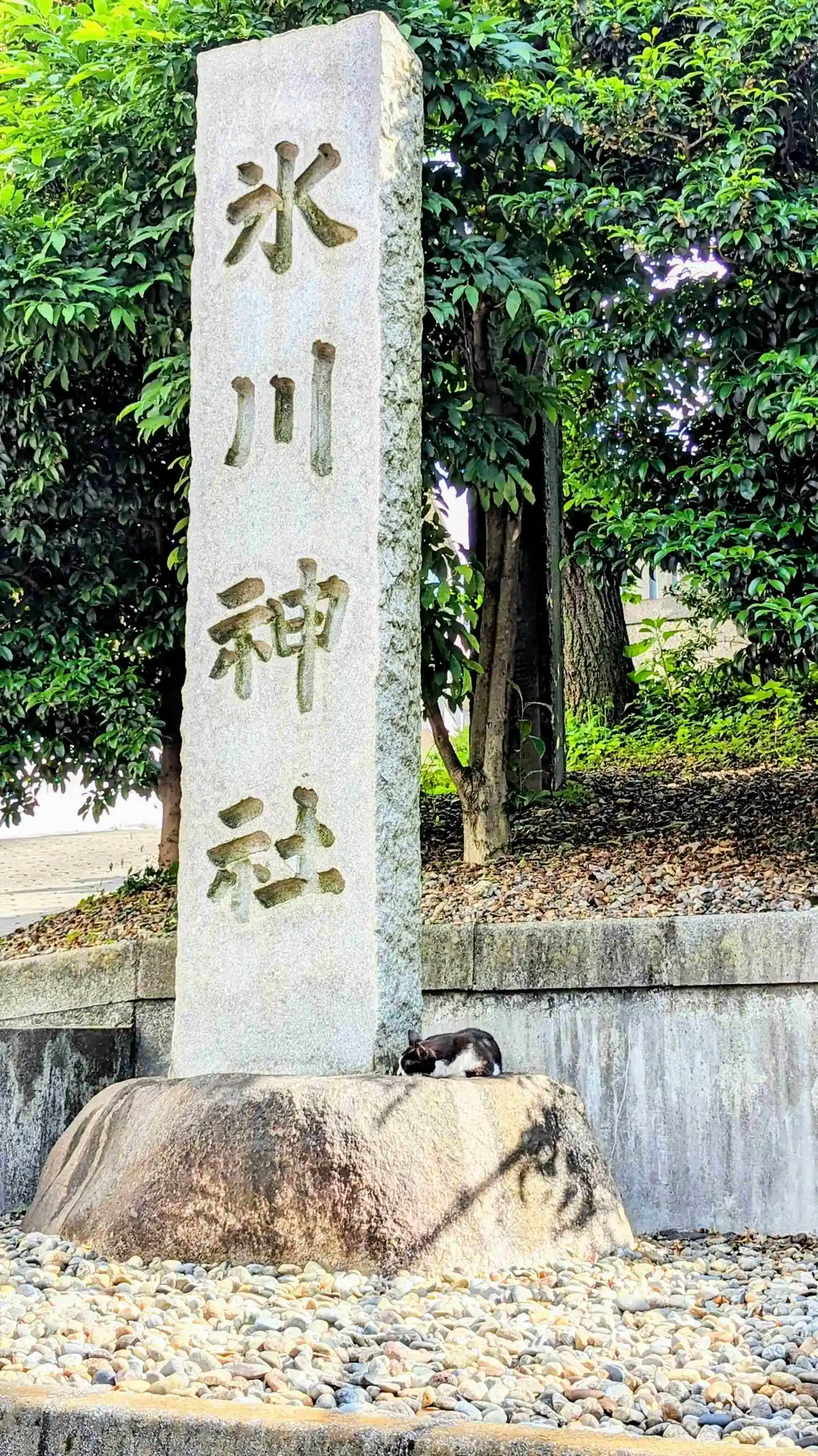 帰りに見たら社号碑から降りて寝ていました😺