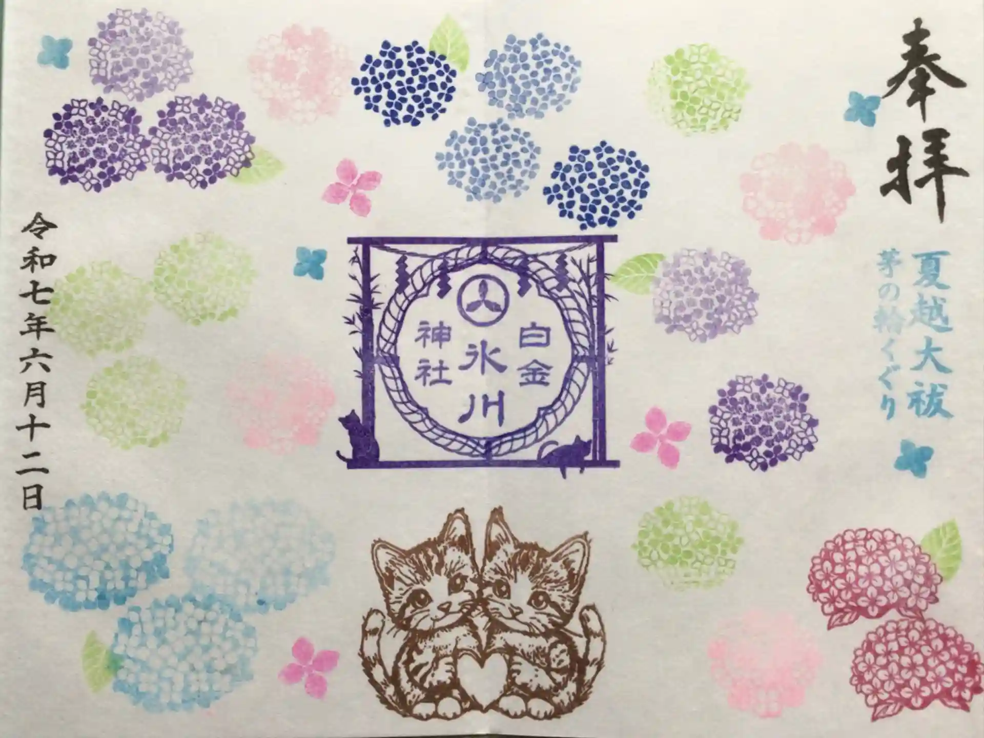 次の頁が左側半面だったので、こちらに、紫陽花とにゃんこの月替わり御朱印を頂いて、次の頁に見開きの御朱印を頂きました。