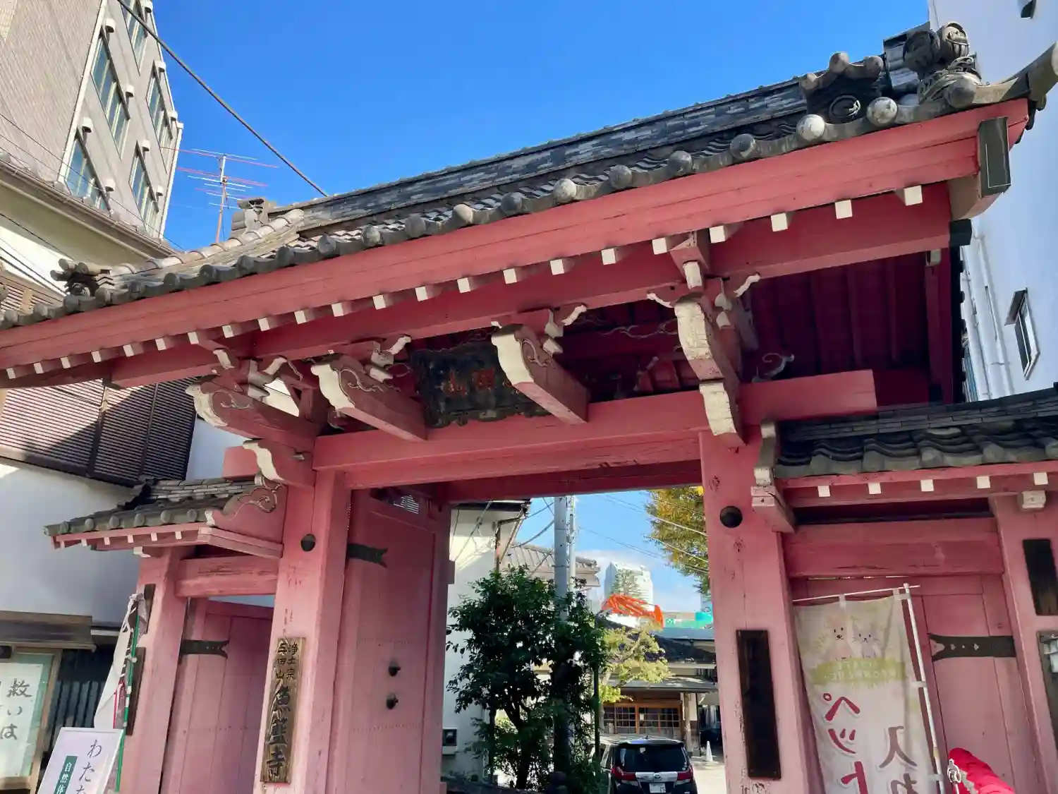 坂の途中にある赤い門が目印です。