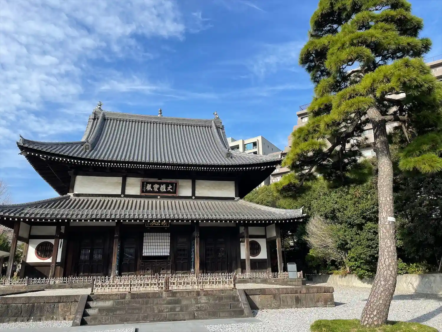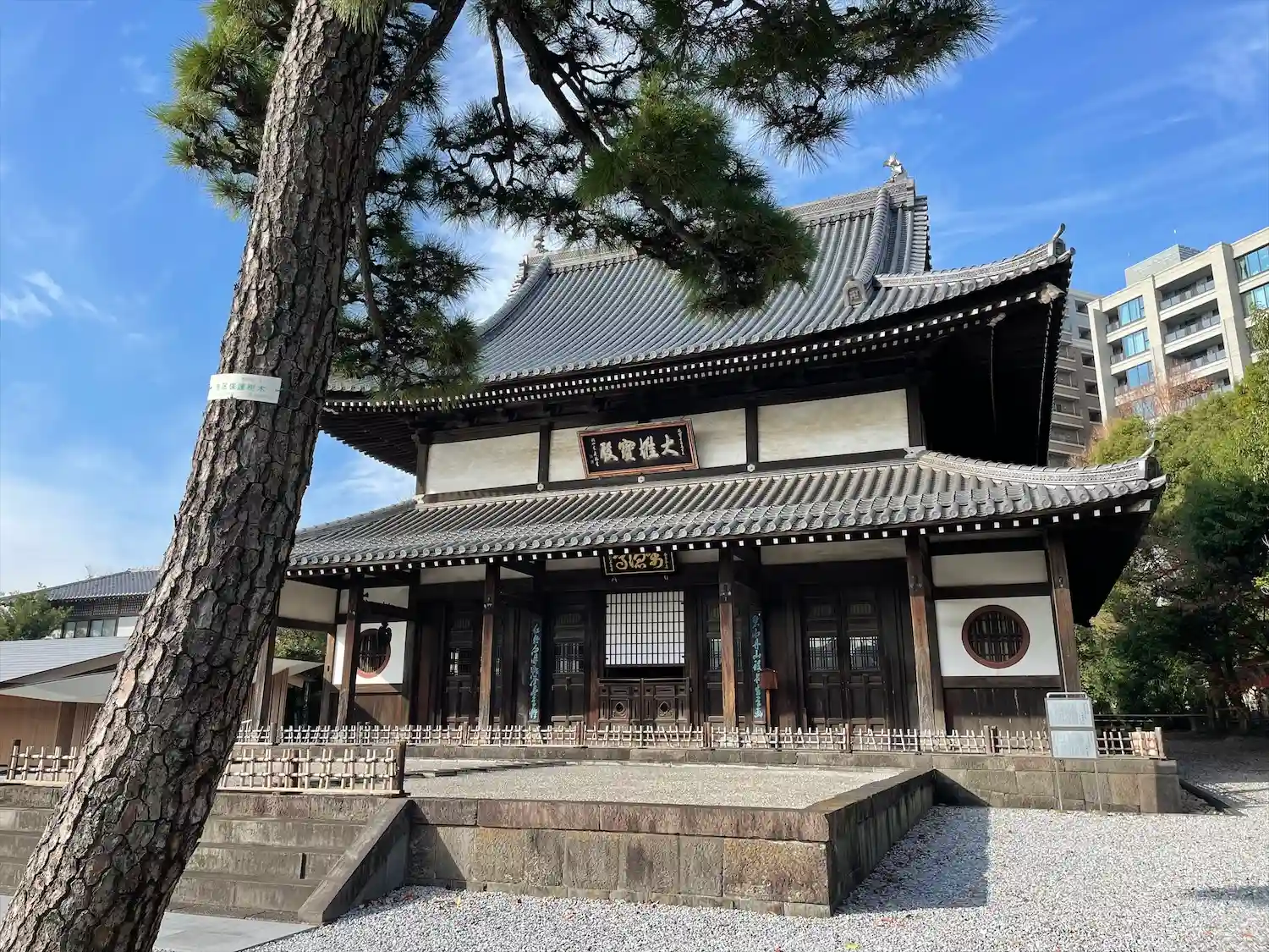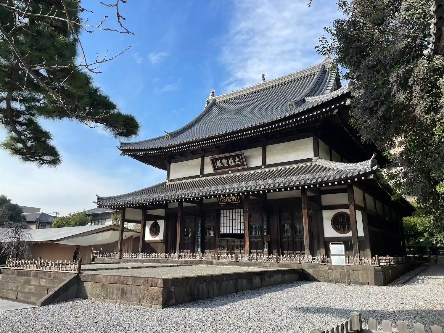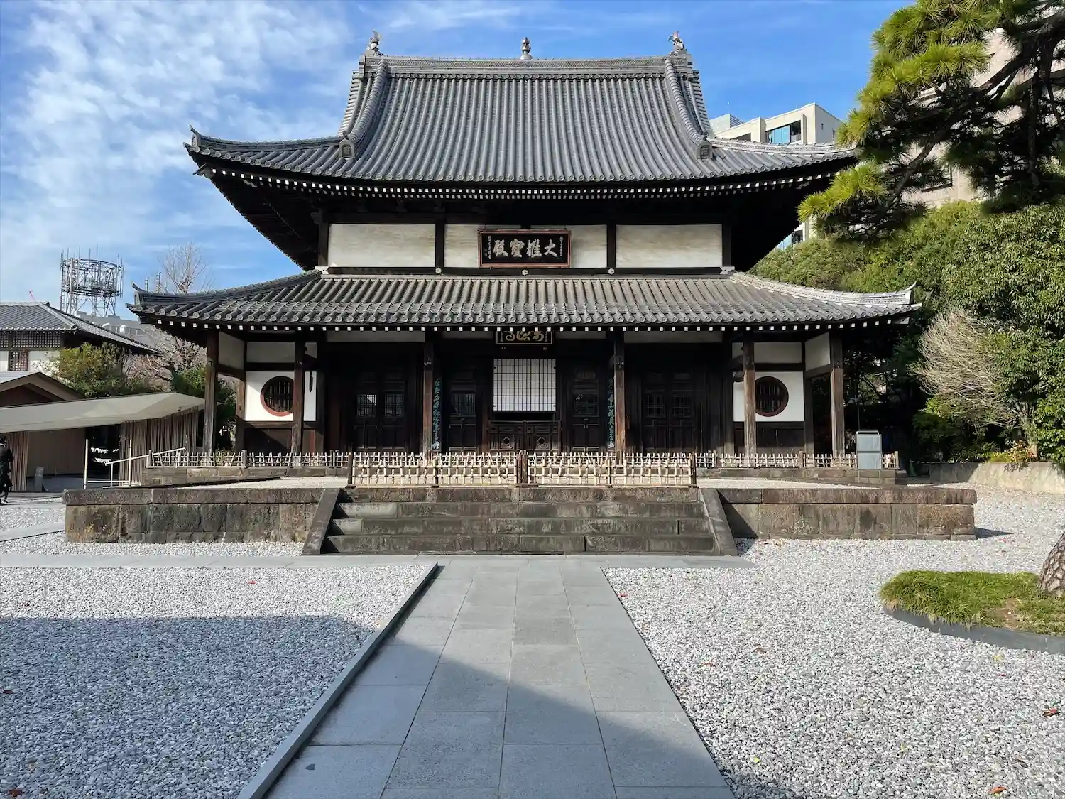 境内に入ると、お寺とは思えないスタイリッシュさがありました。調べたところ、本堂左の建物(庫裡)は隈…