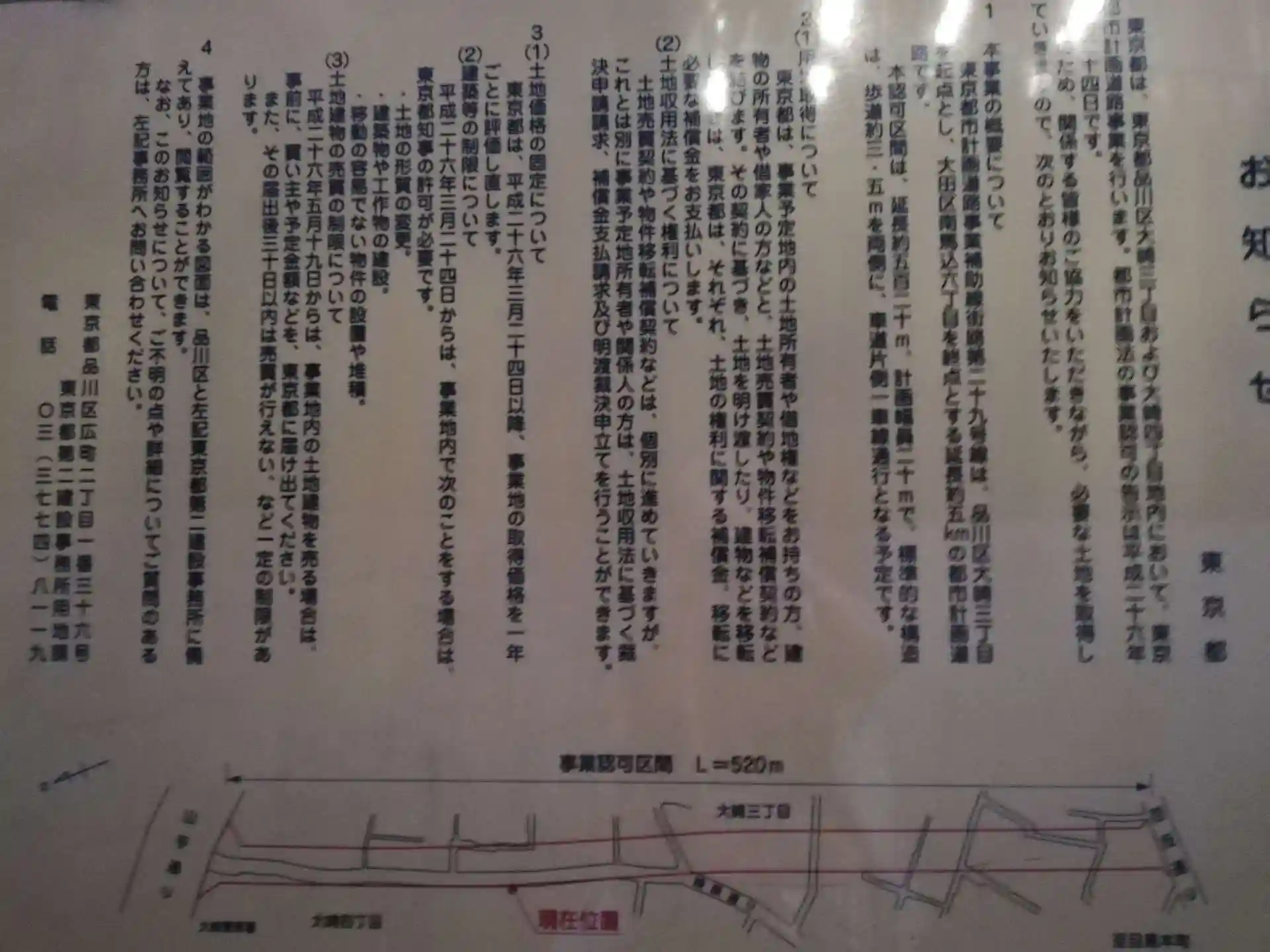 都市計画道路が土地を斜めに分断して小さな三角形の境内になりました。隣の緑のフェンスが元の境内地で、都市計画道路用地として都に所有権移転済みとなっています。