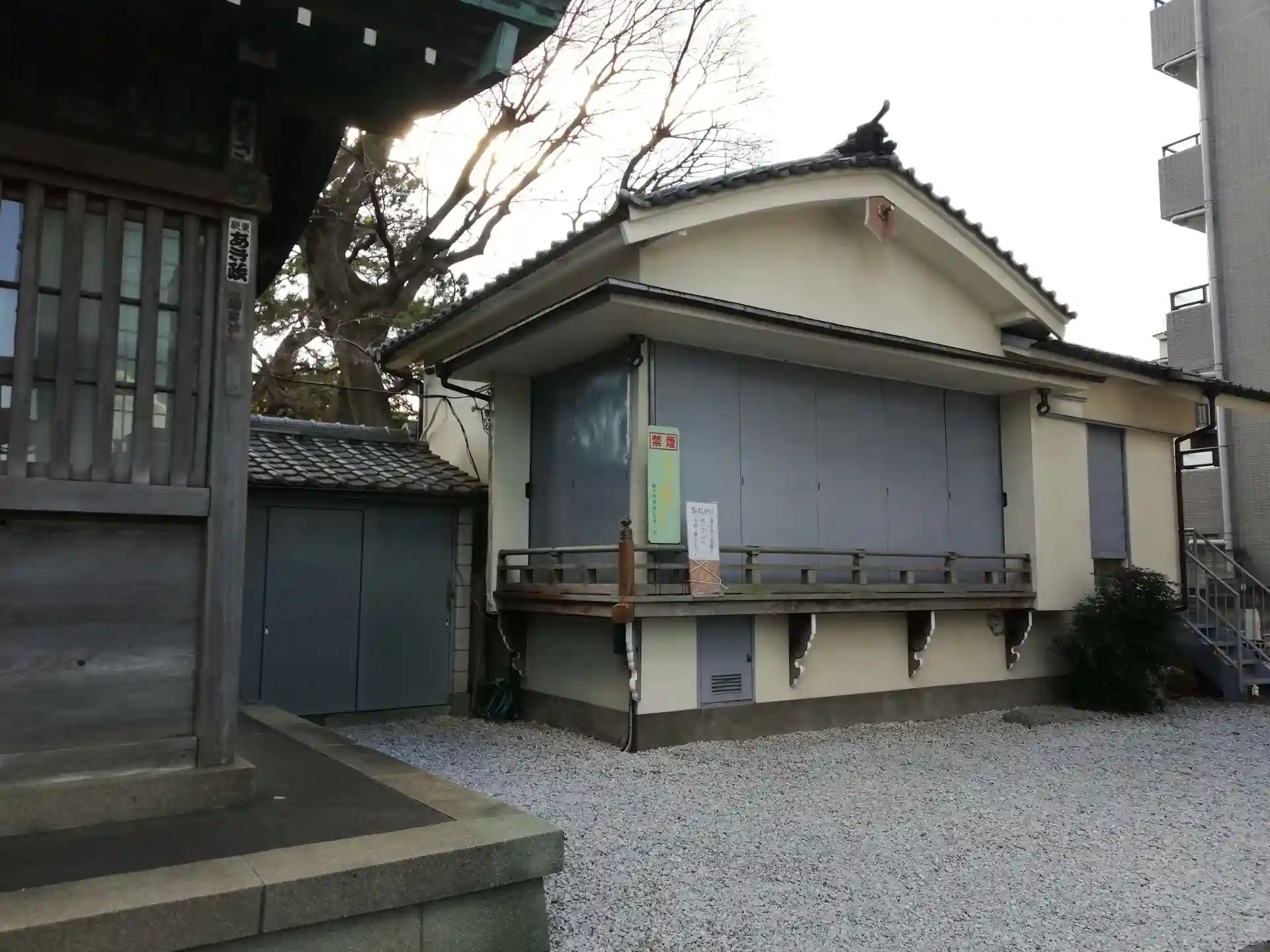 神楽殿。砂利駐車スペースは関係者専用と思われロープがかけられ進入禁止となっています。
