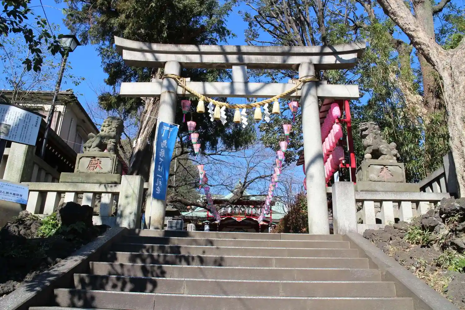 ピンクのぼんぼりとちょうちんで飾られた境内