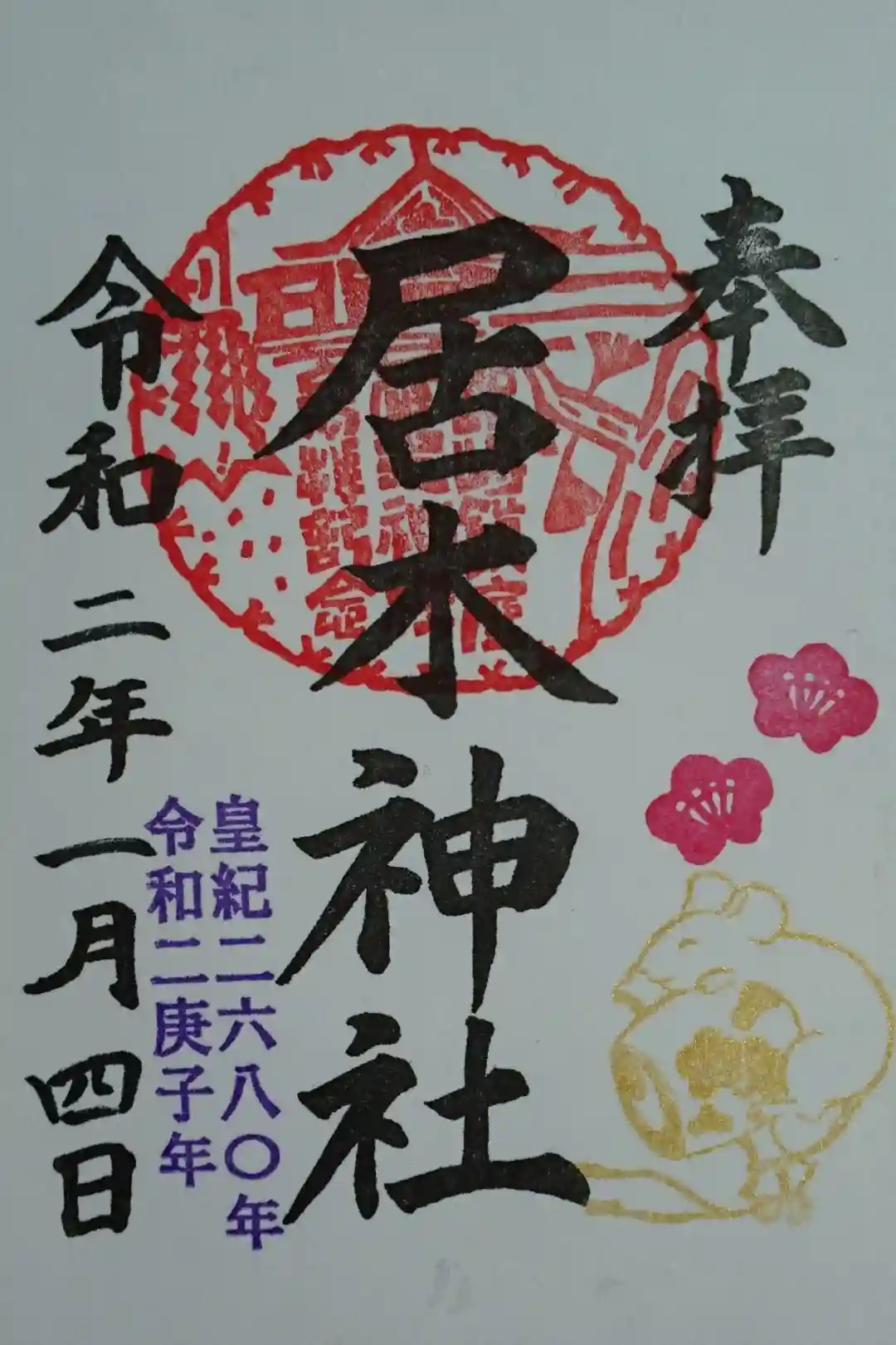 正月の限定御朱印です。金色のねずみさんの判子に、皇紀2680年の印もあります。こちらは1/7までと、1月土日祝のみの限定のようです。
