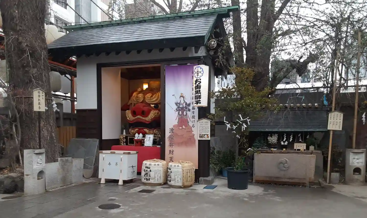 江戸時代に焼失した巨大な獅子頭は雄獅子(天井大獅子)が平成2年に、雌獅子(弁財天お歯黒獅子)が平成14年に再興され、境内の獅子殿・弁財天社に安置されております。本殿には江戸時代に焼失し平成24年に再興された『龍虎』の頭を見下ろす形で、焼失を免れた文化財の獅子頭が安置されております。