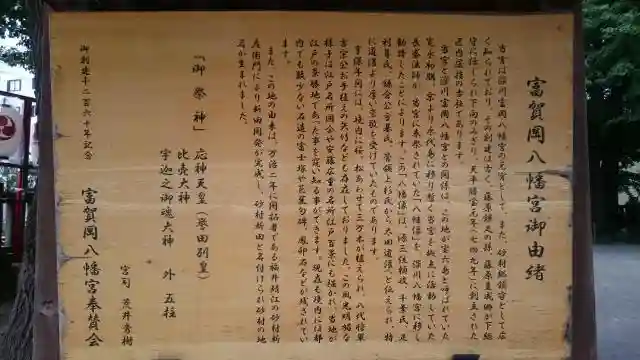 富賀岡八幡宮は、東京都江東区南砂に鎮座しています。最寄り駅は東京メトロ東西線の南砂町駅で、駅前から歩いておよそ10分ほどの距離です。境内に掲げられている由緒書によれば、御祭神は応神天皇、比売大神、宇迦之御魂大神をはじめとする八柱の神々。創建は奈良時代・天平勝宝元年(749年)と伝えられており、実に千年以上の歴史を刻む古社です。江東区という都市部の只中にありながら、由緒の深さを感じさせます。