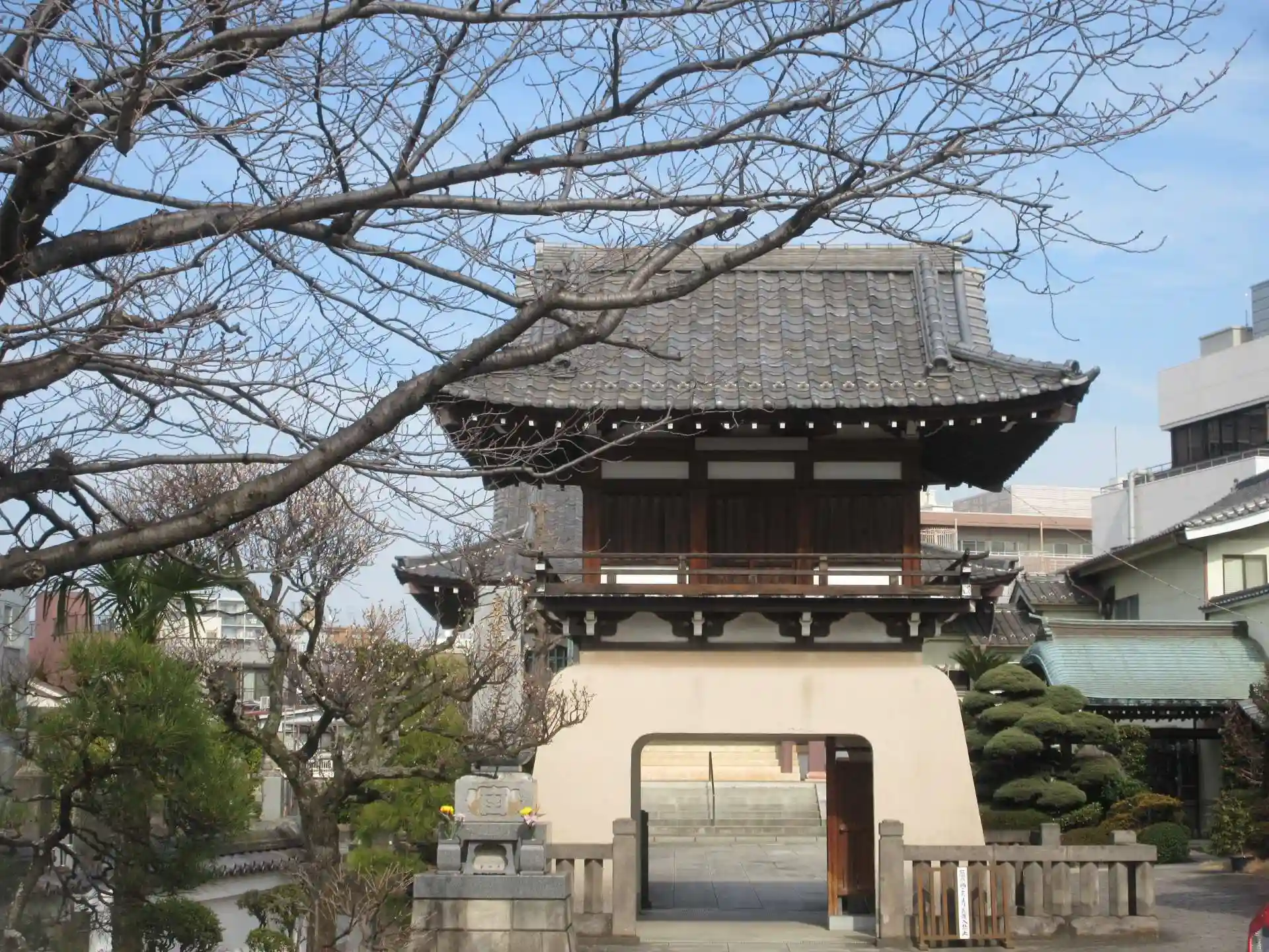 竜宮城のような門に散る前の梅の花の香りが温かいものでした。