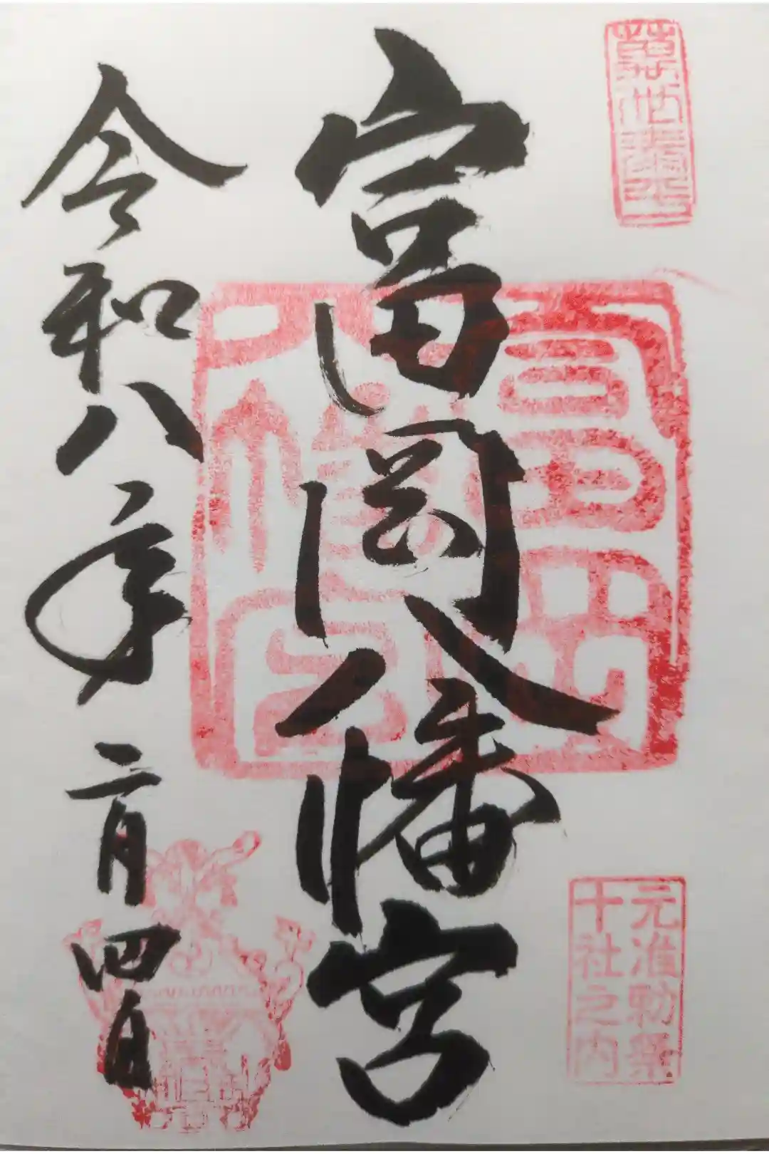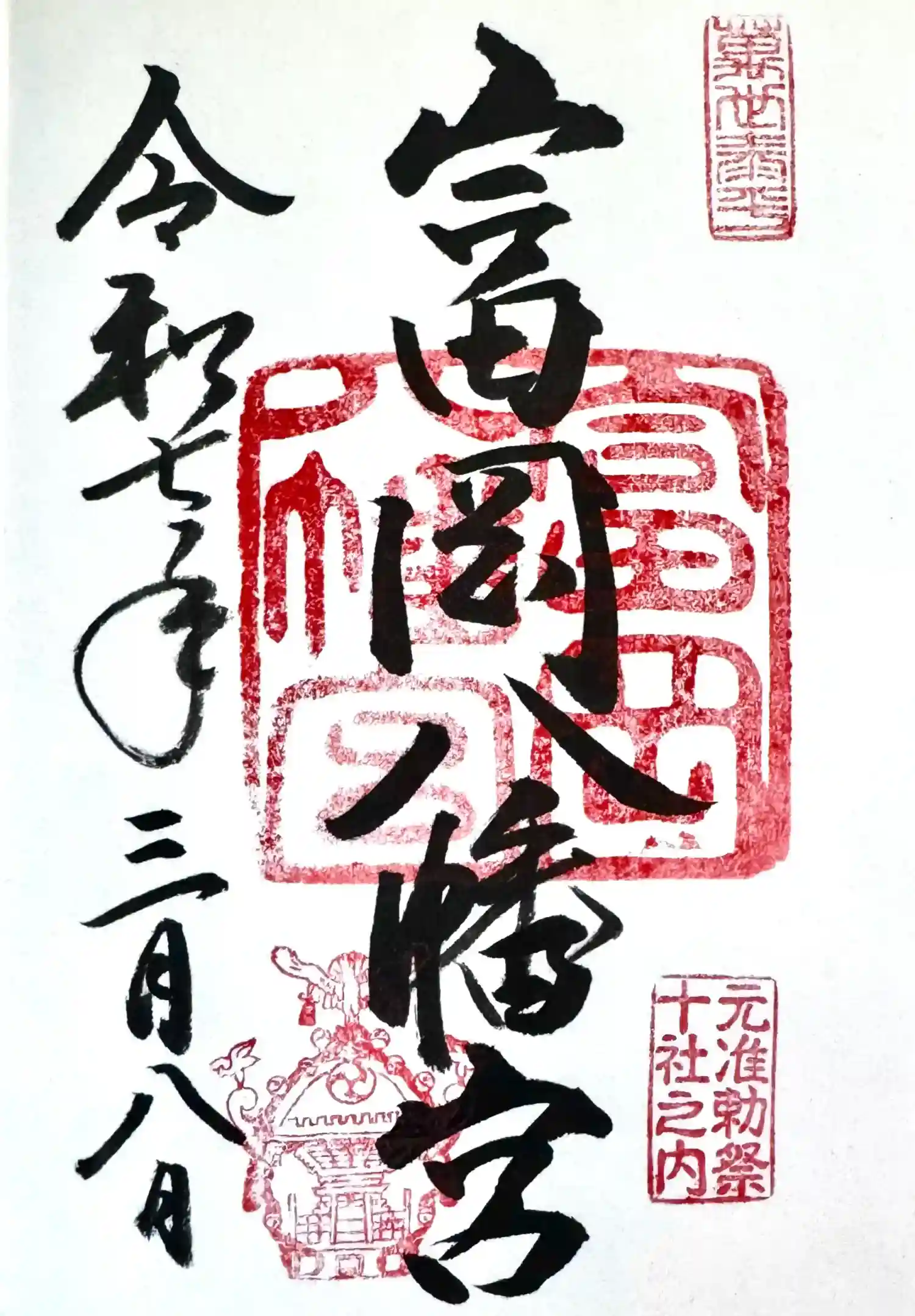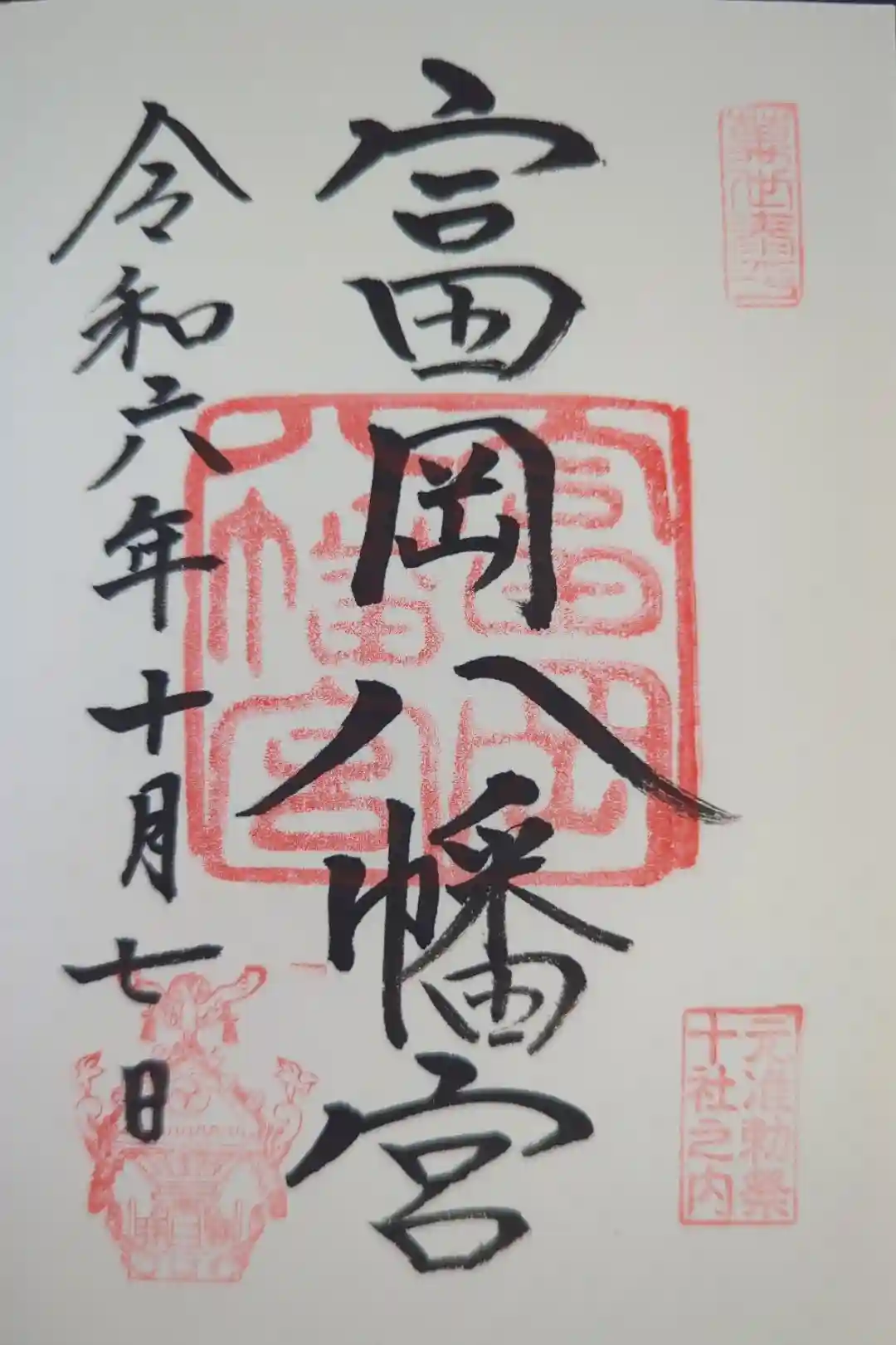 【通常】富岡八幡宮の御朱印には、左下に日本一の一宮神輿の印が押され、右下に東京十社(慶応三年の大政奉還の後に江戸城が皇居となり、明治天皇により東京の鎮護と万民の安寧を祈るために定められた元准勅祭社)の印が押されております。 | |||