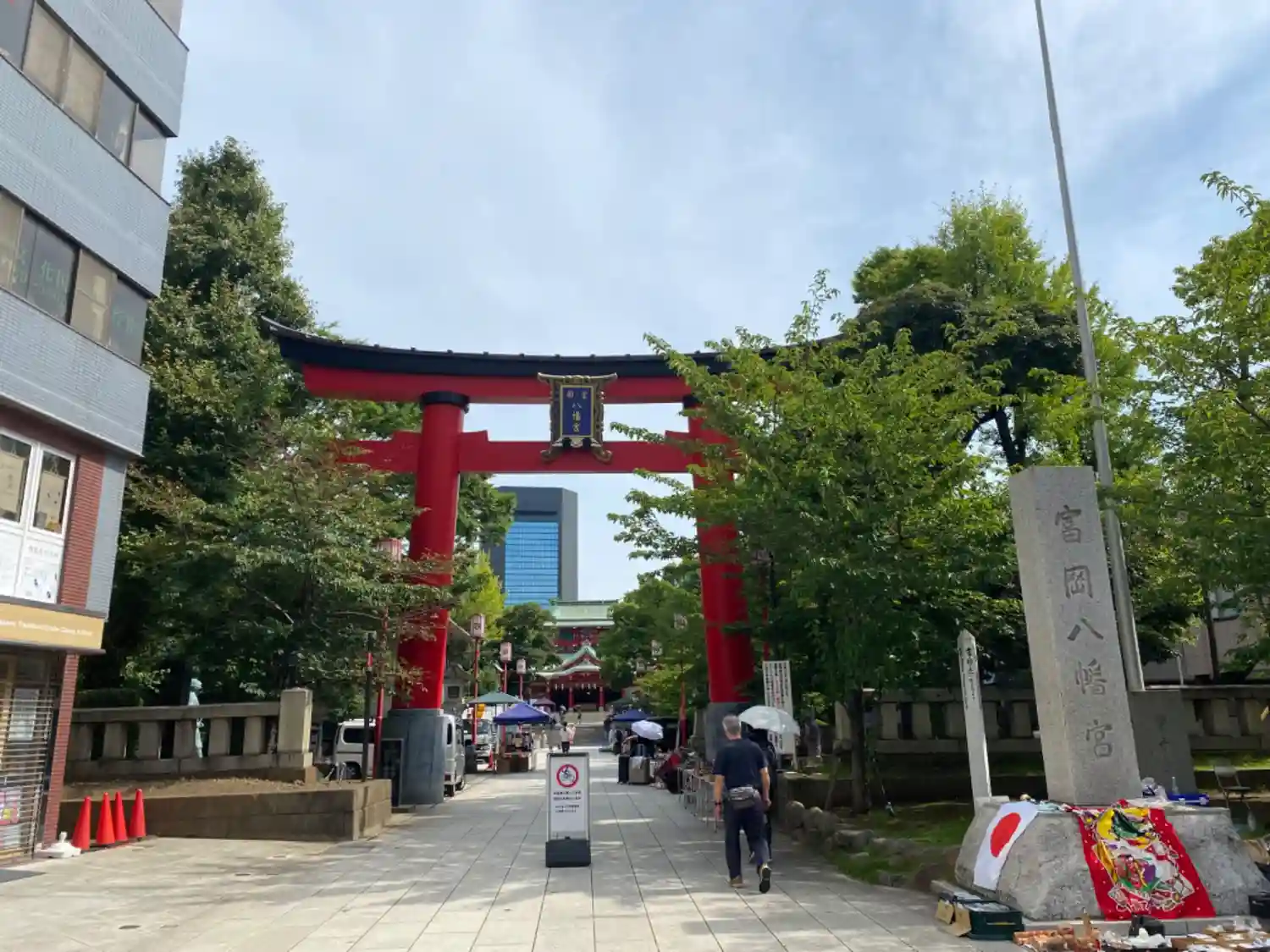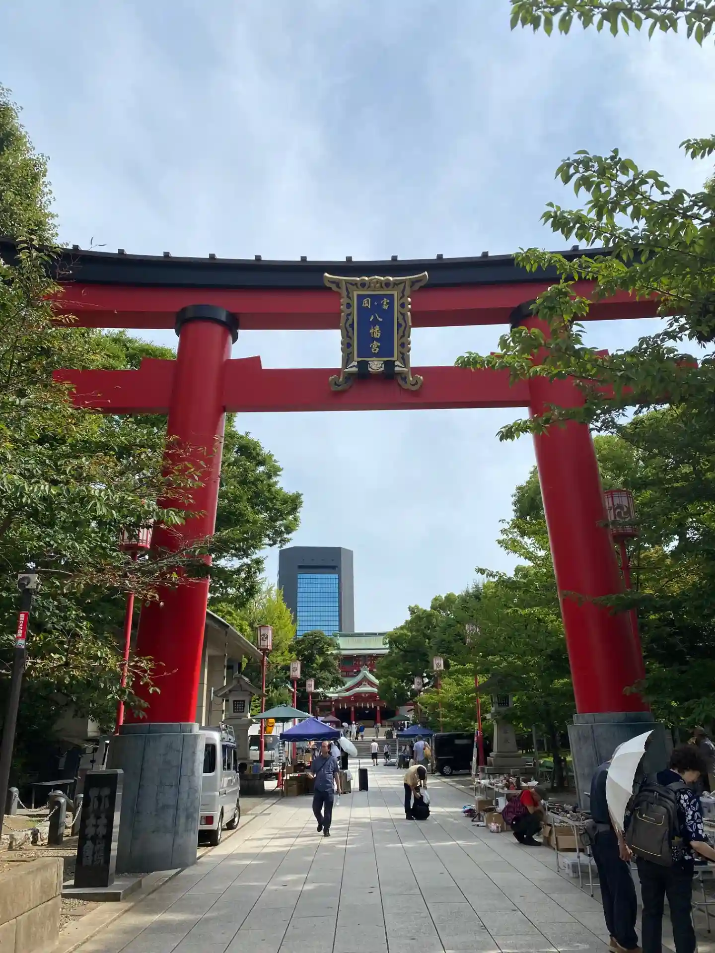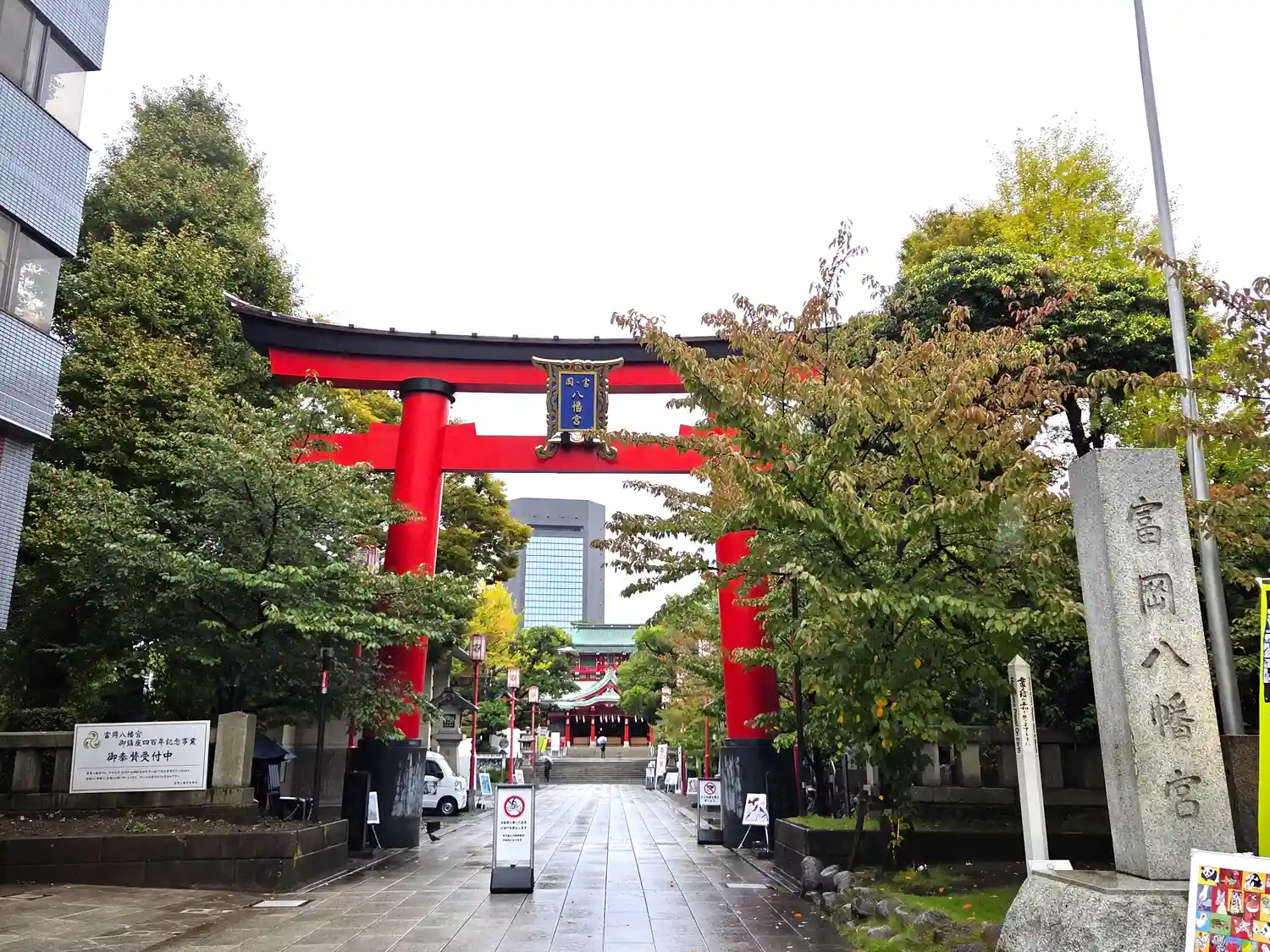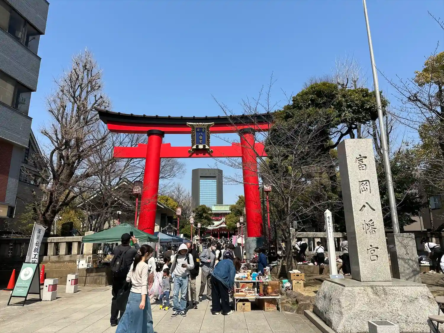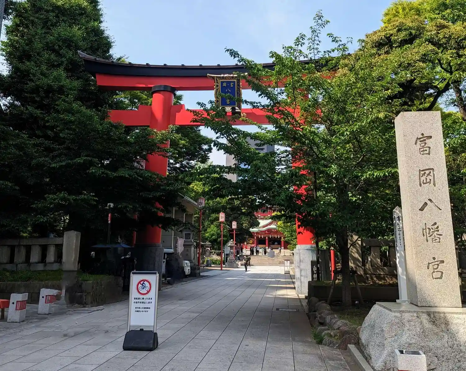 向かい側の道路から見える看板には深川八幡という別名と江戸最大の…