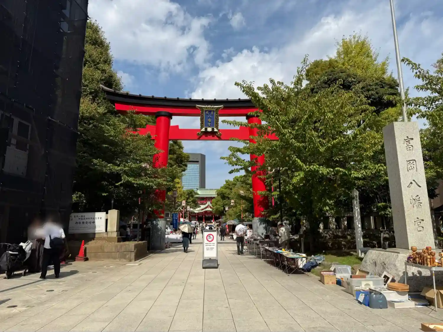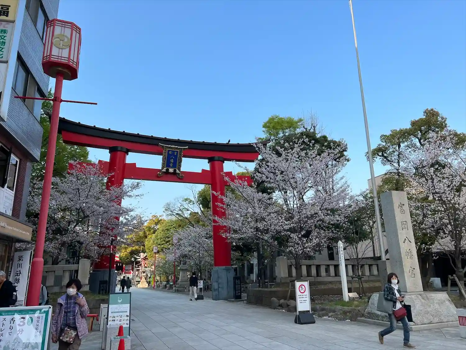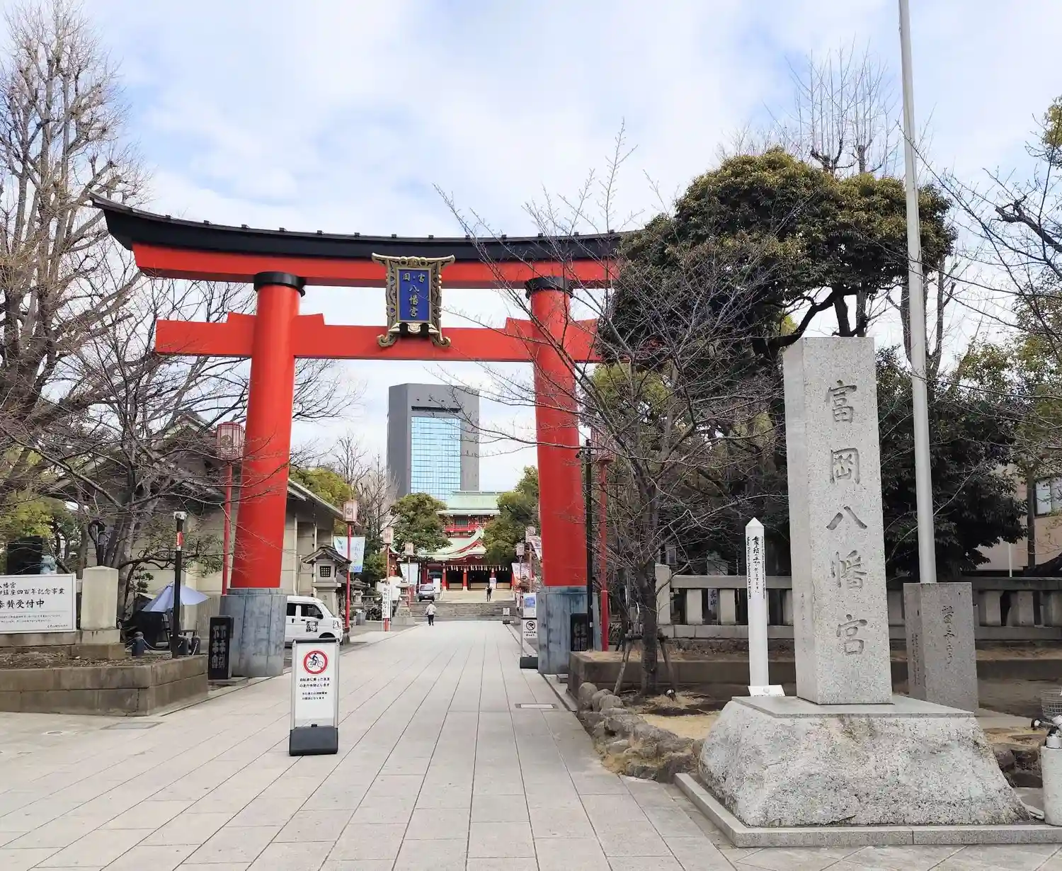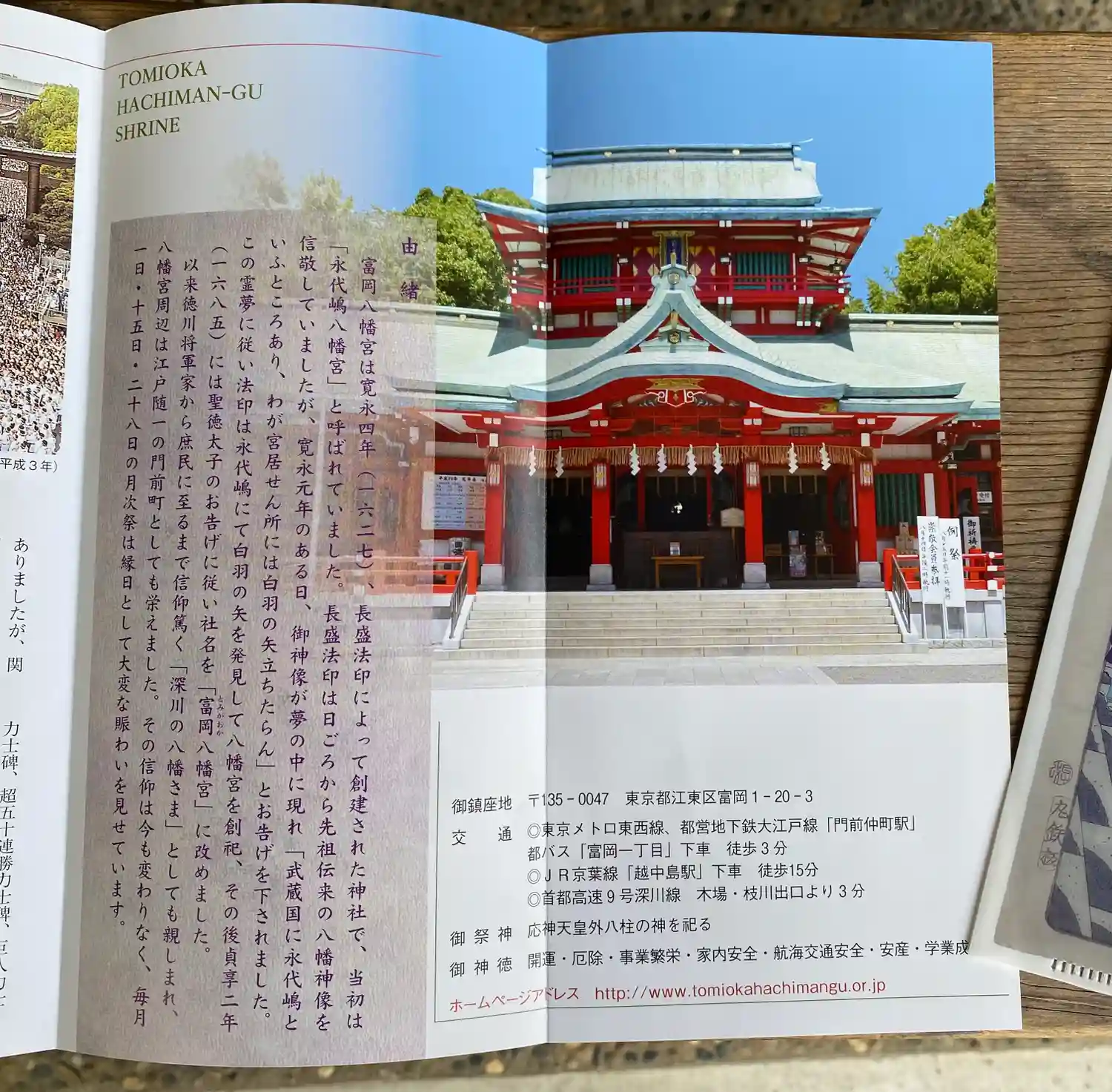 向かい側の道路から見える看板には深川八幡という別名と江戸最大の…
