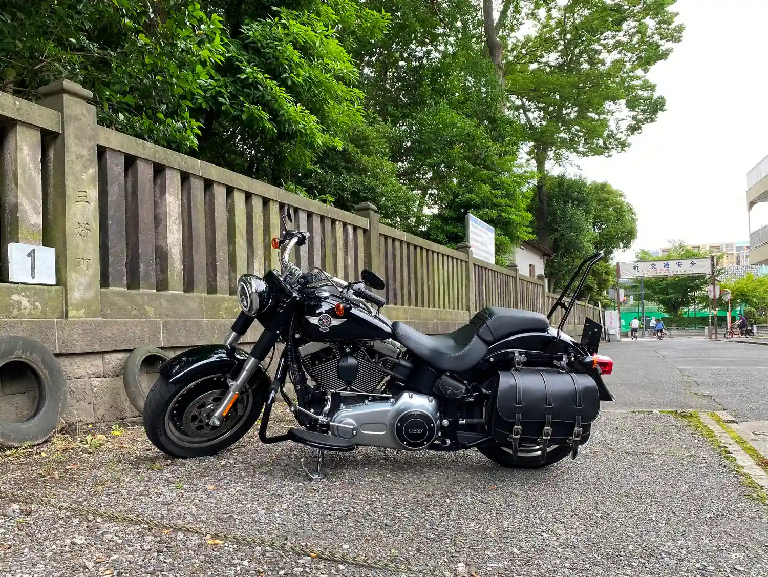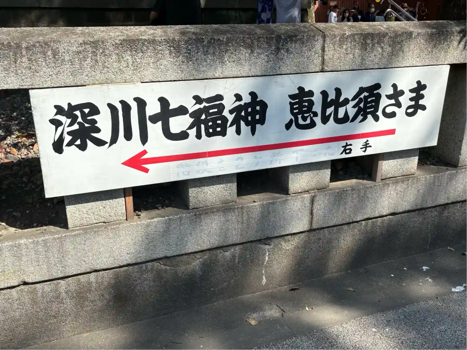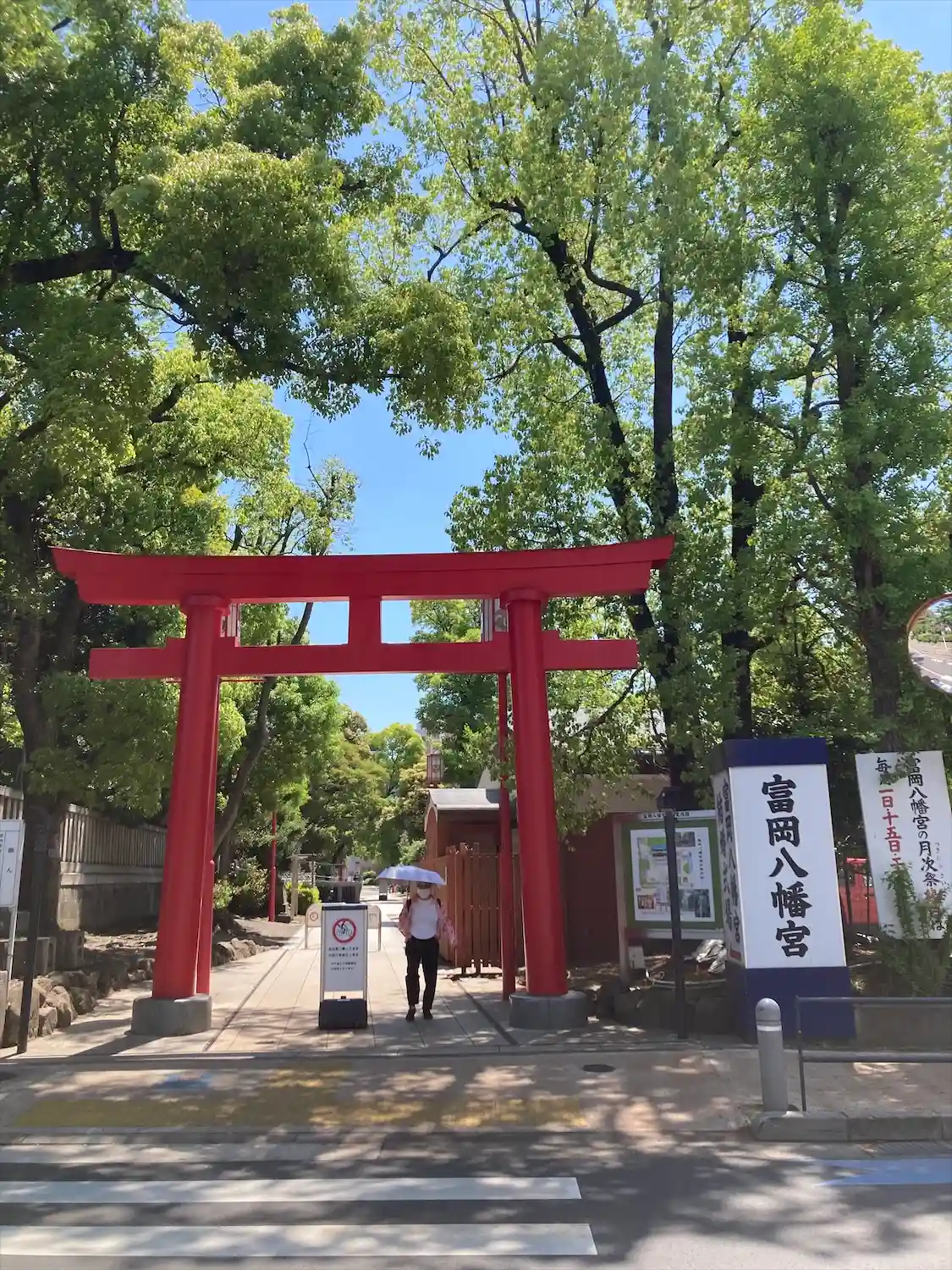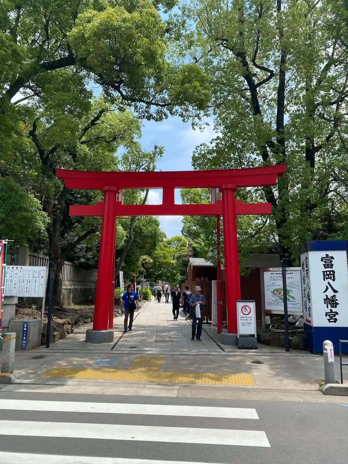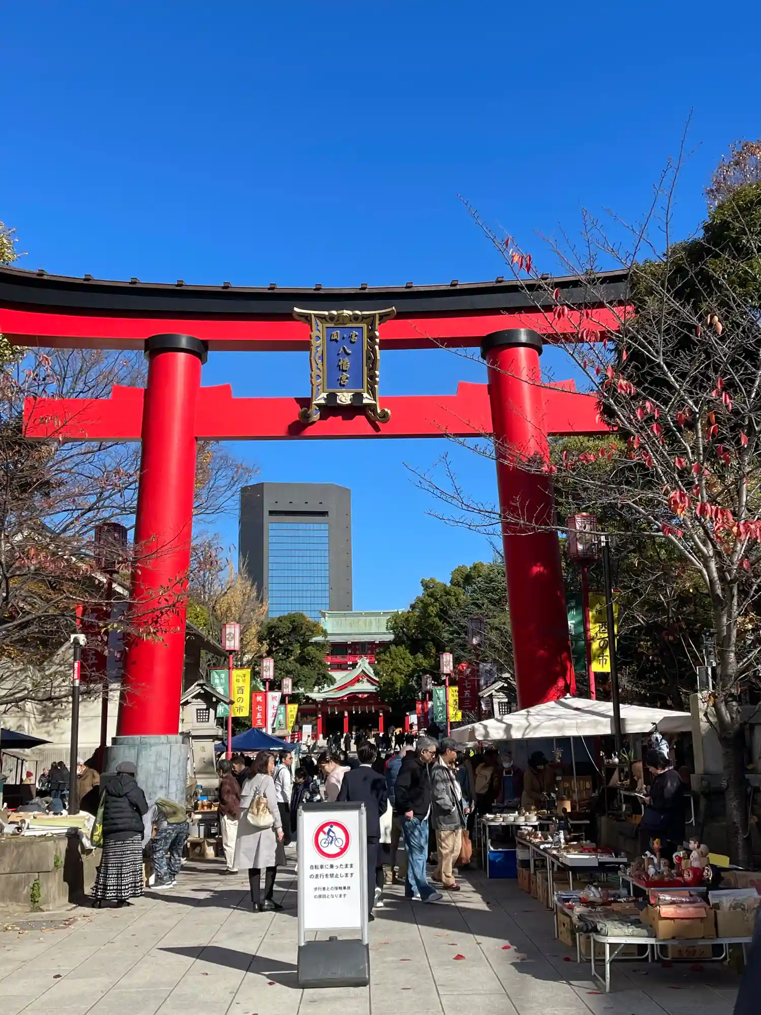 向かい側の道路から見える看板には深川八幡という別名と江戸最大の…