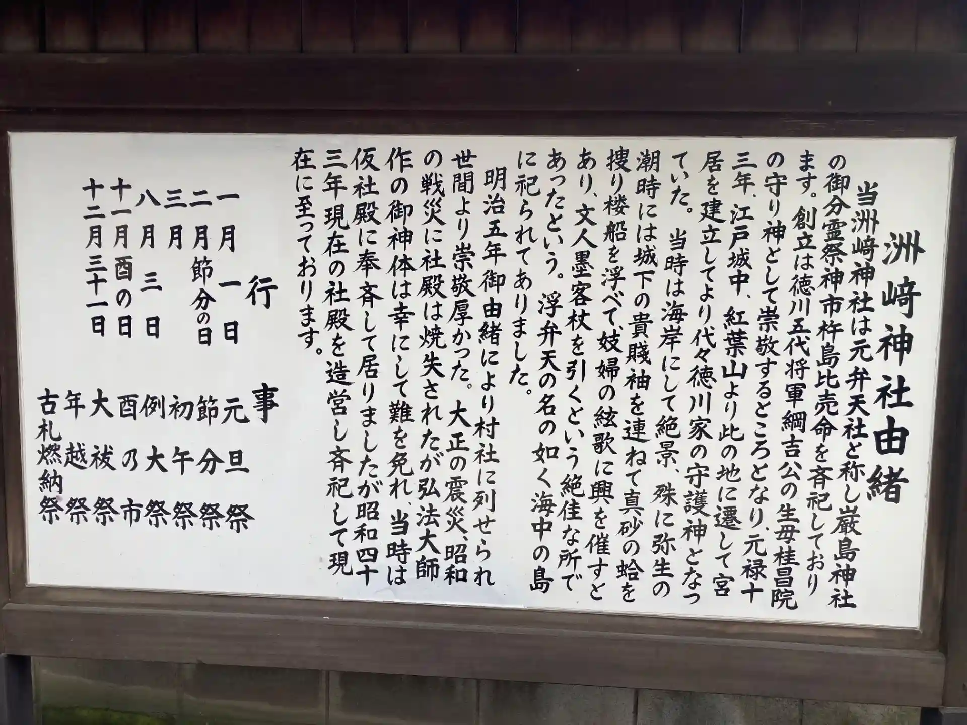 元禄十三年(1700)護持院の隆光大僧正の御尽力により、江戸城中紅葉山に五代将軍綱吉公の御生母桂昌院の守本尊である弁財天(弘法大師作)と稲荷社を祀り洲崎弁天社と称した。以来、当社は江戸の観光名所として栄え、明治の神仏分離の際に洲崎神社と改める。
