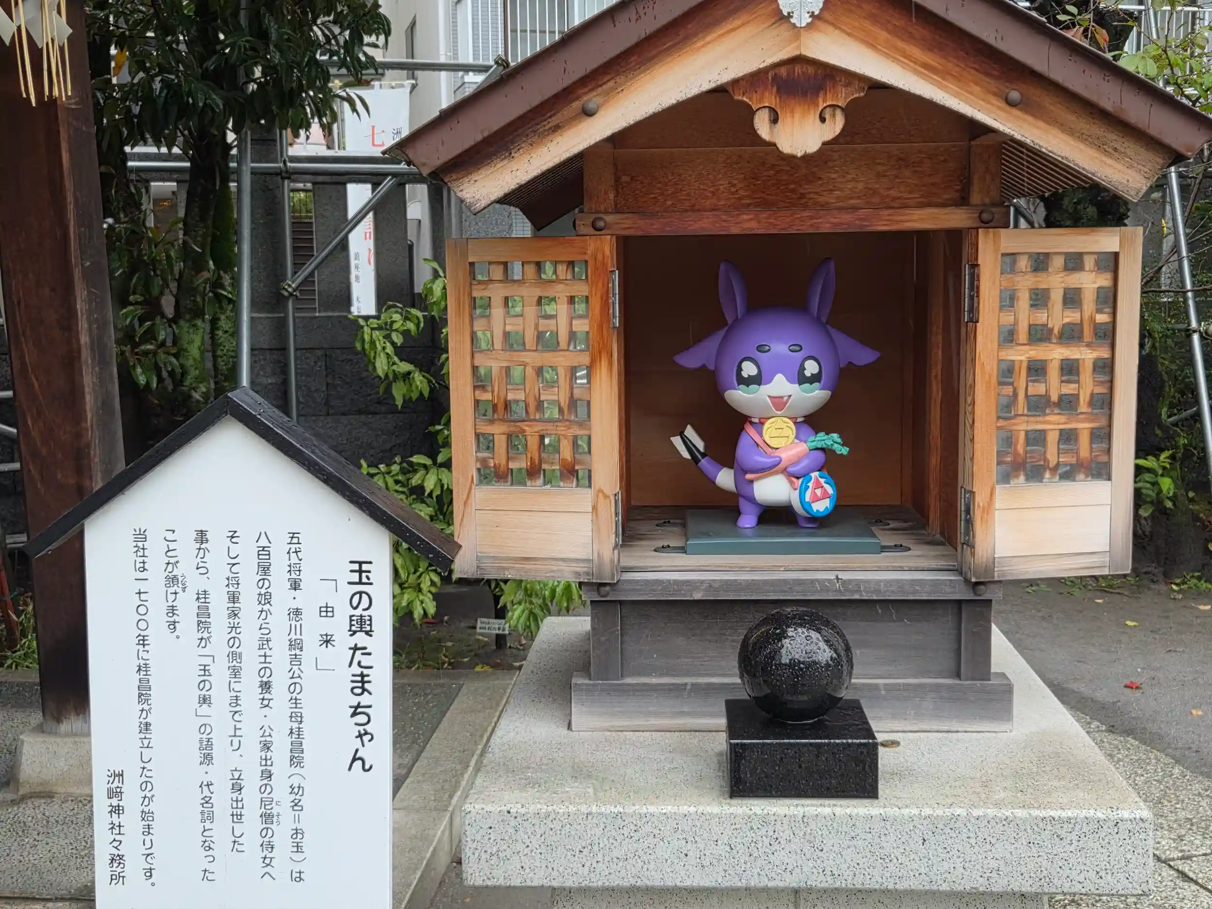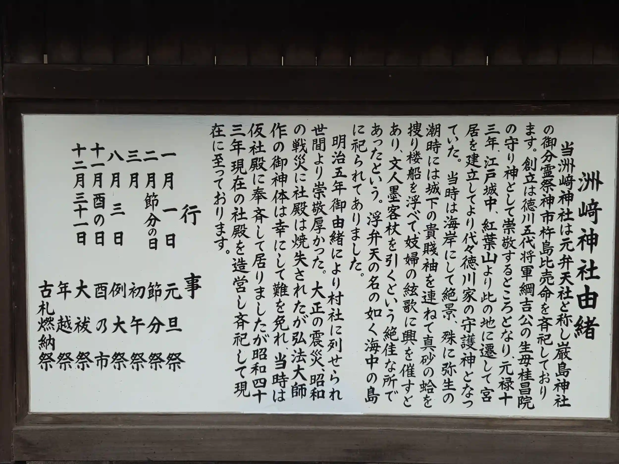 「創立は徳川五代将軍綱吉公の生母桂昌院の守神として崇敬するところとなり、元禄十三年江戸城中紅葉山より、此の地に遷して宮居を建立してより代々徳川家の守護神となっておりました。