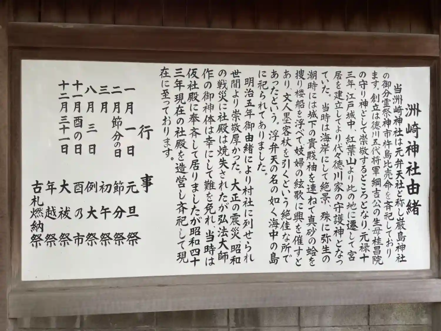 | ご由緒 | 元禄13年(1700)護持院隆光大僧正のご尽力により、江戸城中紅葉山に五代将軍綱吉公の御生母桂昌院の守本尊である弁財天(弘法大師作)と稲荷社を祀り洲﨑弁天社と称した。以来当社は江戸の観光名所として栄え、明治の神仏分離の際洲﨑神社と改める。 |