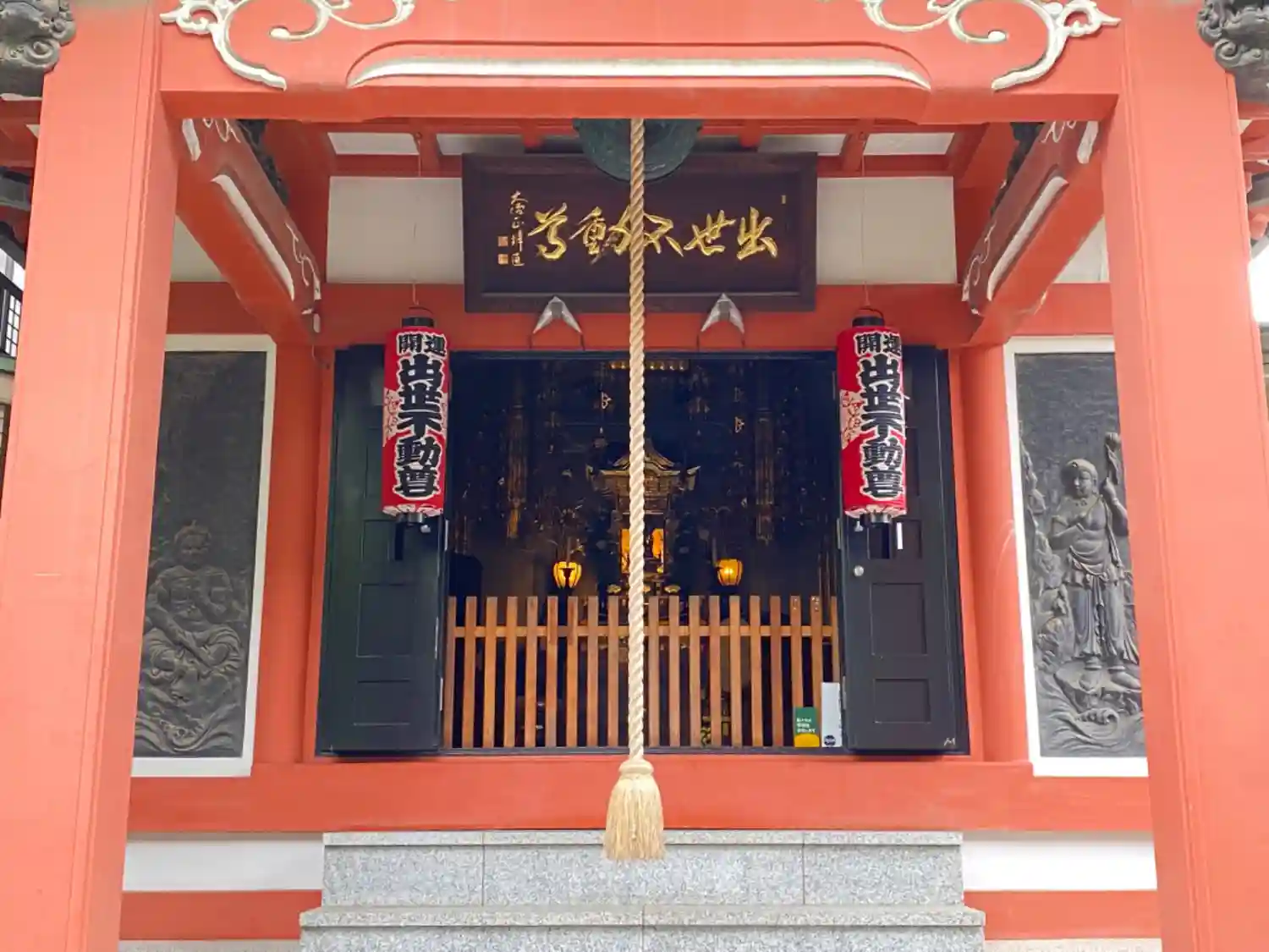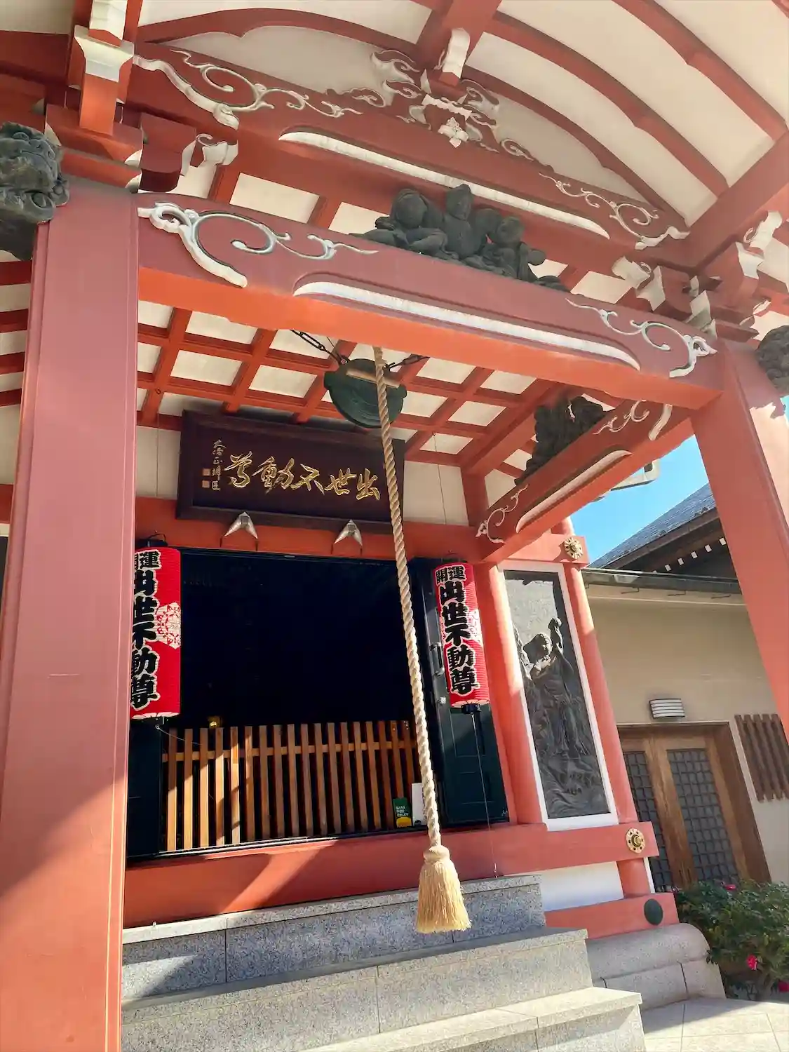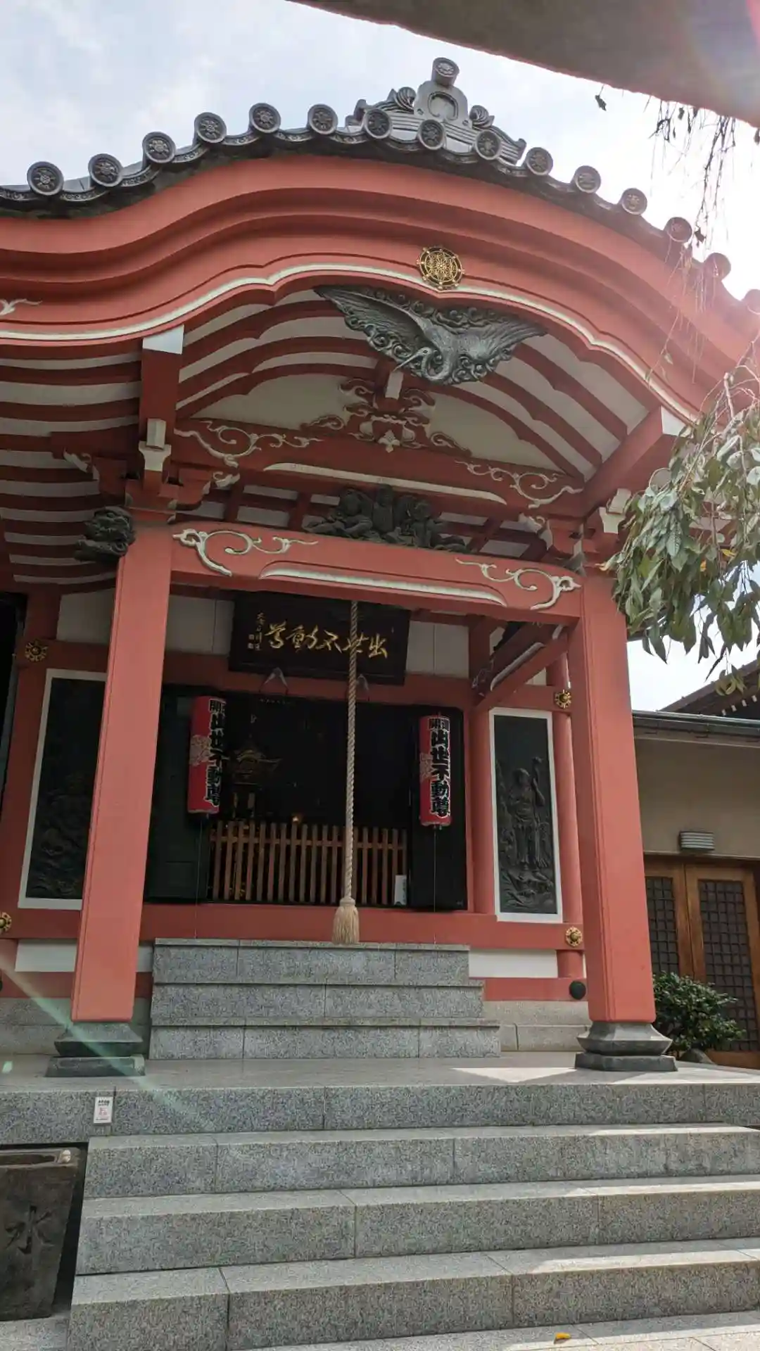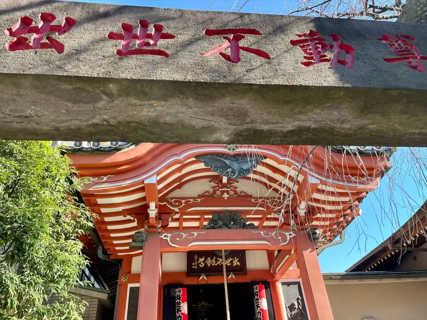 「出世不動尊」の赤い文字。赤いお堂が不動堂です。