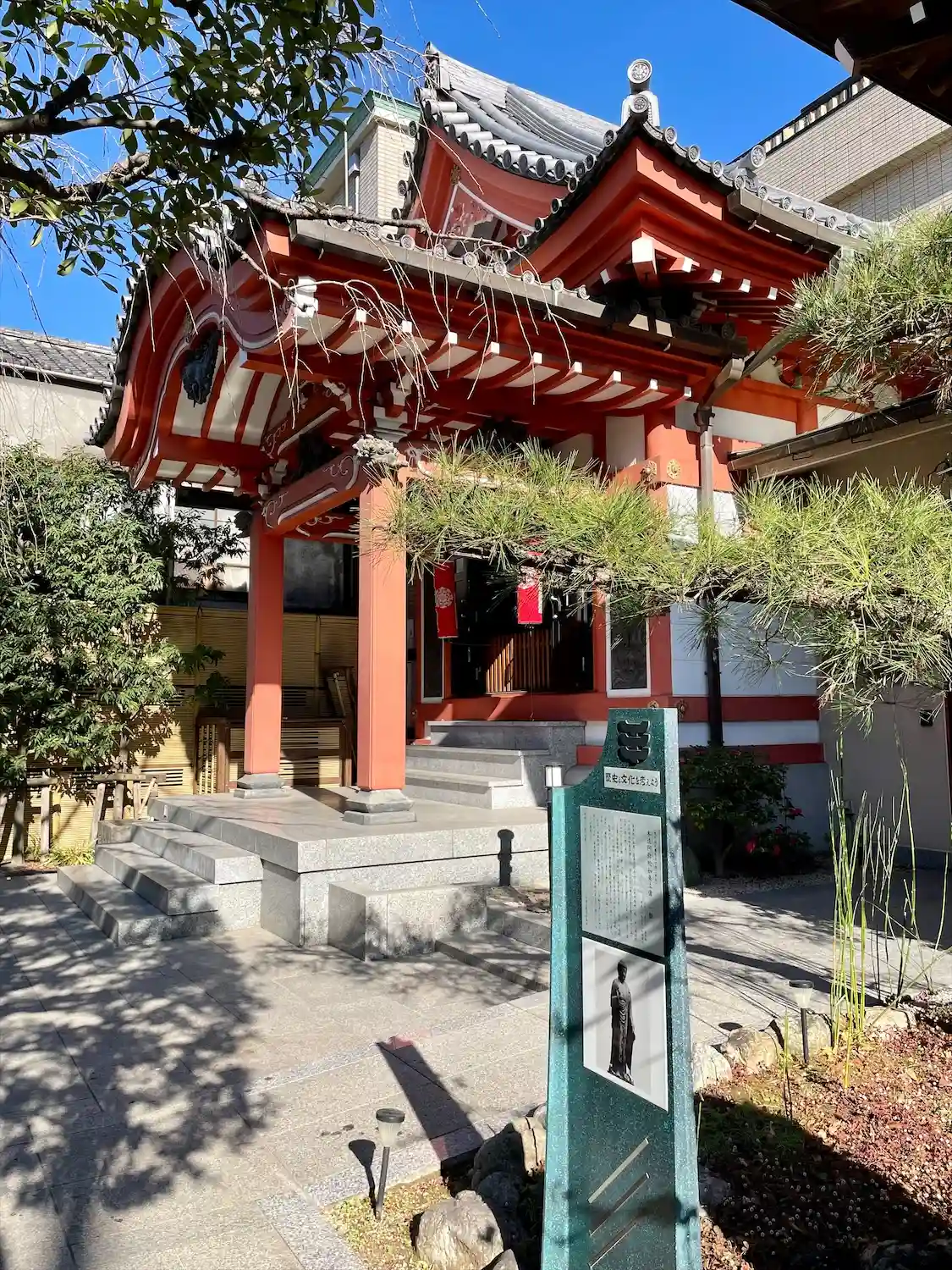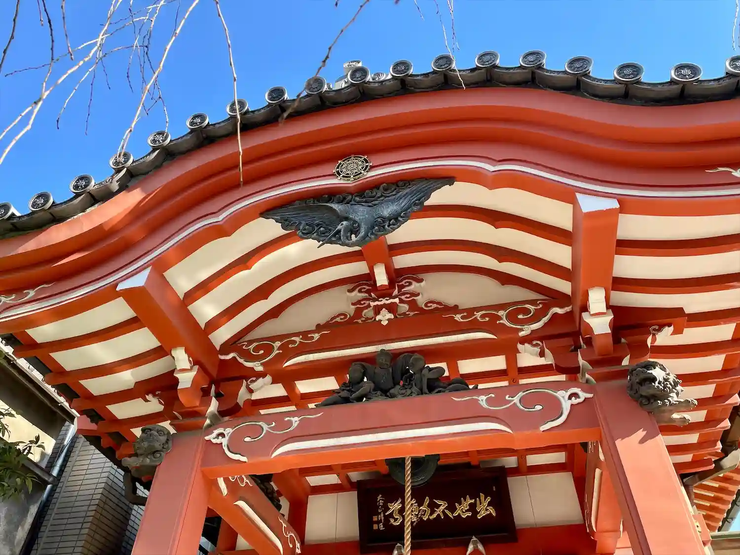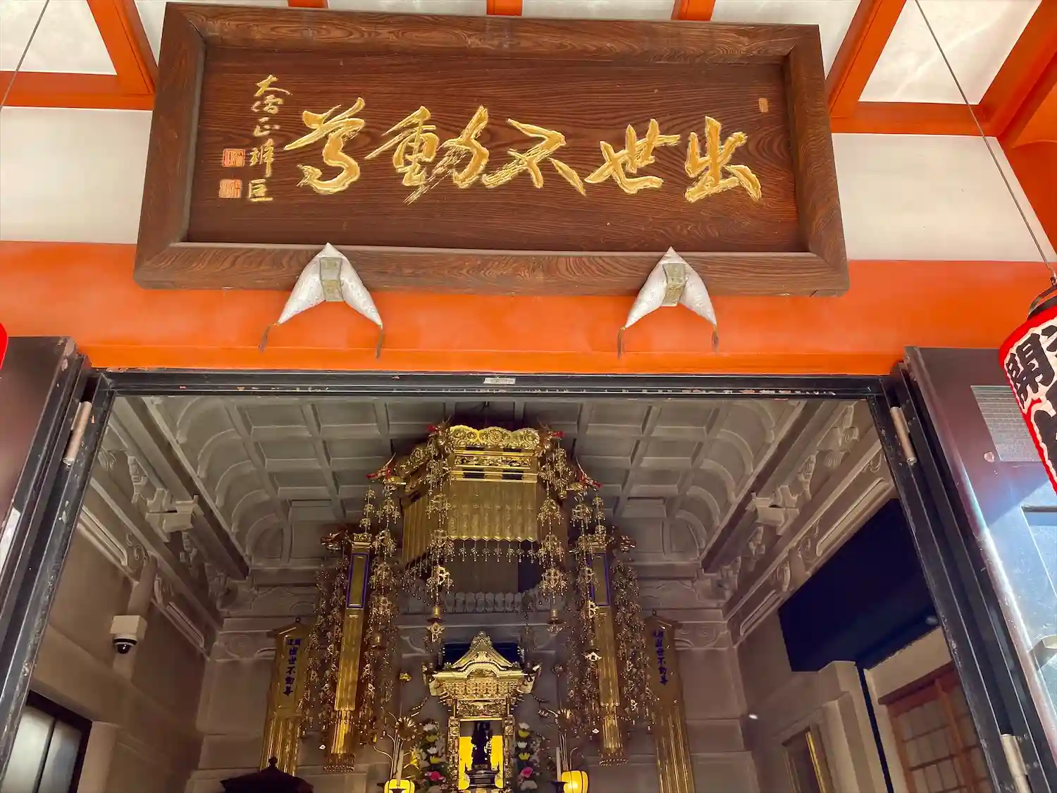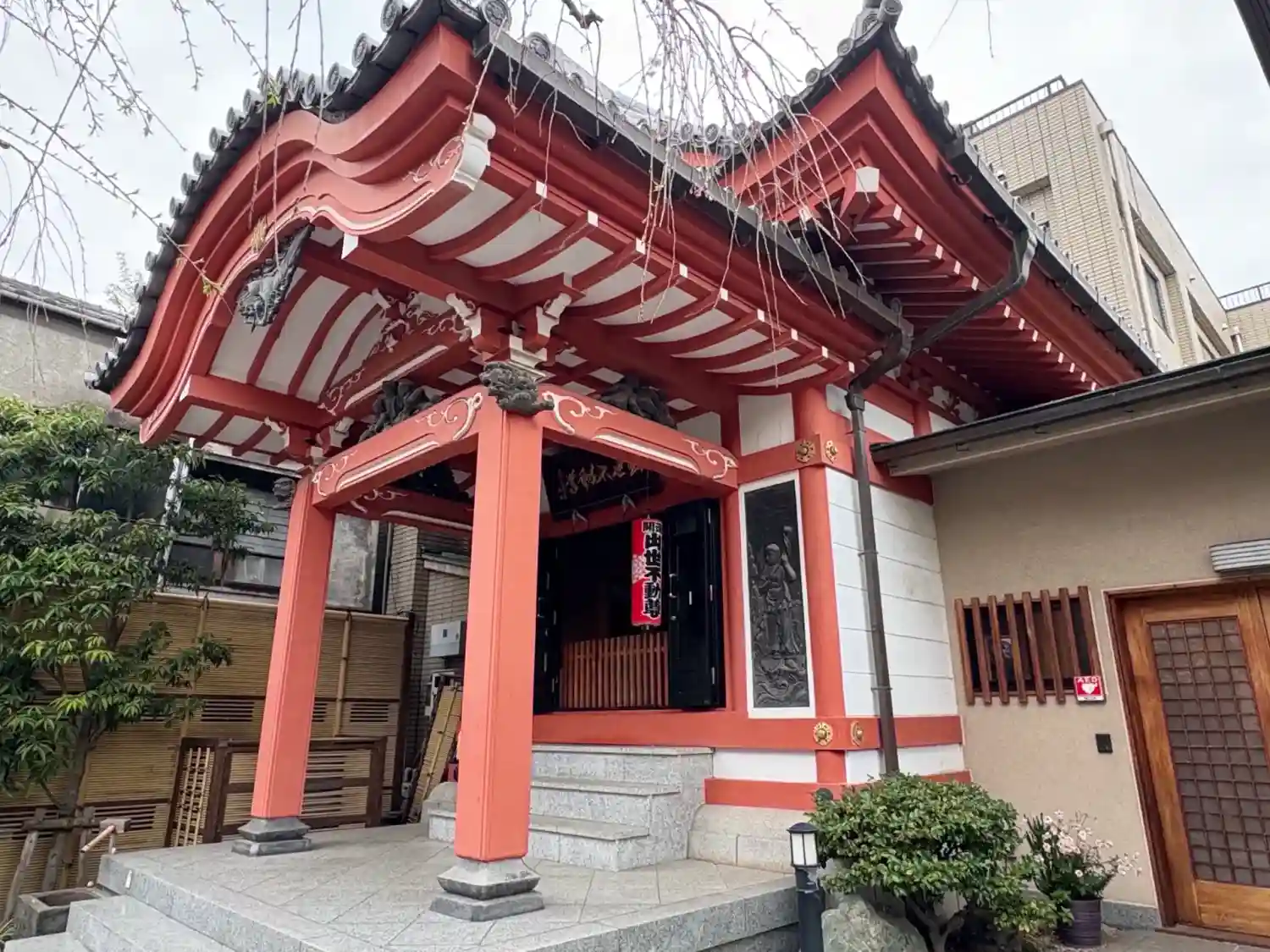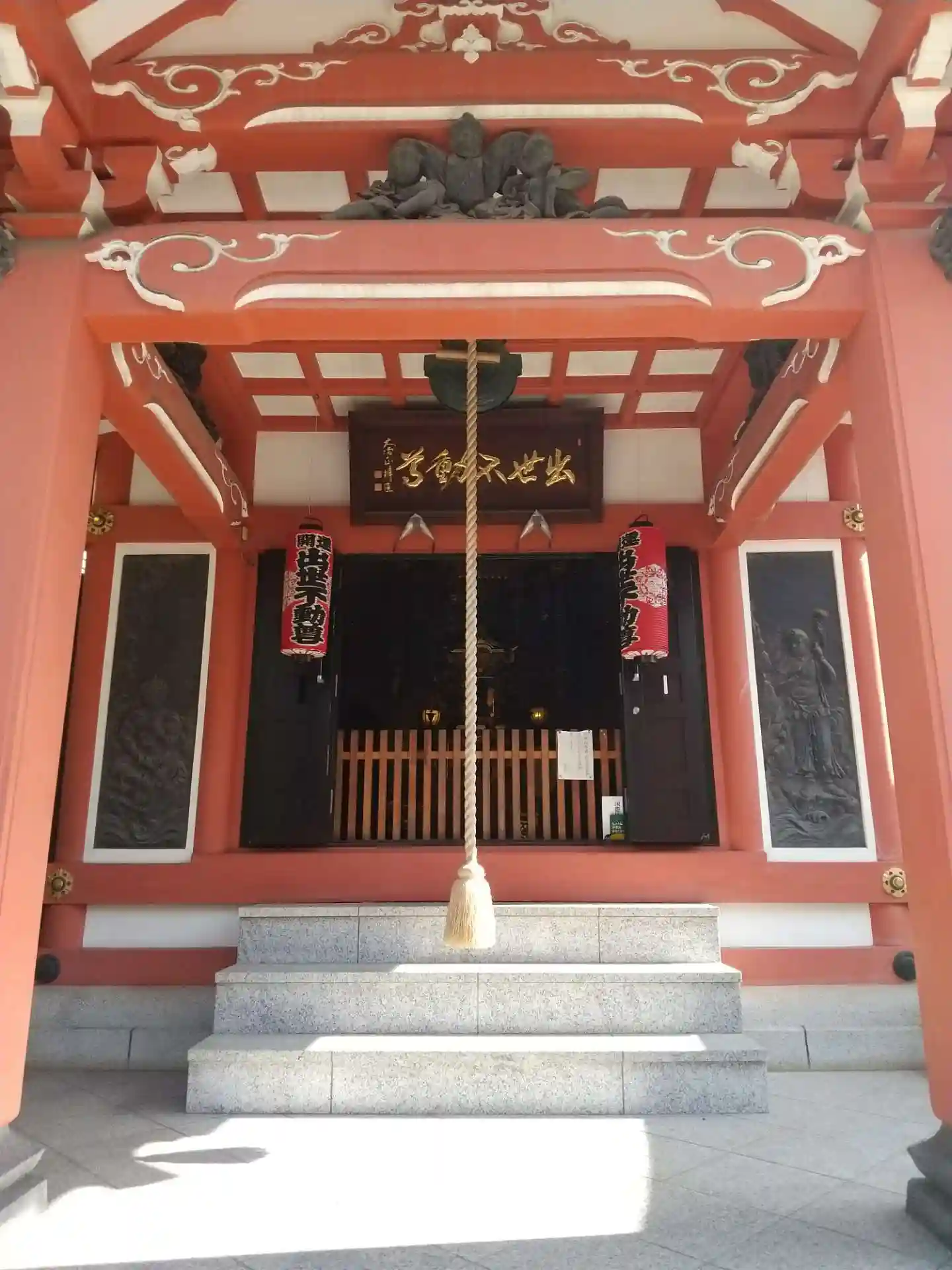 「出世不動尊」の赤い文字。赤いお堂が不動堂です。
