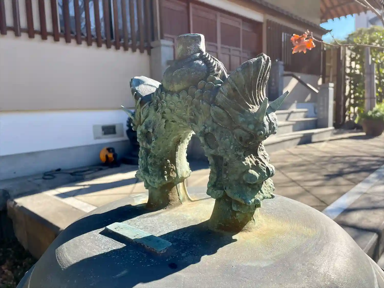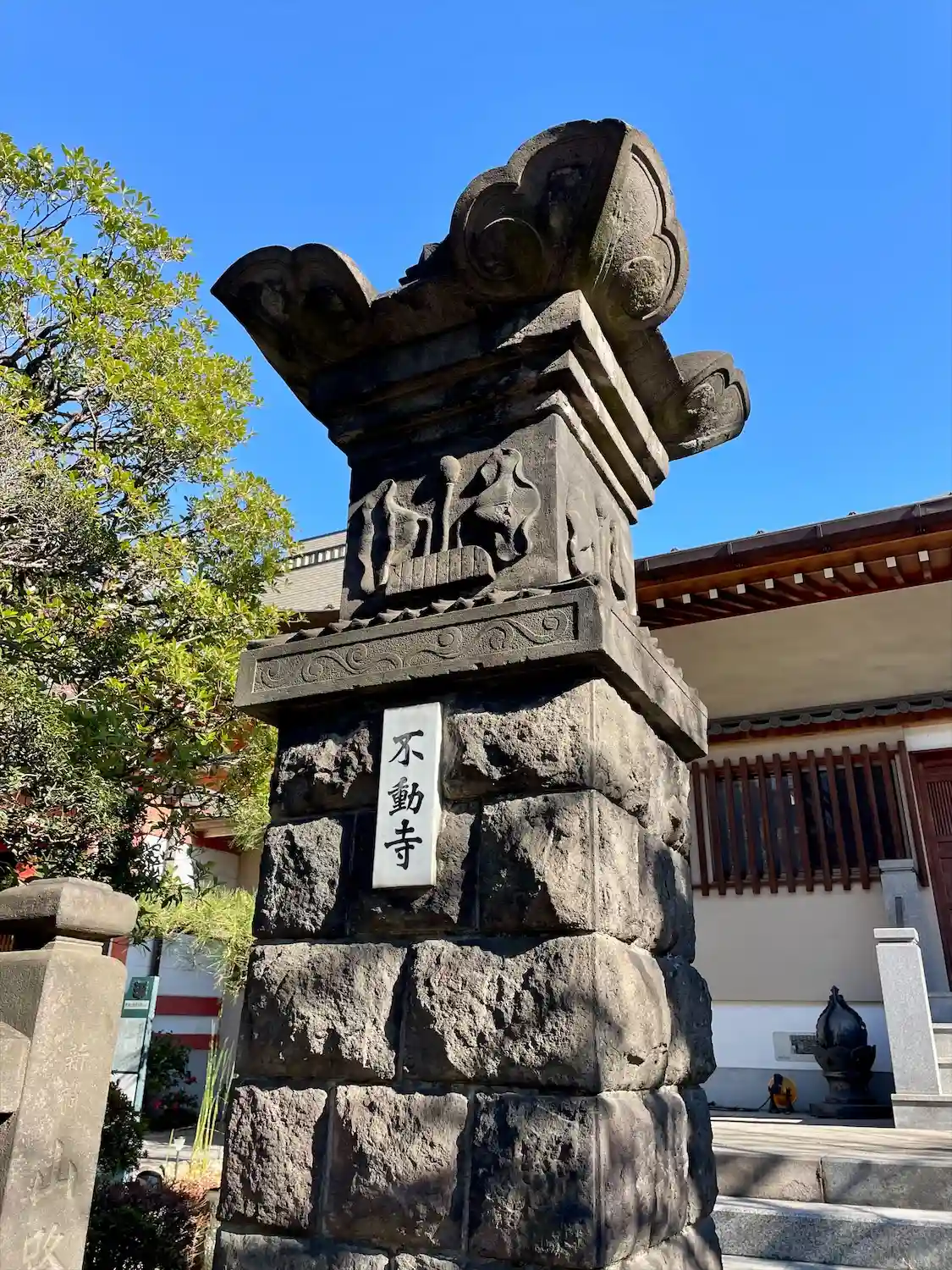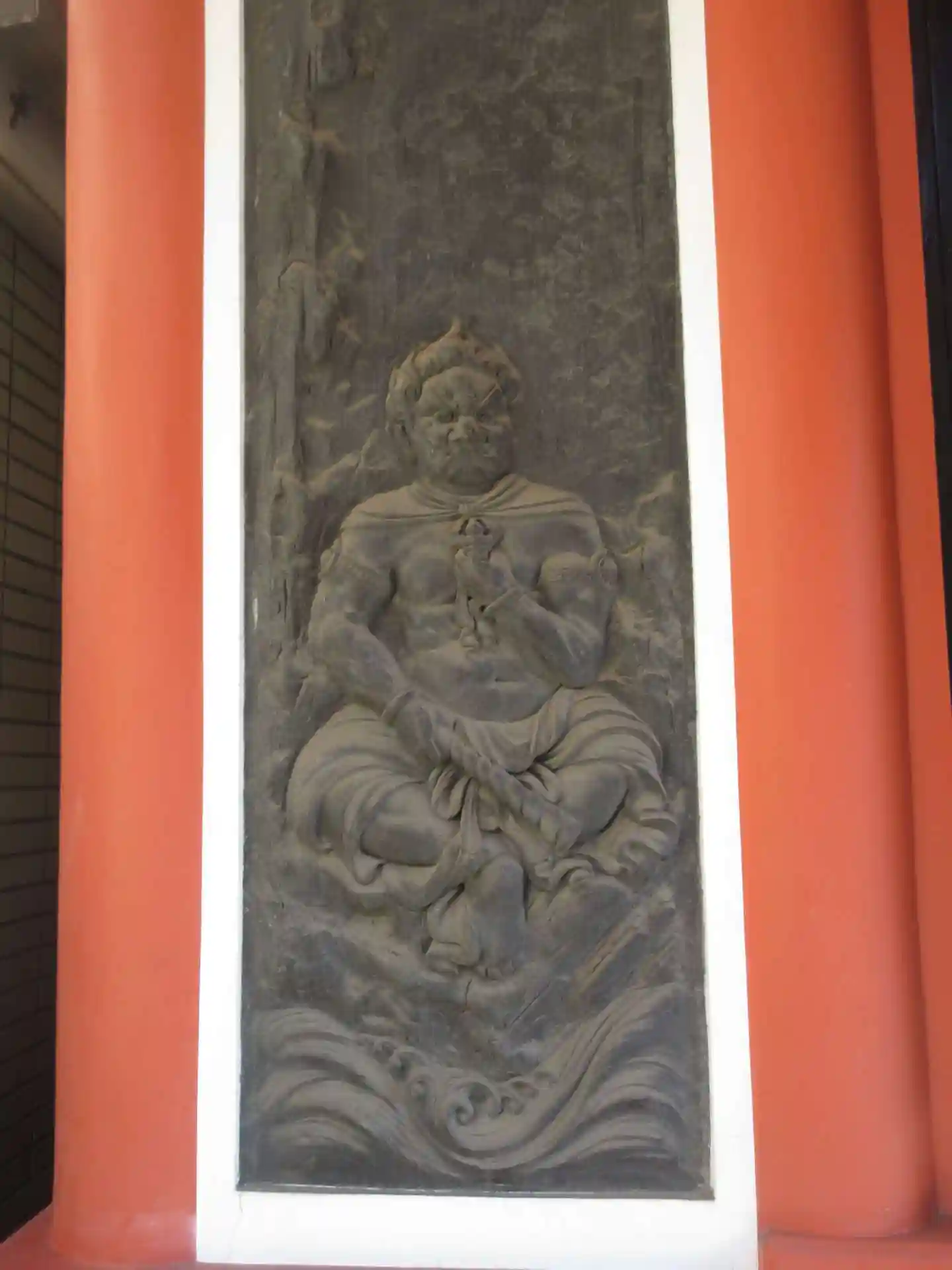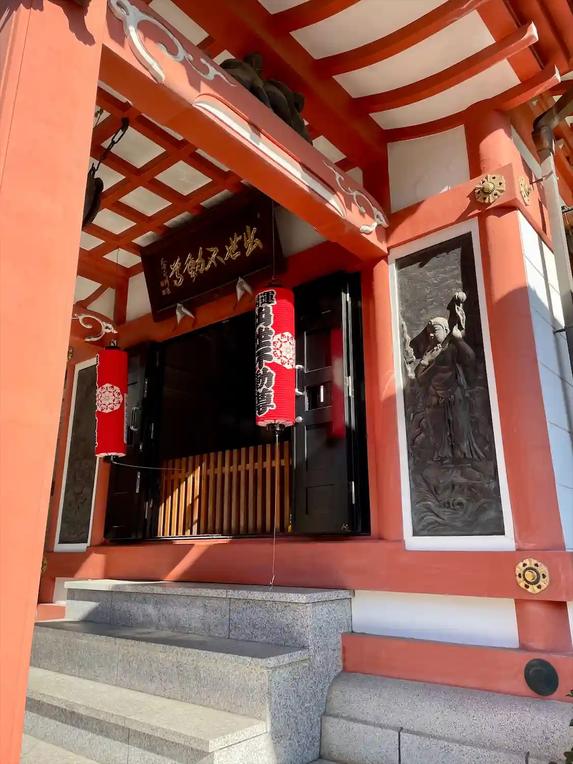 不動堂の入り口にある不動明王と童子(矜羯羅童子かな?)のレリーフ。