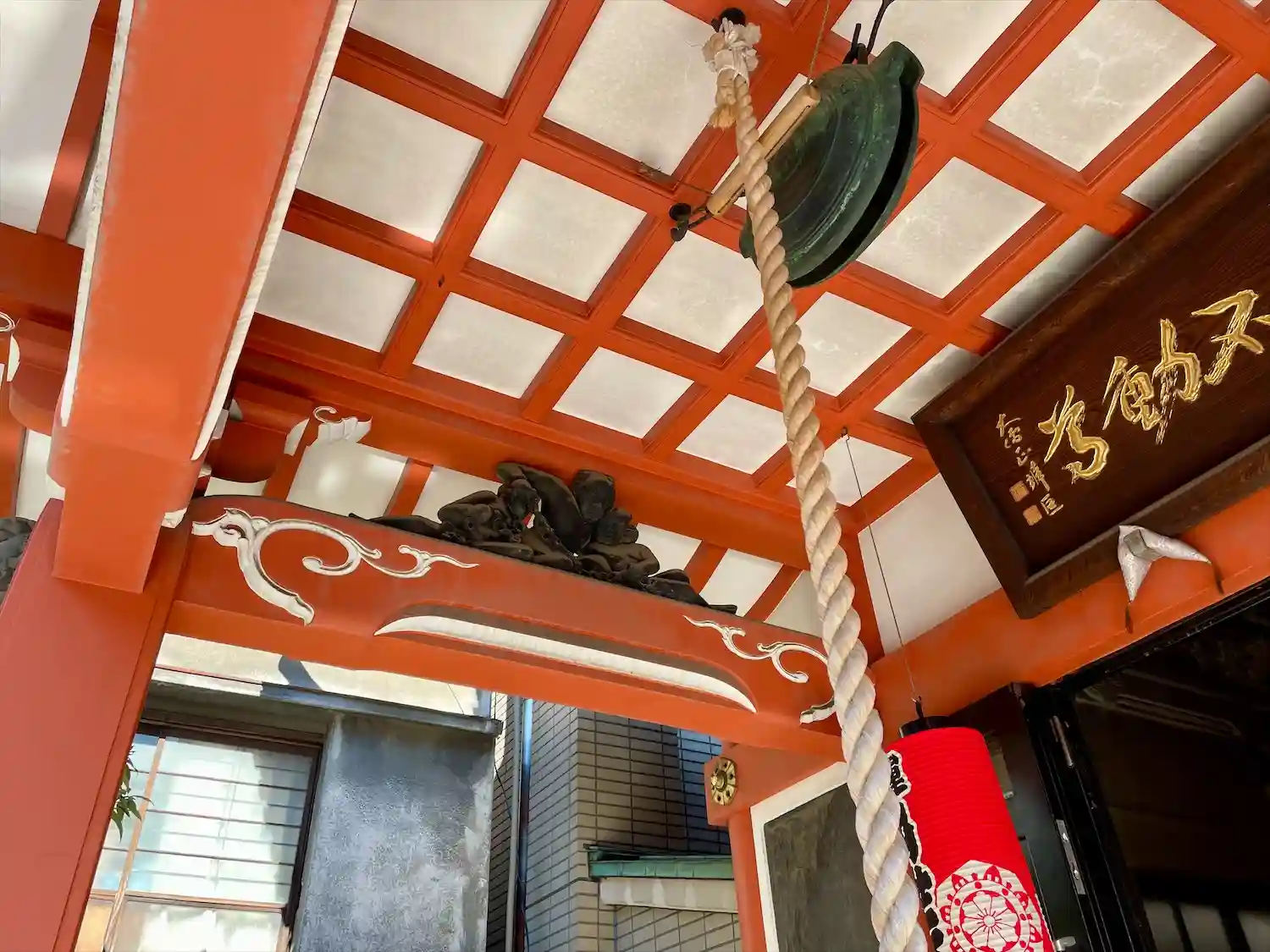 住宅街にある赤い建物のお寺です。