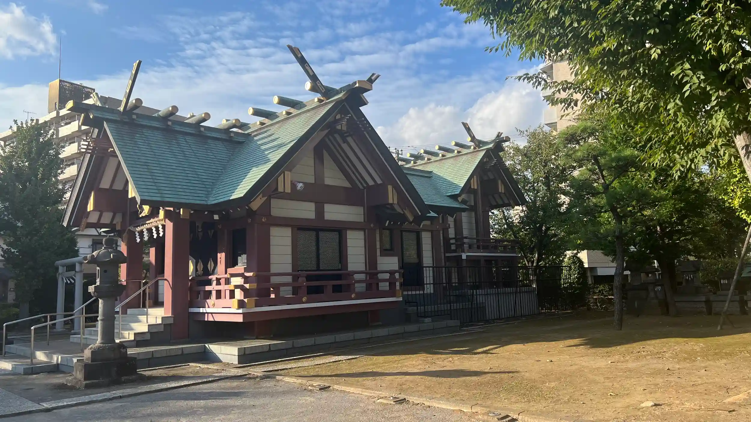 その後、平成元年(1989年)の区画整理事業に伴い、社地を現在の地に移しました。遷座の折に社殿は新しく八幡造で造営され、落ち着いた色調が印象的です。同時に新築された社務所も社殿と調和した基本色で仕上げられており、境内全体が統一感のある景観を見せています。社殿前はゆったりとした広さが確保され、祭礼や地域行事を執り行うのにも十分な空間となっています。