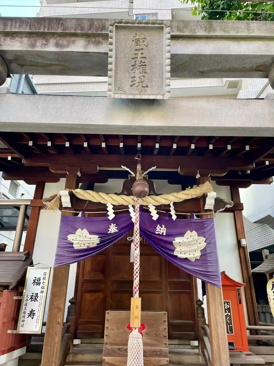 権現台の鎮守として「大井権現台」の地名の由来となった神社で、移転を重ね、現在はビルに囲まれた立会道路沿いに鎮座している。