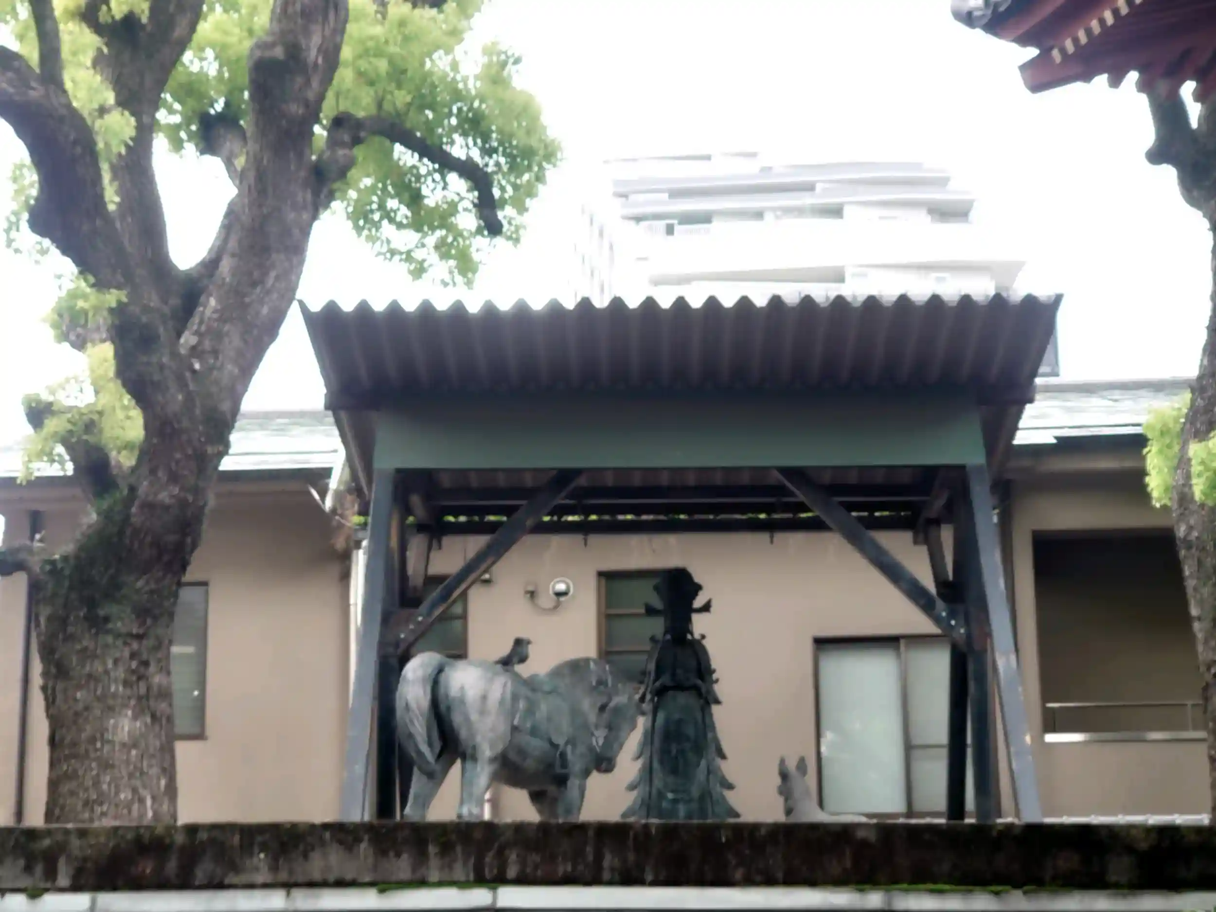 また、境内を散策していて車庫の屋根の上にある大きな仏様や馬の石像が気になったので質問してみたところ、それは馬頭観音様で、戦争でつれていかれ最終的に食べられてしまった動物達の供養のため、動物愛護のために造立されたものになるとのことでした。