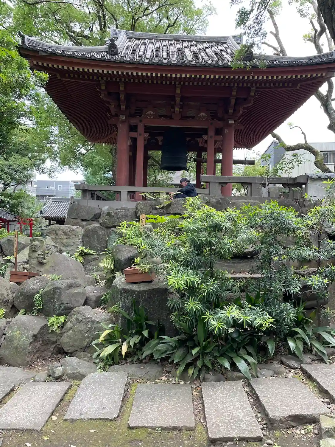小山の上に建つ<鐘楼>。小山の周りには、七福神の小さな石像がばらばらの場所に置いてある。探すと楽しい。