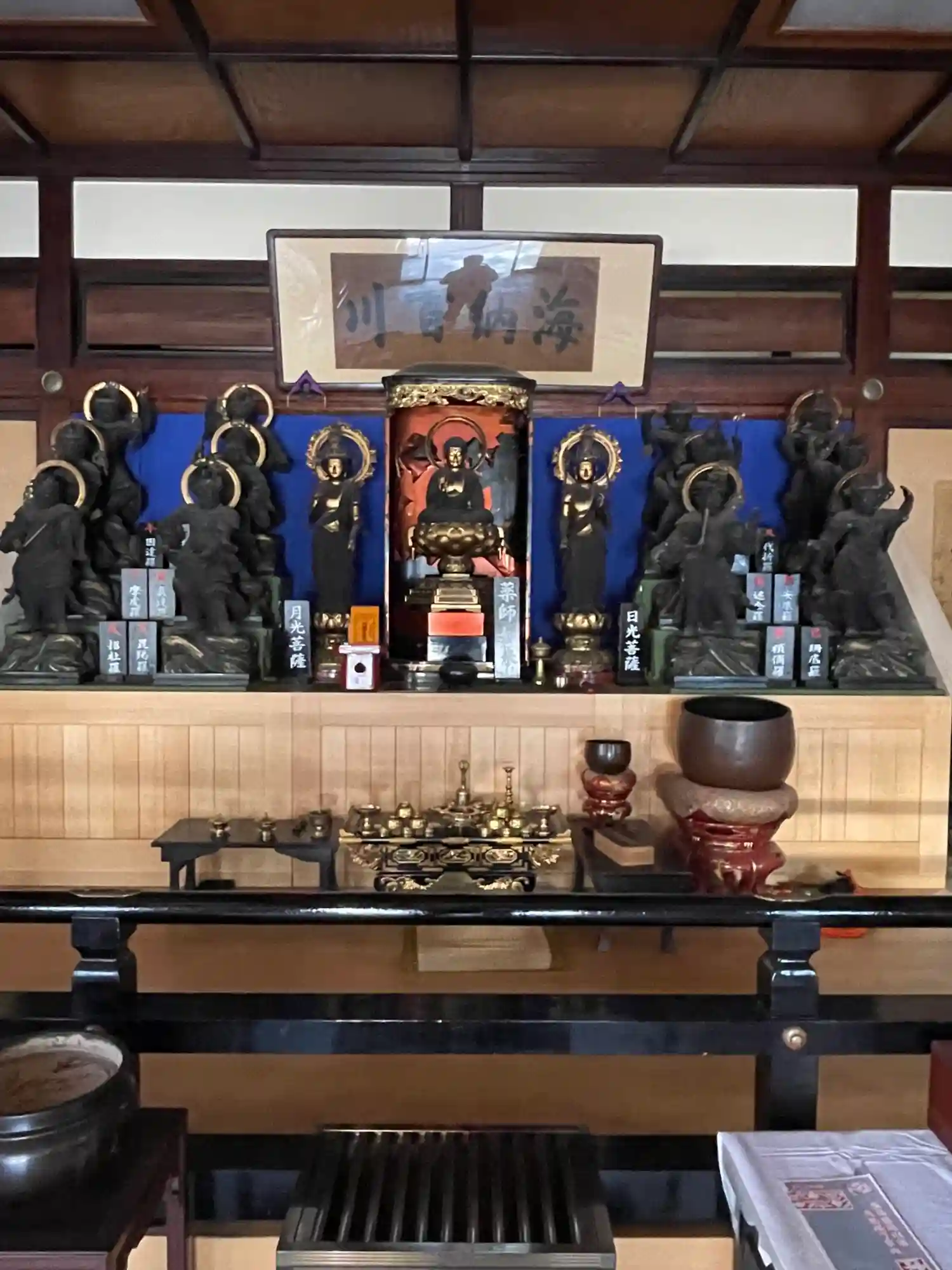 この日はたまたま<毘沙門天王 新春御開帳>を開催していて、薬師堂に入ると毘沙門天像がぞろっと20体ほど並んでいた。お坊さんによると、普段は観音堂で観音様の脇に立っていて遠目にしか見えない毘沙門天像を間近で見られるようにしたとのこと。