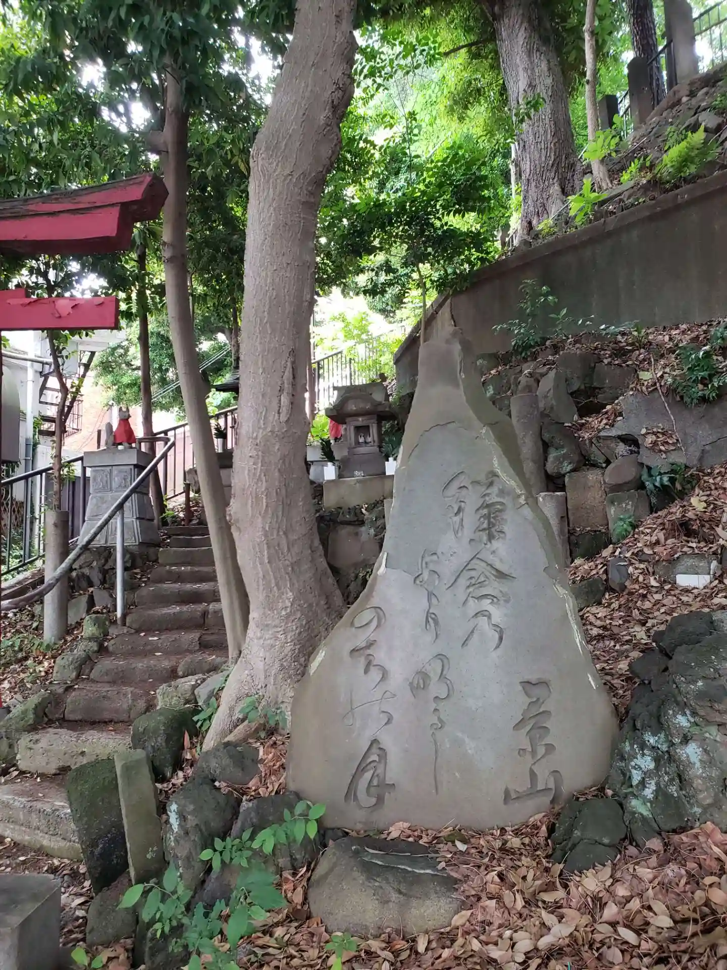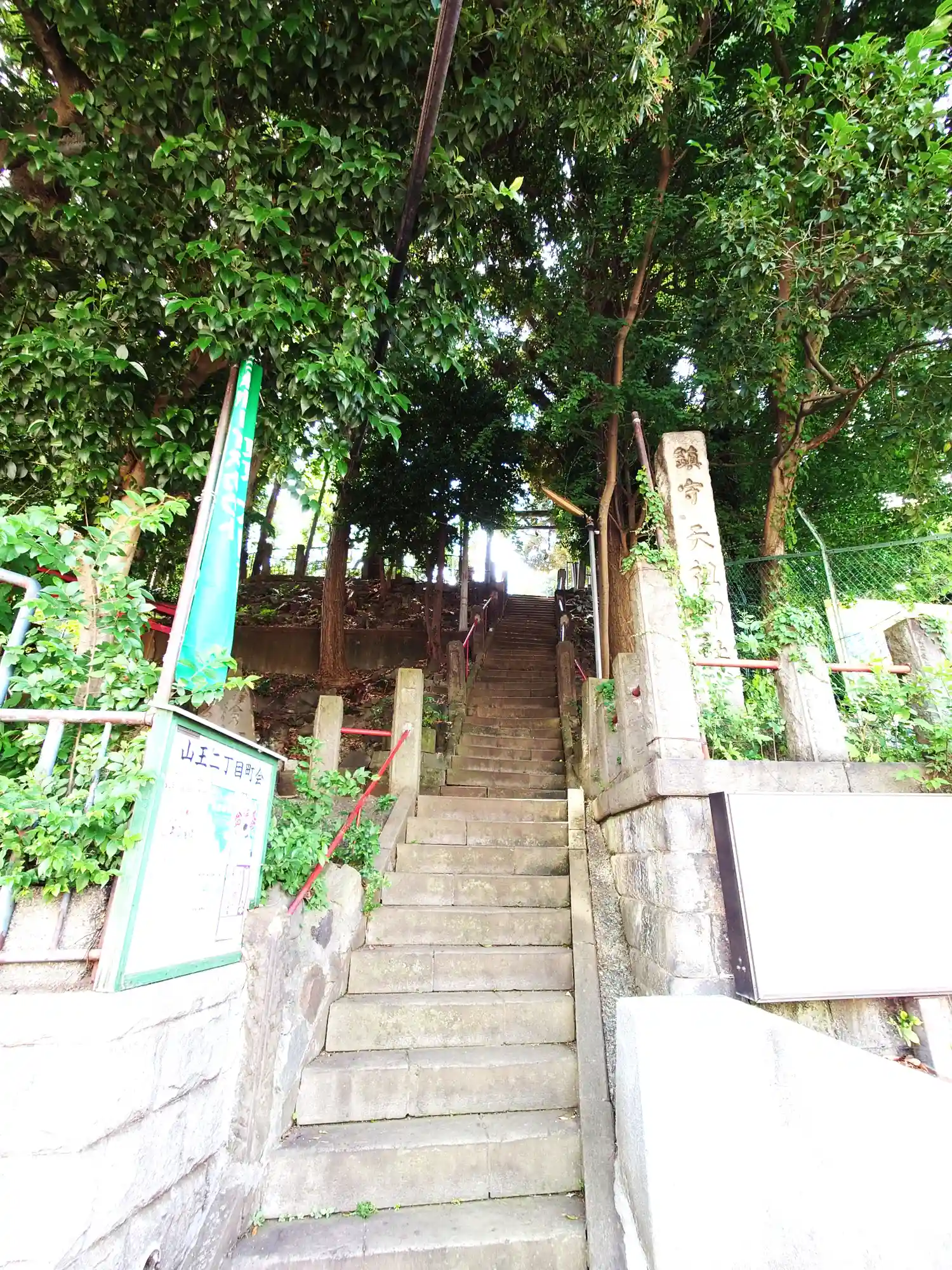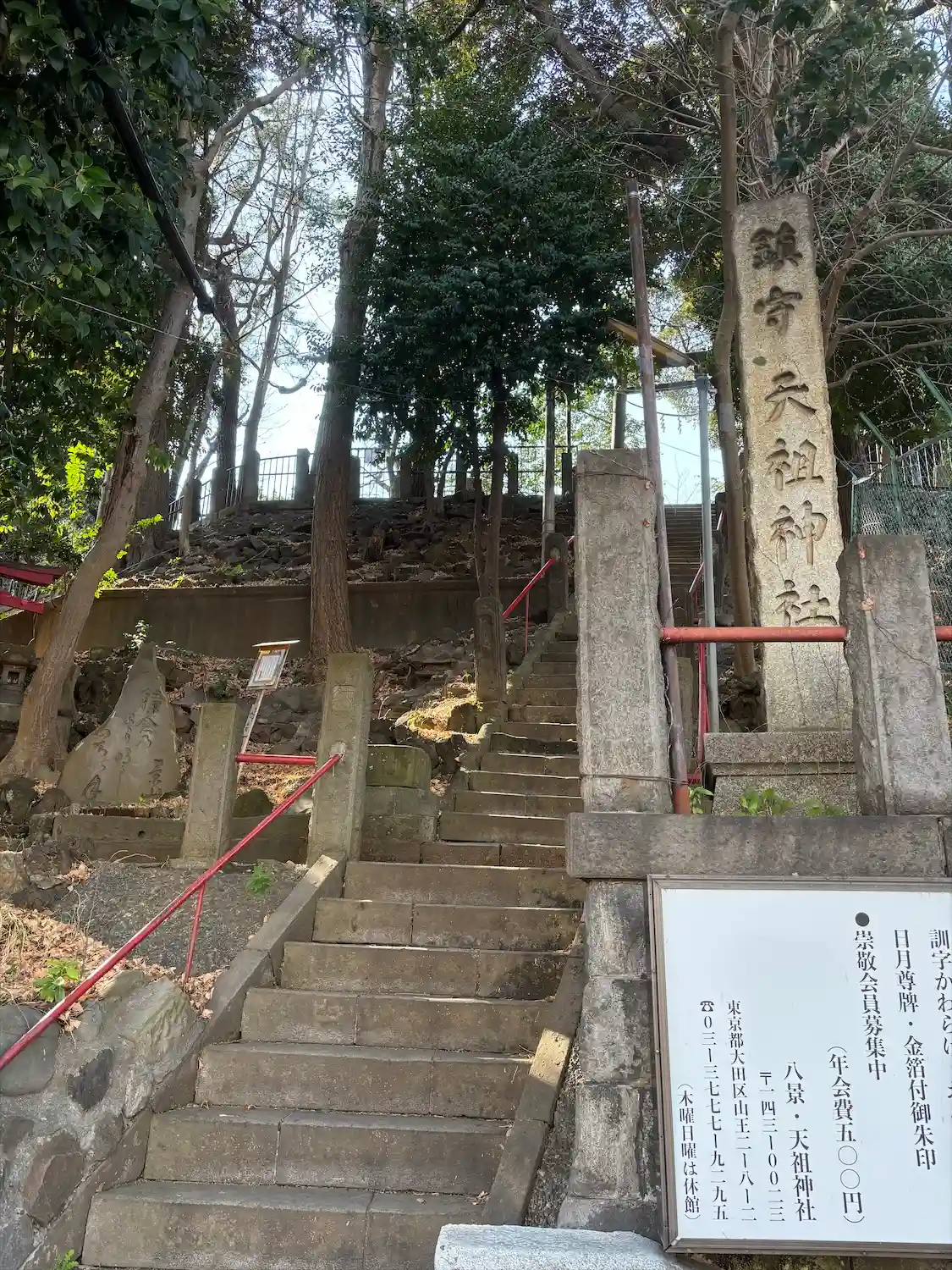 八景天祖神社〜石段の上に境内 社号碑 左の赤い鳥居は境内社・伏見稲荷大明神
