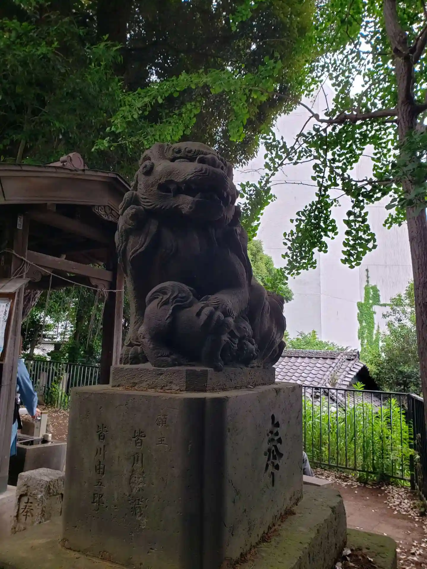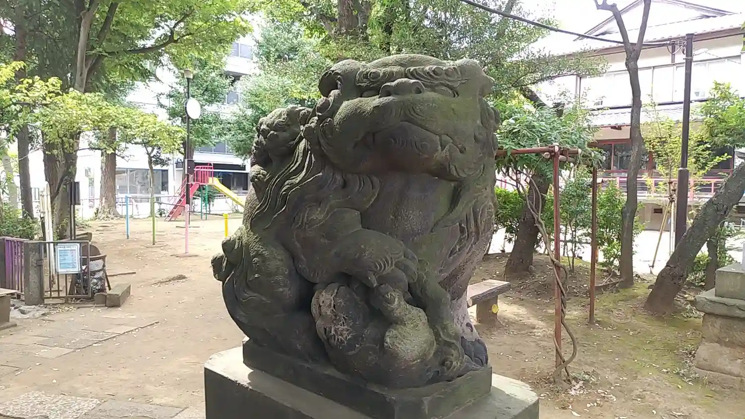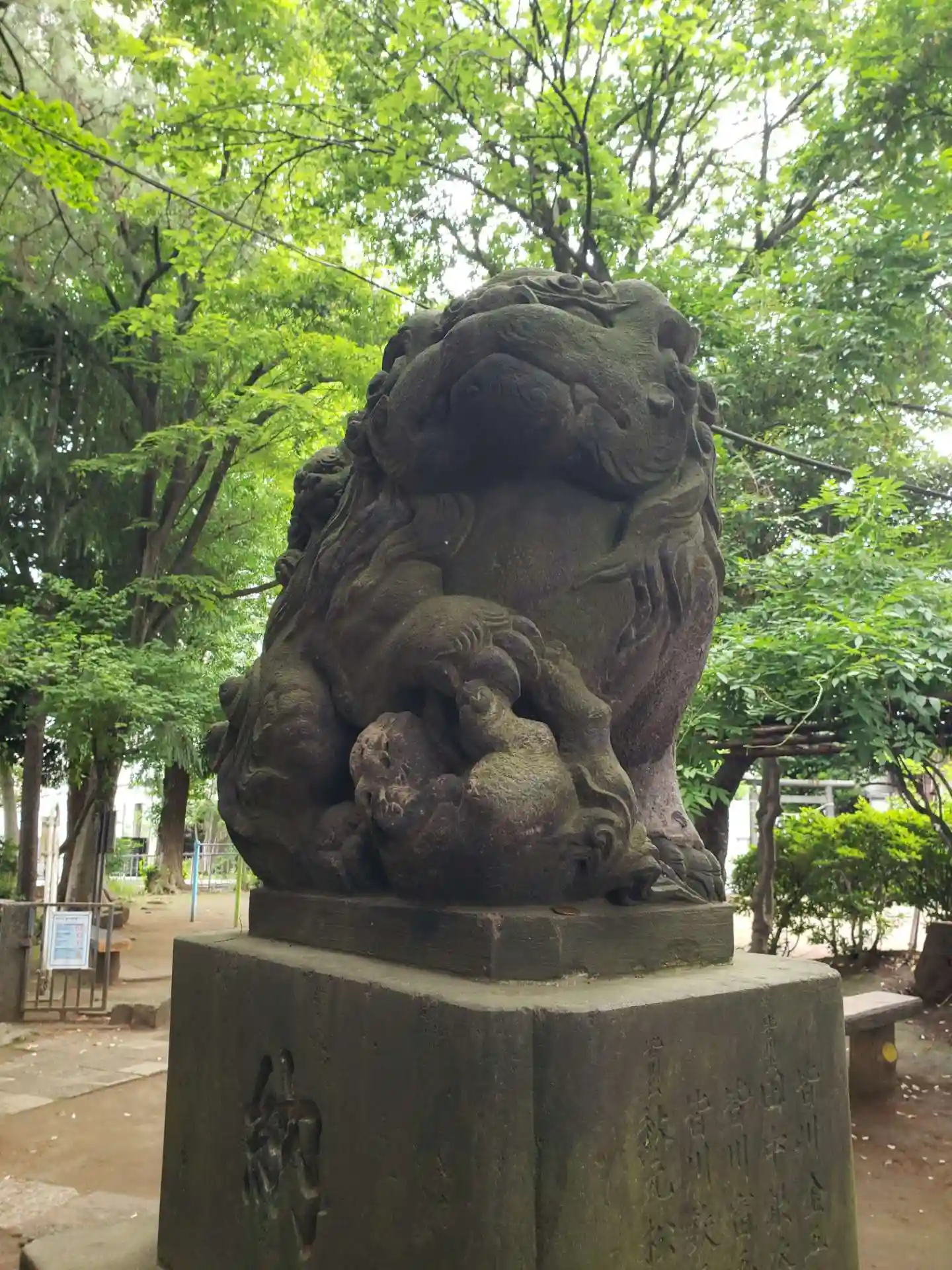八景天祖神社〜狛犬②仔犬が戯れついて背中にもいる
