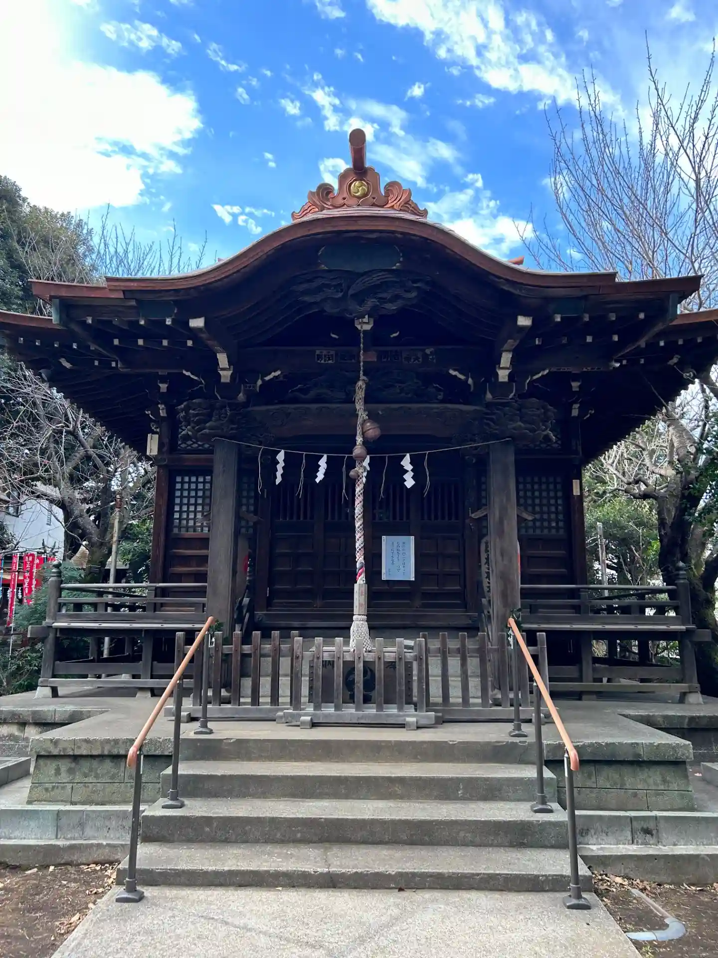東京都大田区山王の大森駅西口駅前にある神明山と呼ばれる急な石段の先に鎮座。