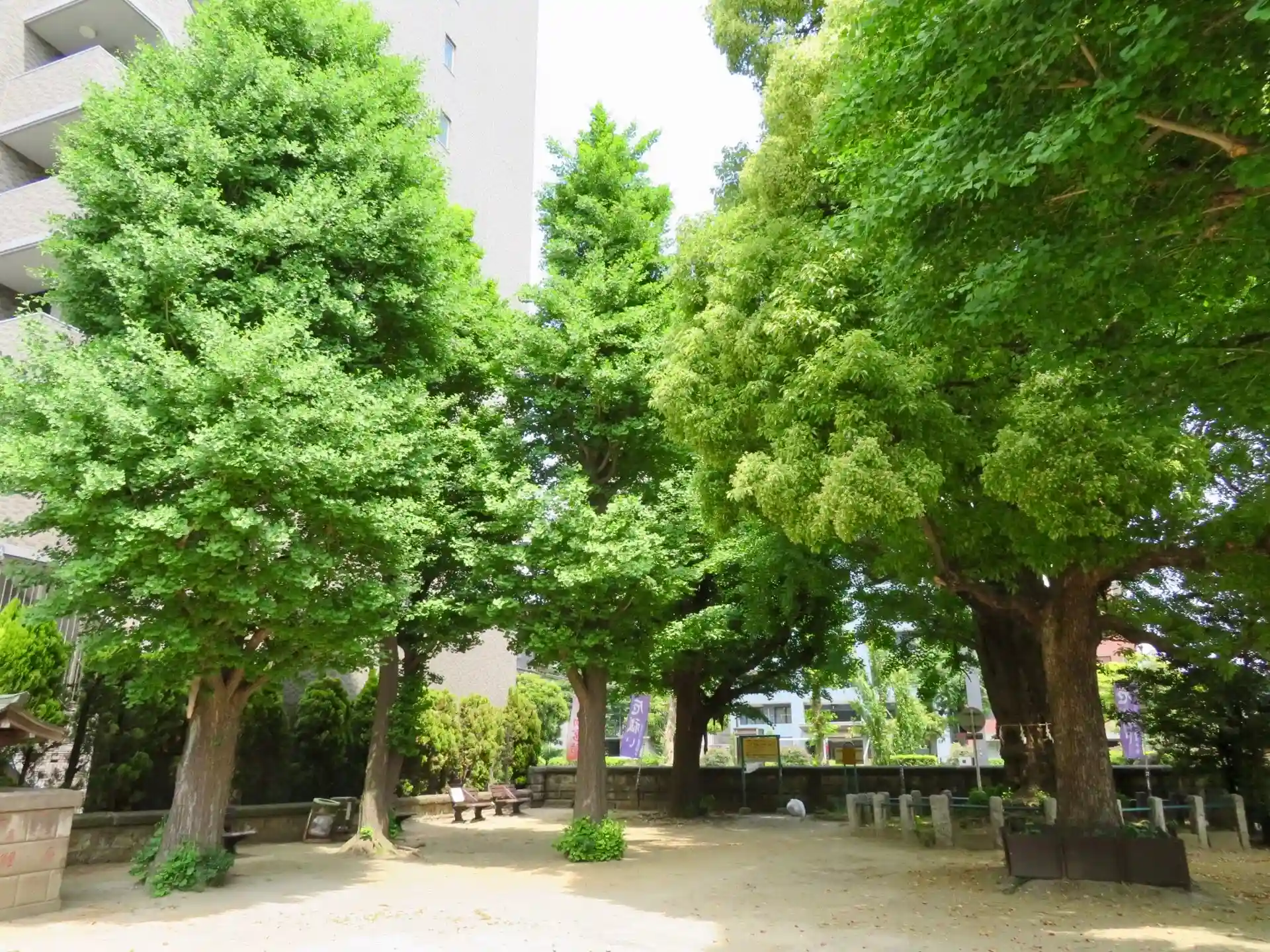 境内には木がたくさんあり、ベンチで休めます