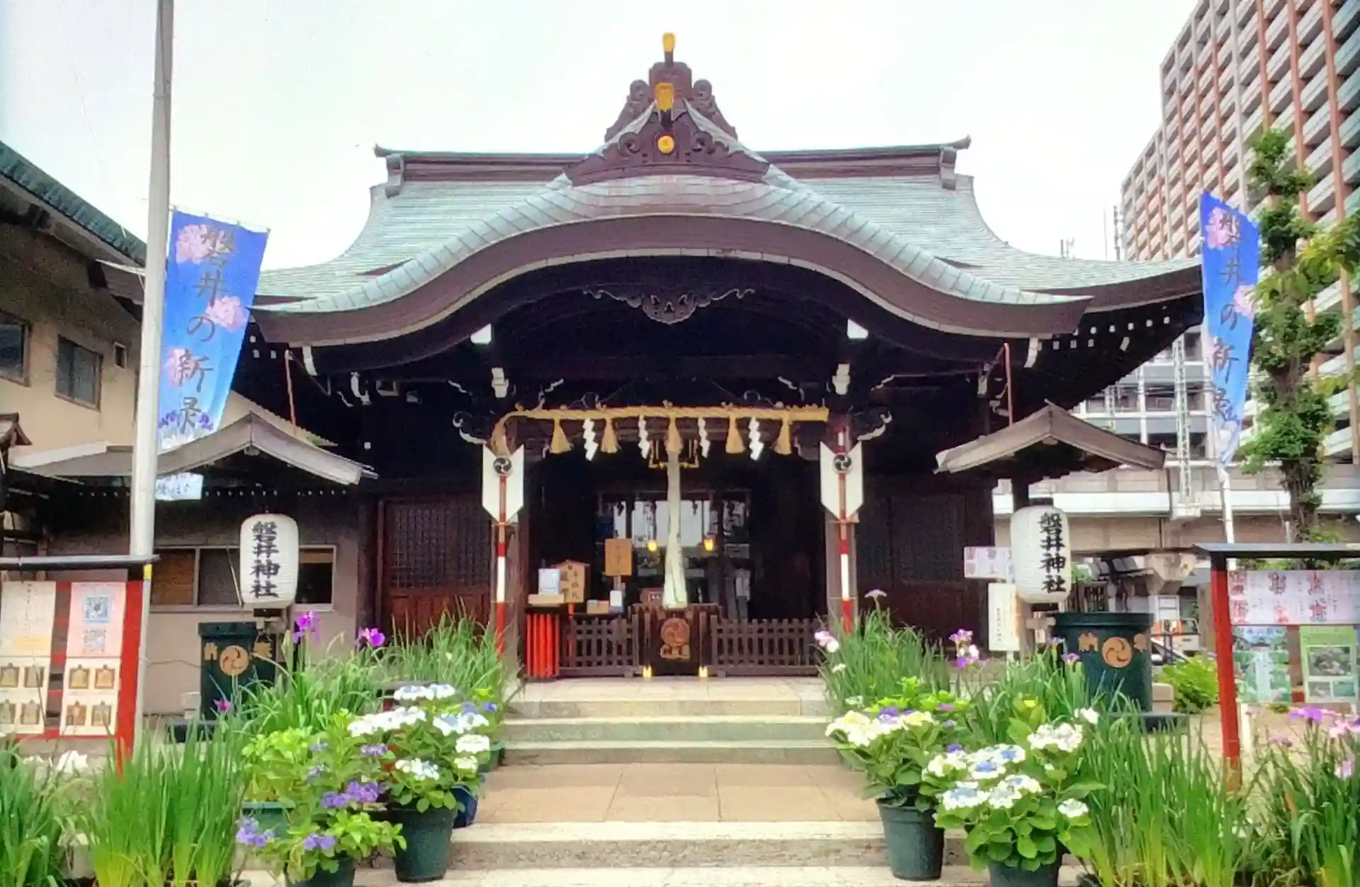 目的は神社の方が大切に丁寧に育てている菖蒲と紫陽花でいっぱいの境内でした。
