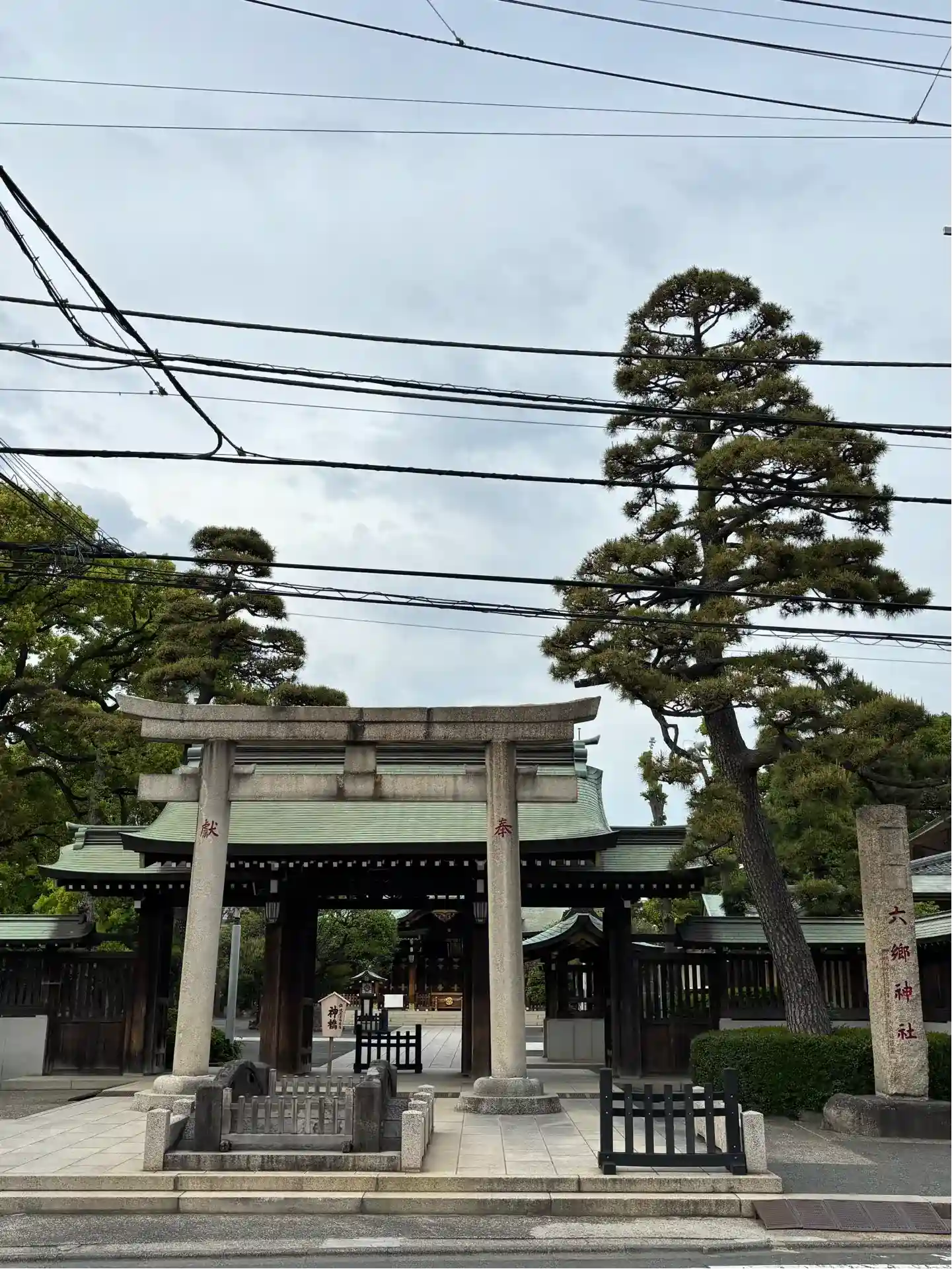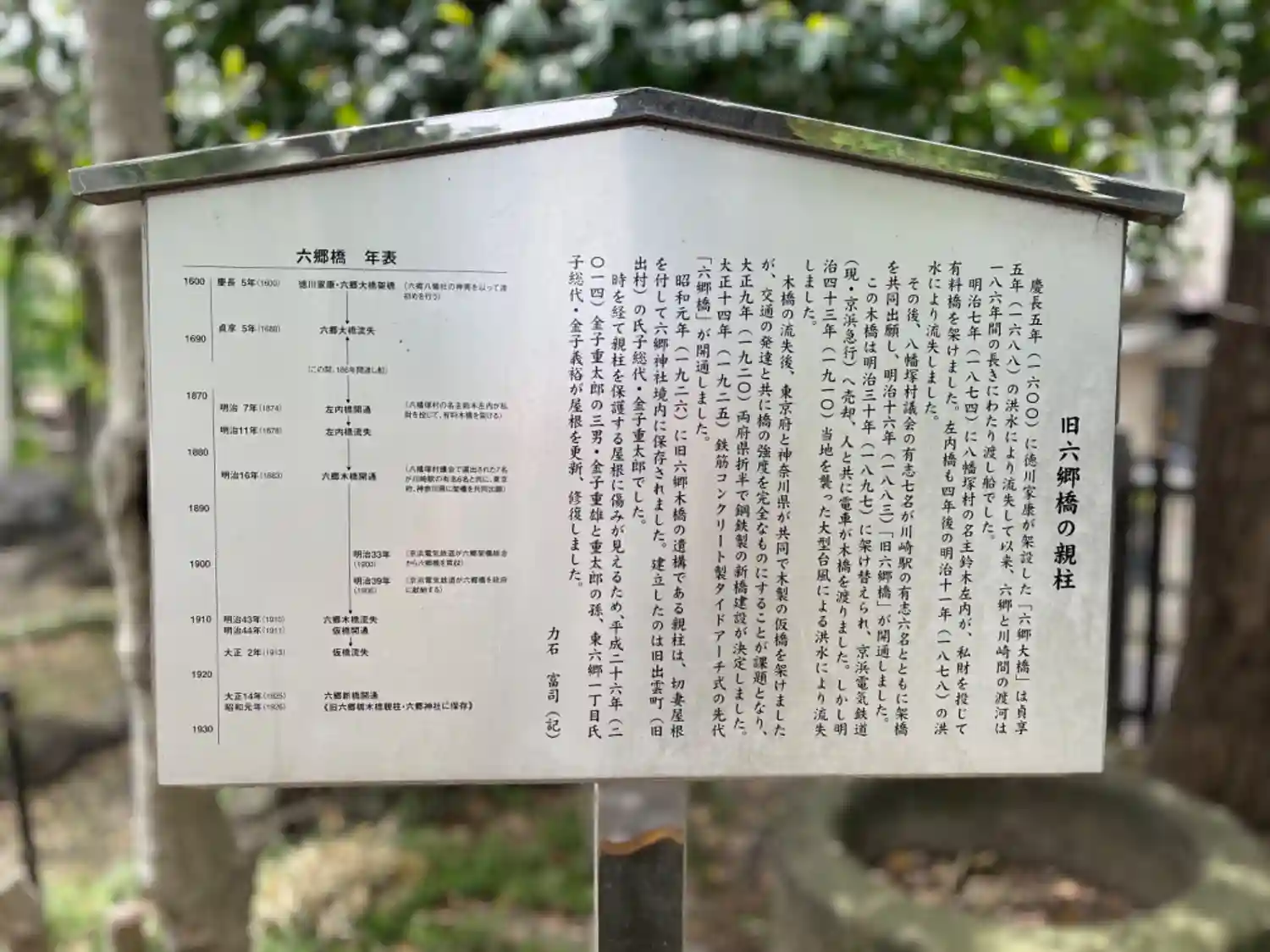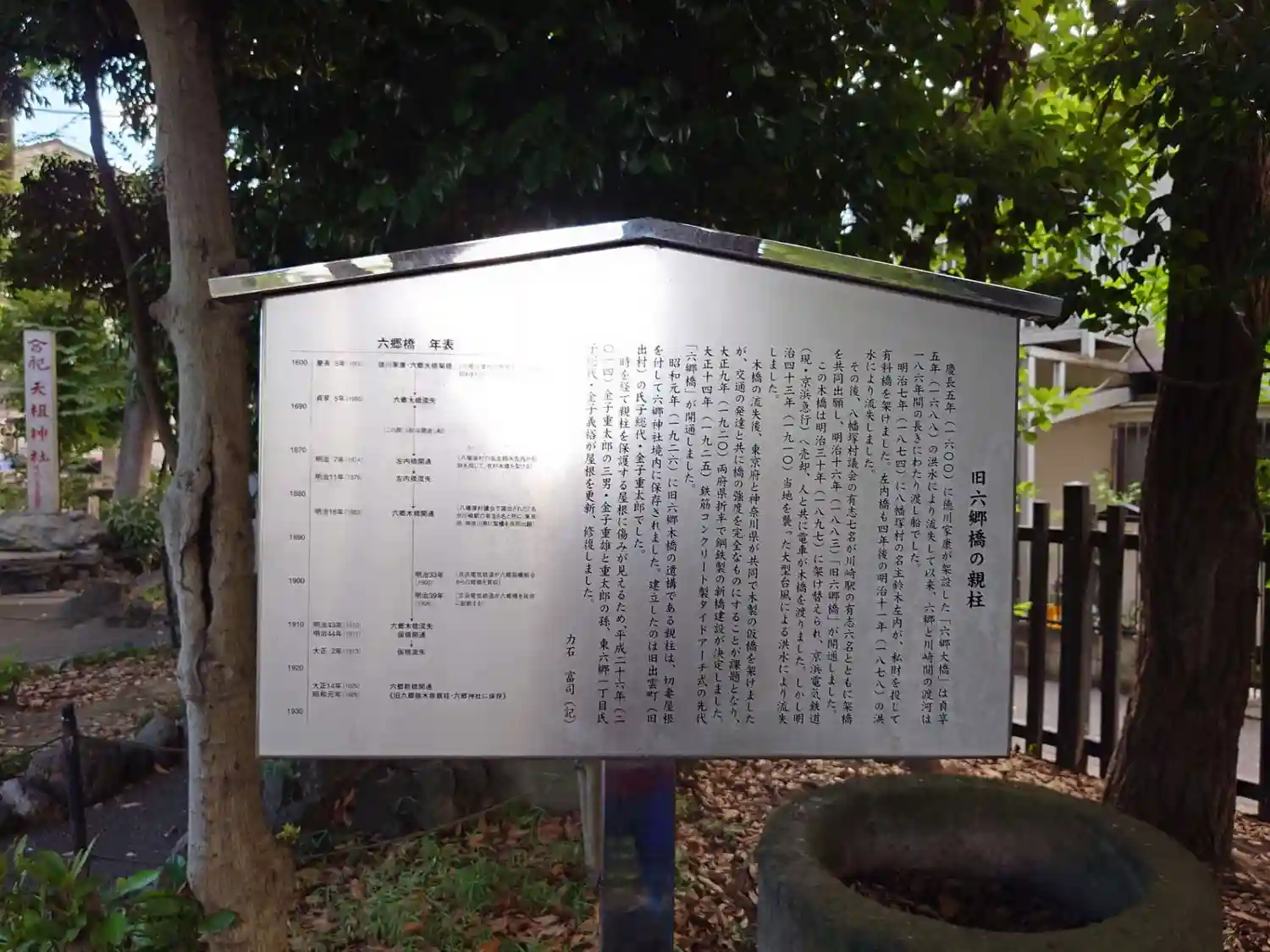 境内社の近くには<六郷橋の親柱>が保存されている。最初は1600年に徳川家康が架設したが洪水や台風で何度も流されている。保存されているのは1900年代初頭の最後の木製橋梁のもの。
