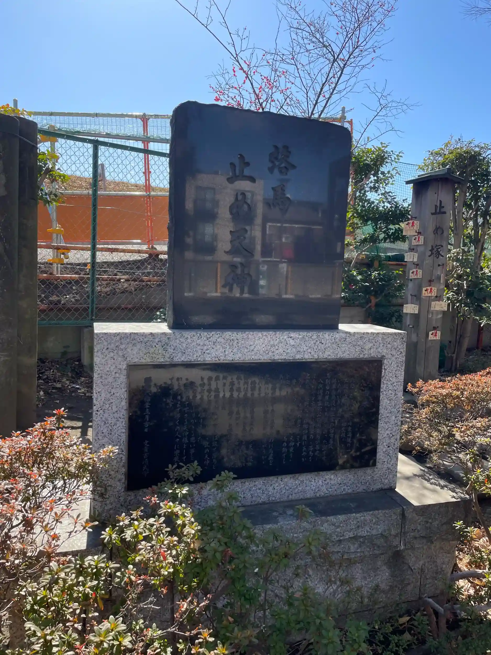 第8代将軍徳川吉宗の乗馬が暴走した際、落馬を止めたことから、東海道を往来する武士から「落馬止め天神」と称されるに至り、この加護にあやかり将軍指南役の柳生家留守居役が近くに屋敷を構えた。