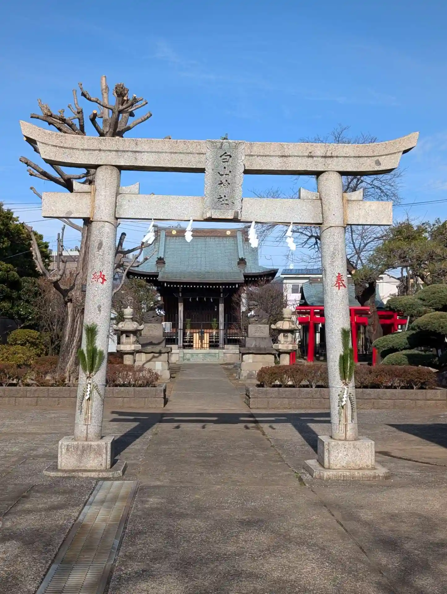 白梅がもう咲いてました。青空に赤い鳥居が綺麗な神社です。年末詣行ってきました。