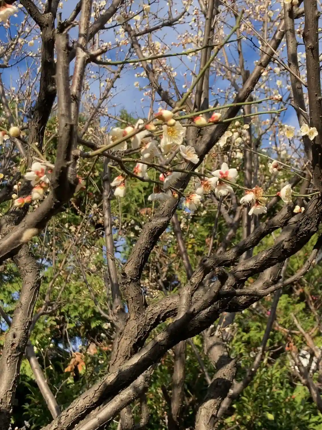 紅梅も咲き始めていて、赤い鳥居と青空をバックにとっても綺麗でした。白梅はかなり開いてました。紅梅…