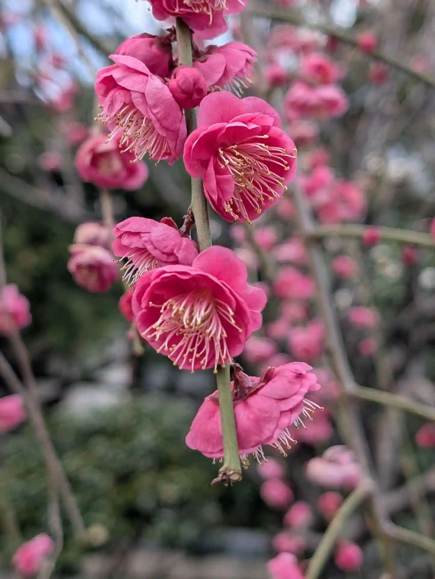 鳥居横の紅梅が終わっていて残念でしたが枝垂れ梅が綺麗でした。木瓜の花も綺麗でした。