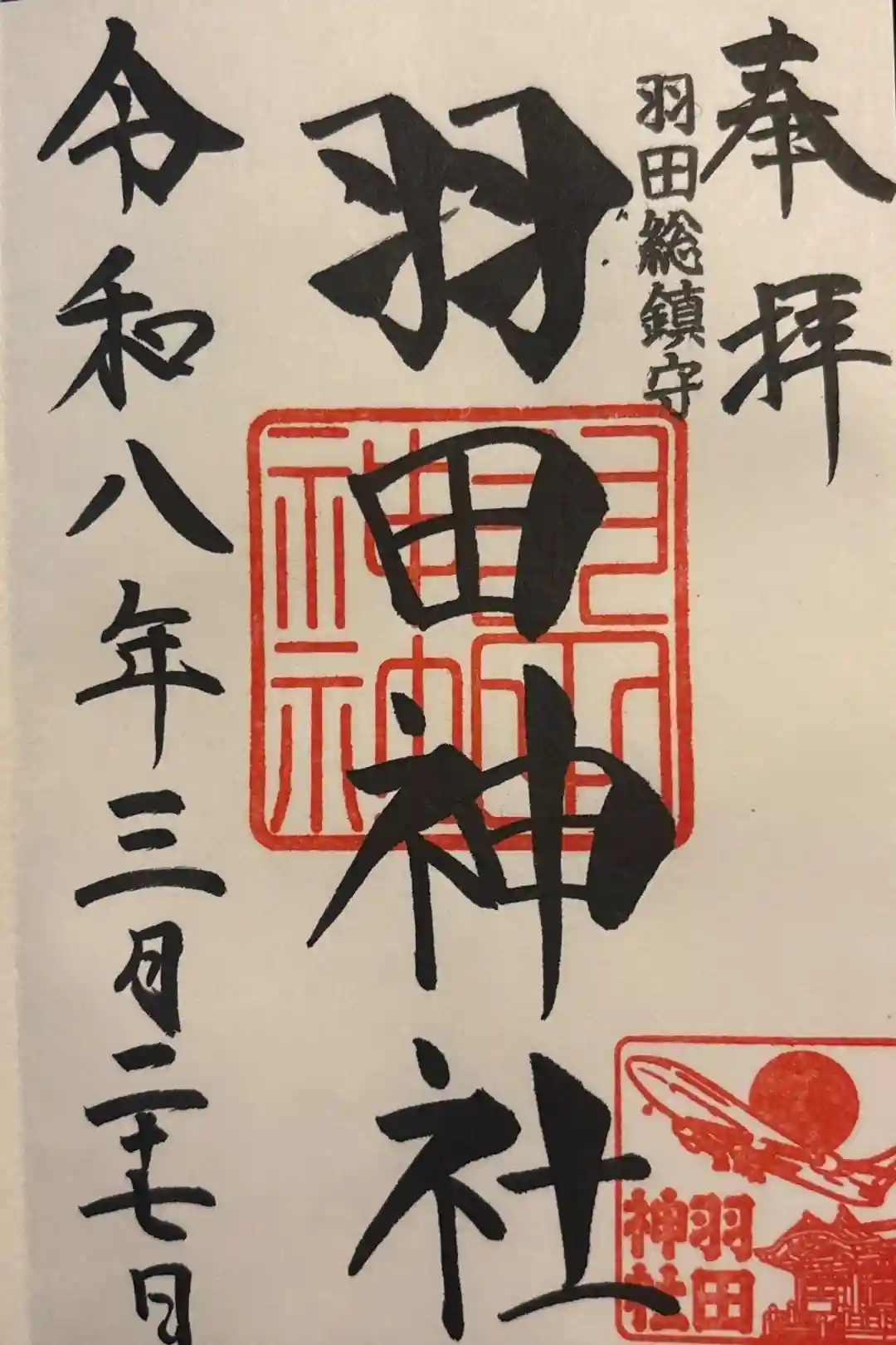 真ん中に羽田神社と書かれ、その右に羽田総鎮守の印、真ん中に社印、右下に離陸する飛行機が描かれた印が押されています。