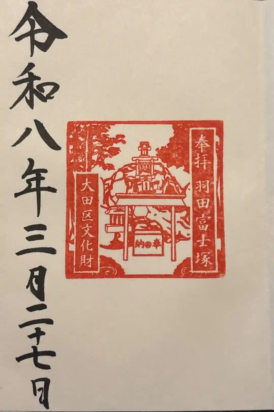 富士塚が描かれ「奉拝 羽田富士塚 大田区文化財」の印が真ん中右よりに大きく押されています。