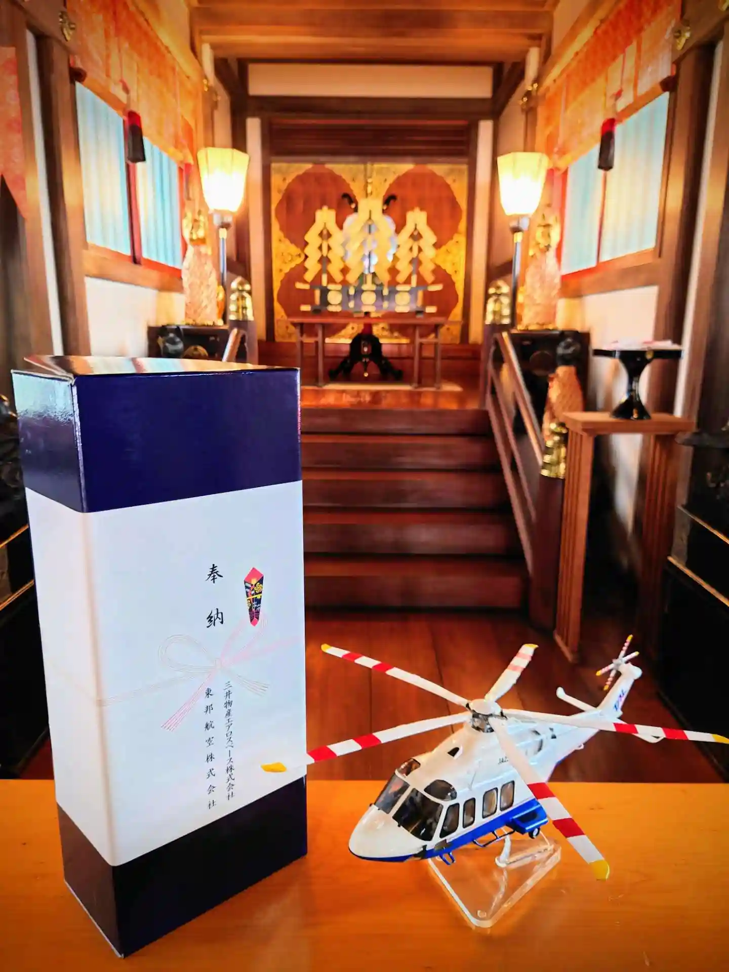 株式会社ソラシドエアさまよりJA801X(Boeing 737-81D)、三井物産エアロスペース株式会社さま・東邦航空株式会社さまよりレオナルド社製AW139型ヘリコプターJA239A号機のモデルプレーンをご奉納頂きました。