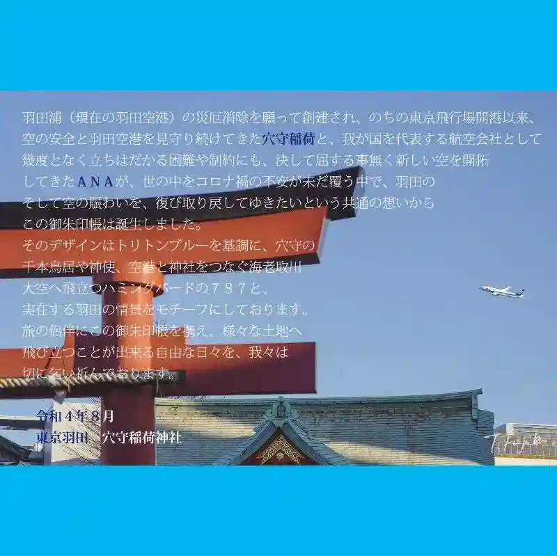 世の中をコロナ禍の不安が未だ覆う中で 羽田の そして空の賑わいを 復び取り戻してゆきたいという「ANA」と「穴守稲荷」の共通の想いを込めた御朱印帳を奉製致しました