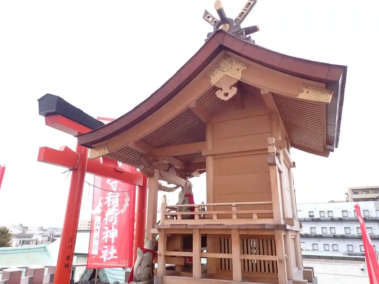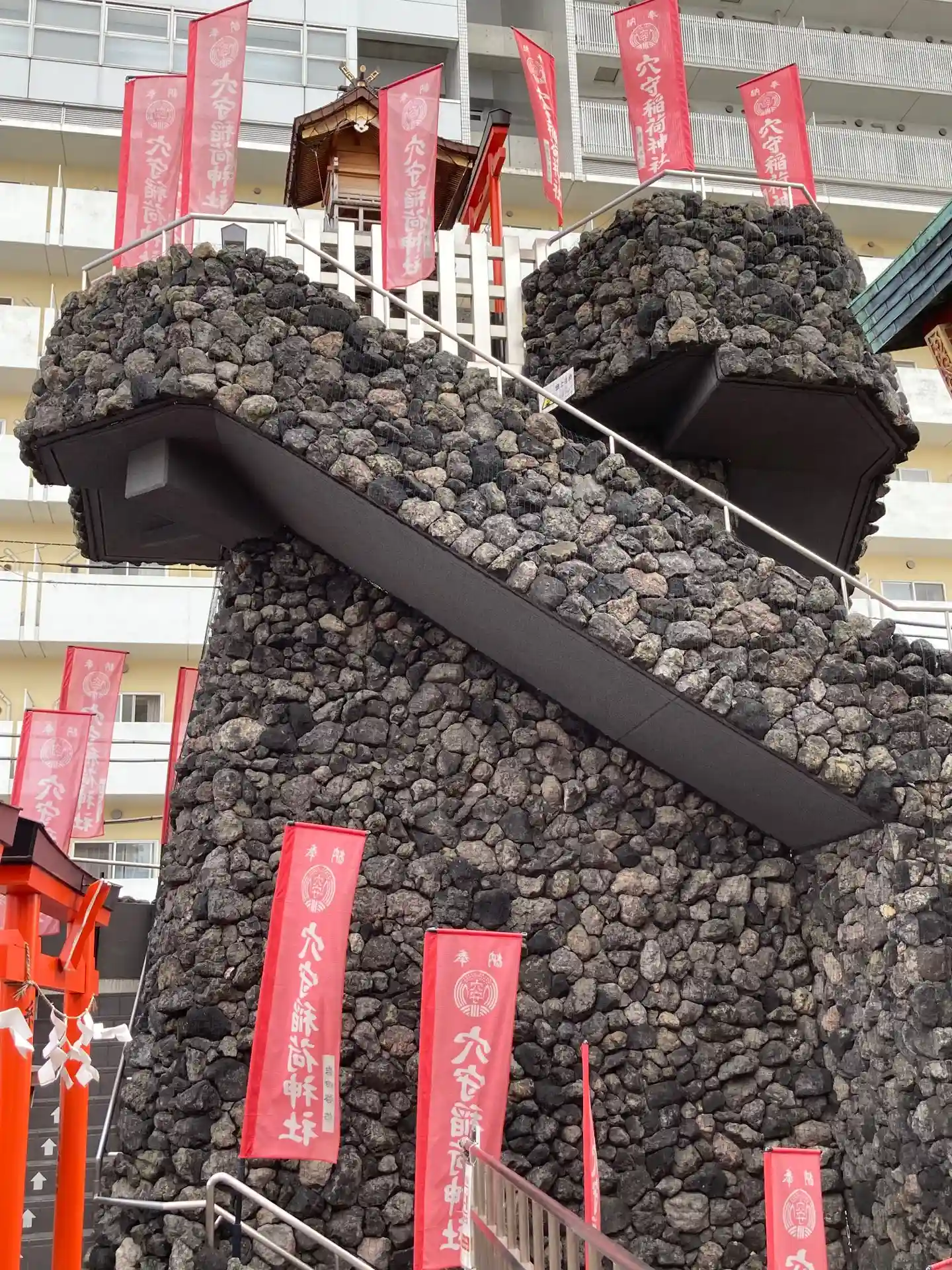 稲荷山山頂の奥之宮は、隣のビルに見下ろされ。