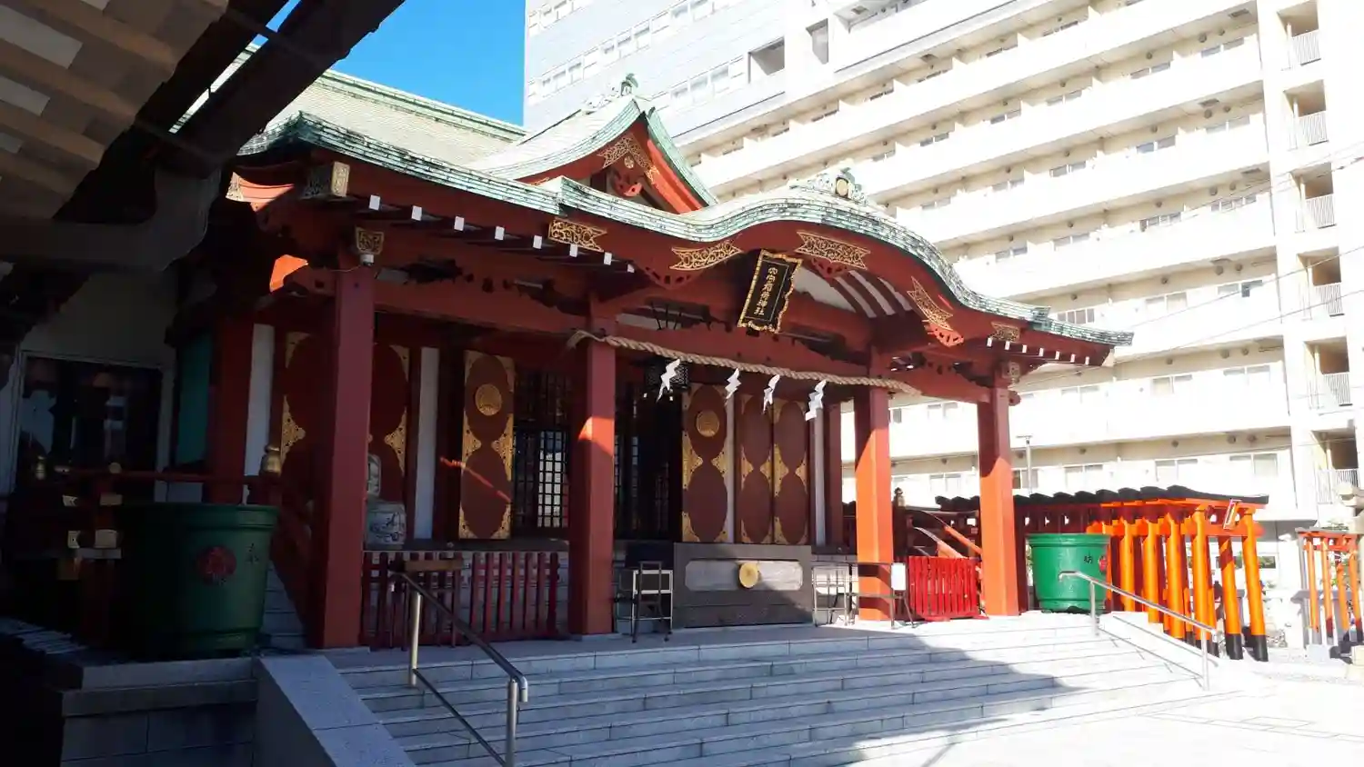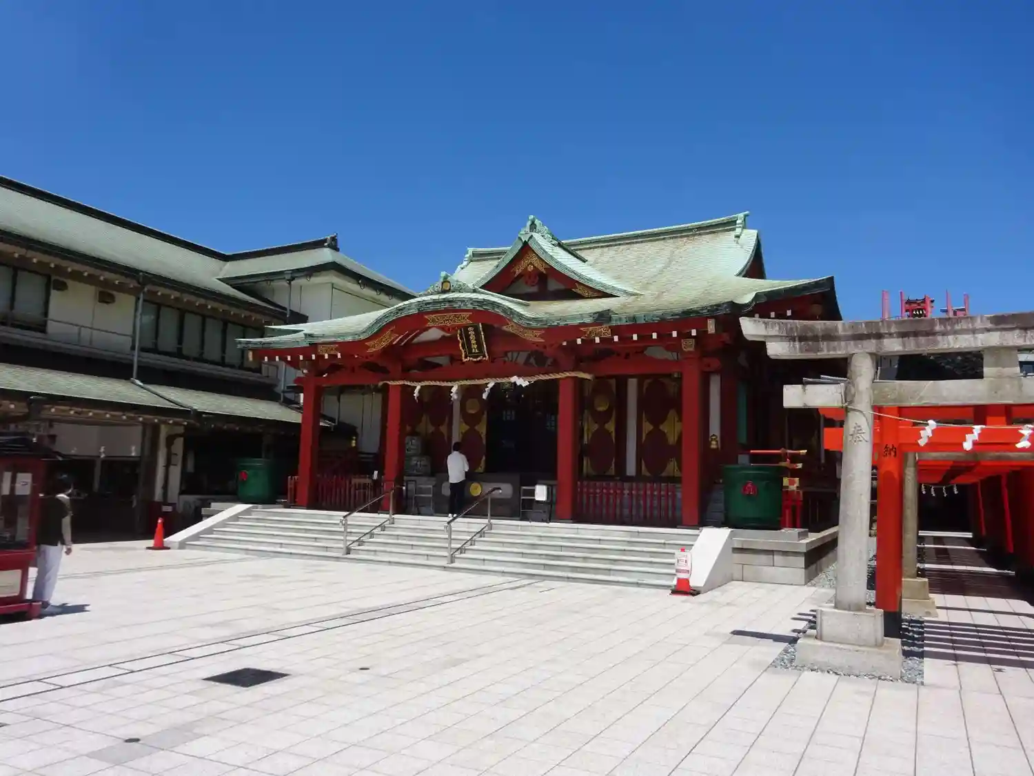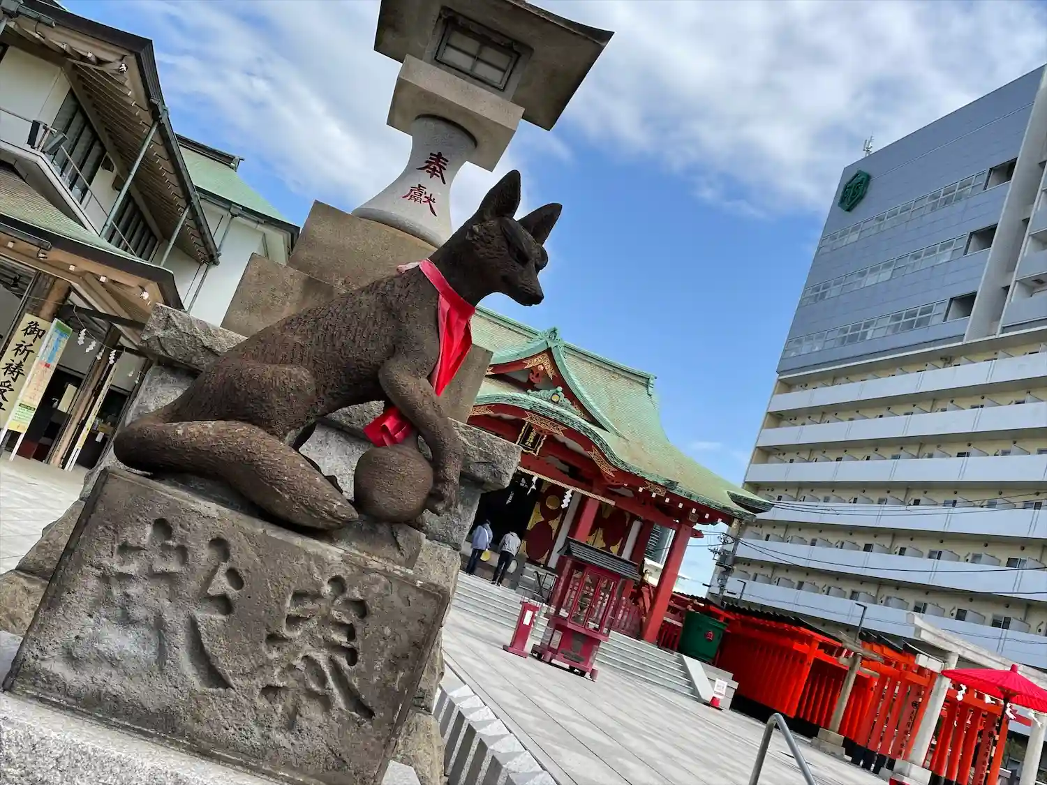 🚃京浜急行穴守稲荷駅から徒歩約5分の駅近神社です。青空の下清々しい気持ちで参拝。土埃のない今風の神…