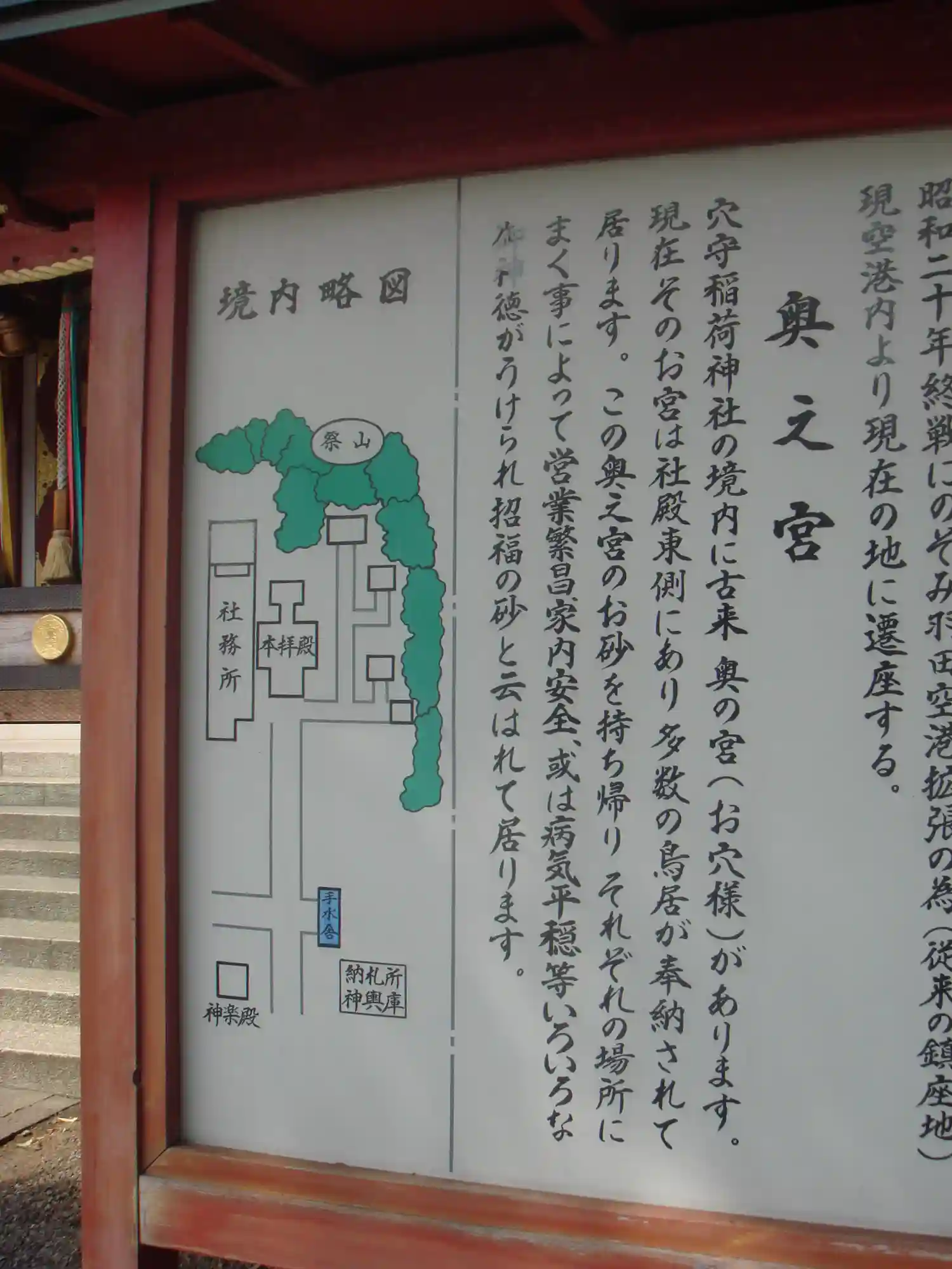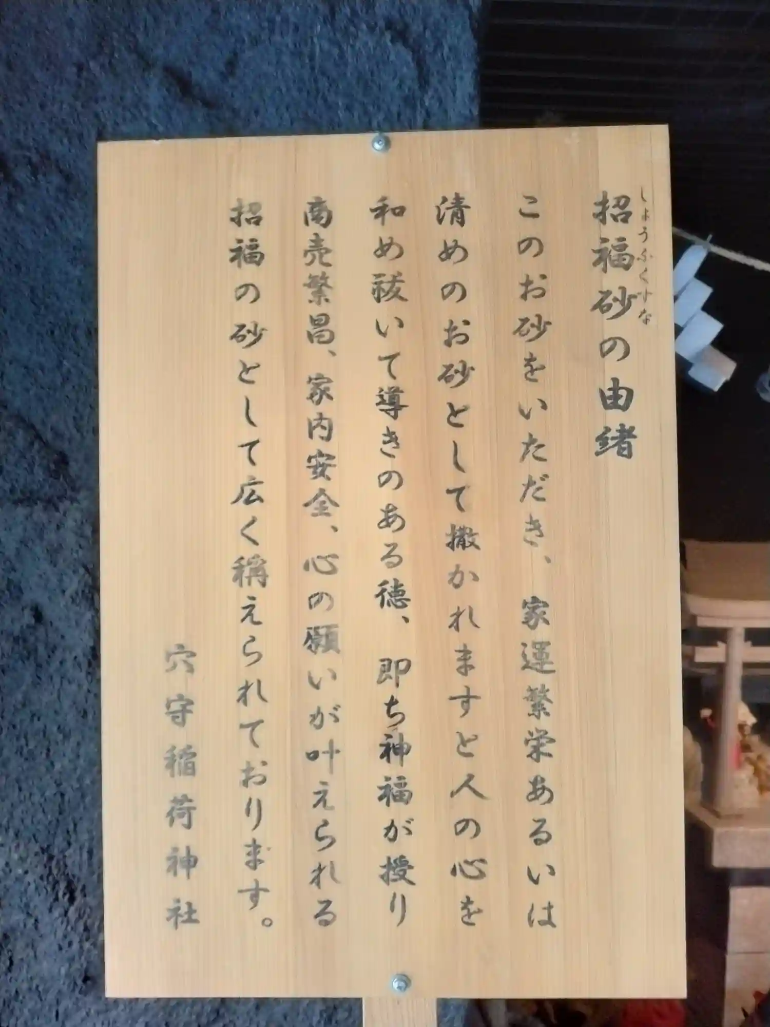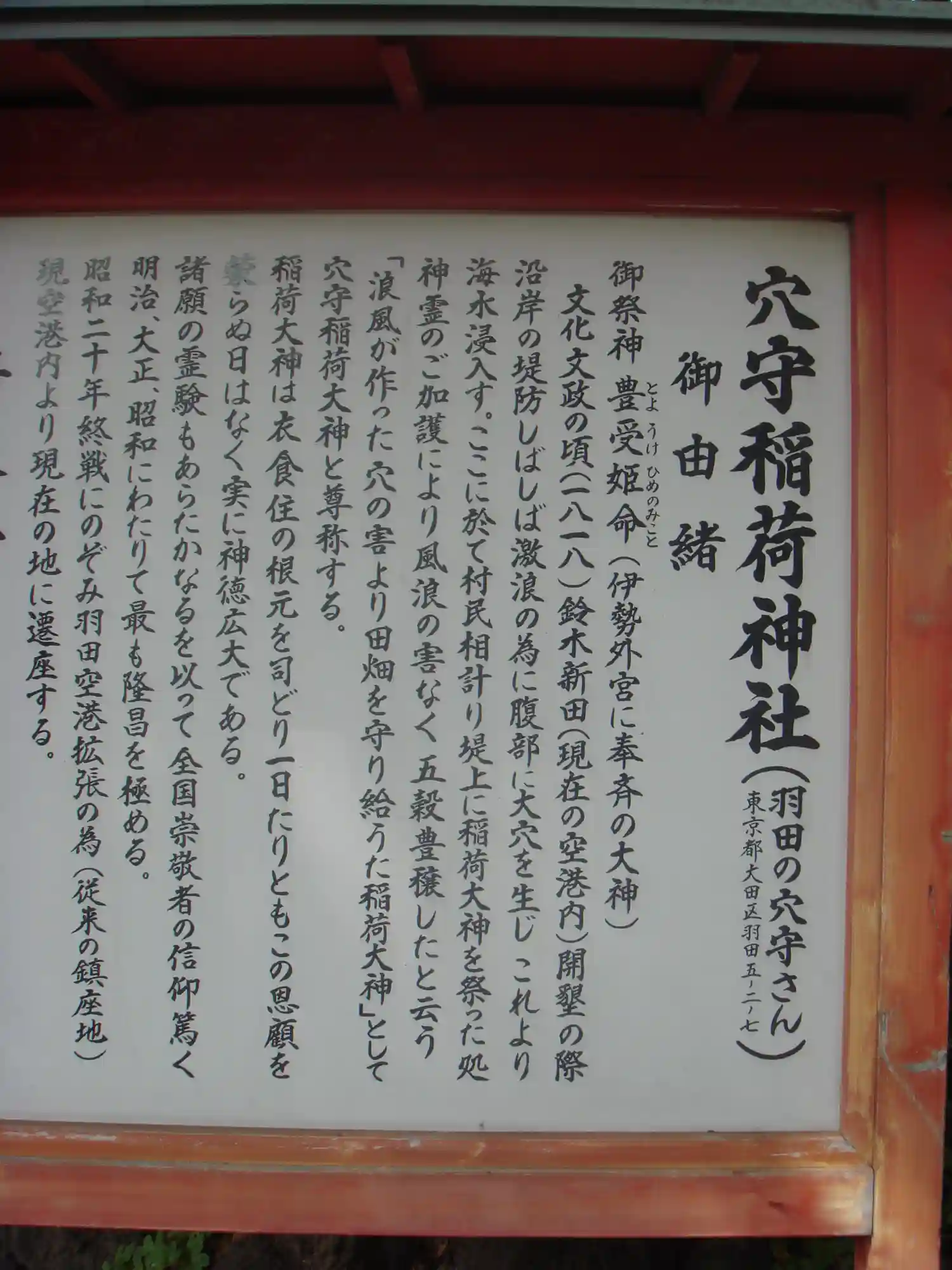 爾来神霊の神威灼然にして風浪の害なく五穀豊穣す その穴守を称するは「風浪が作りし穴の害より田畑を守り給う稲荷大神」という心なり