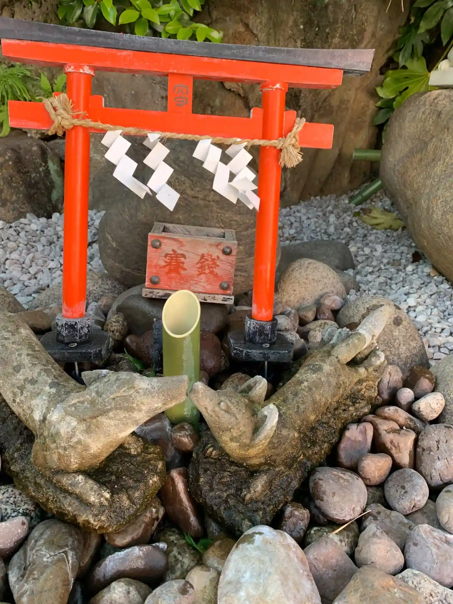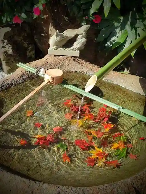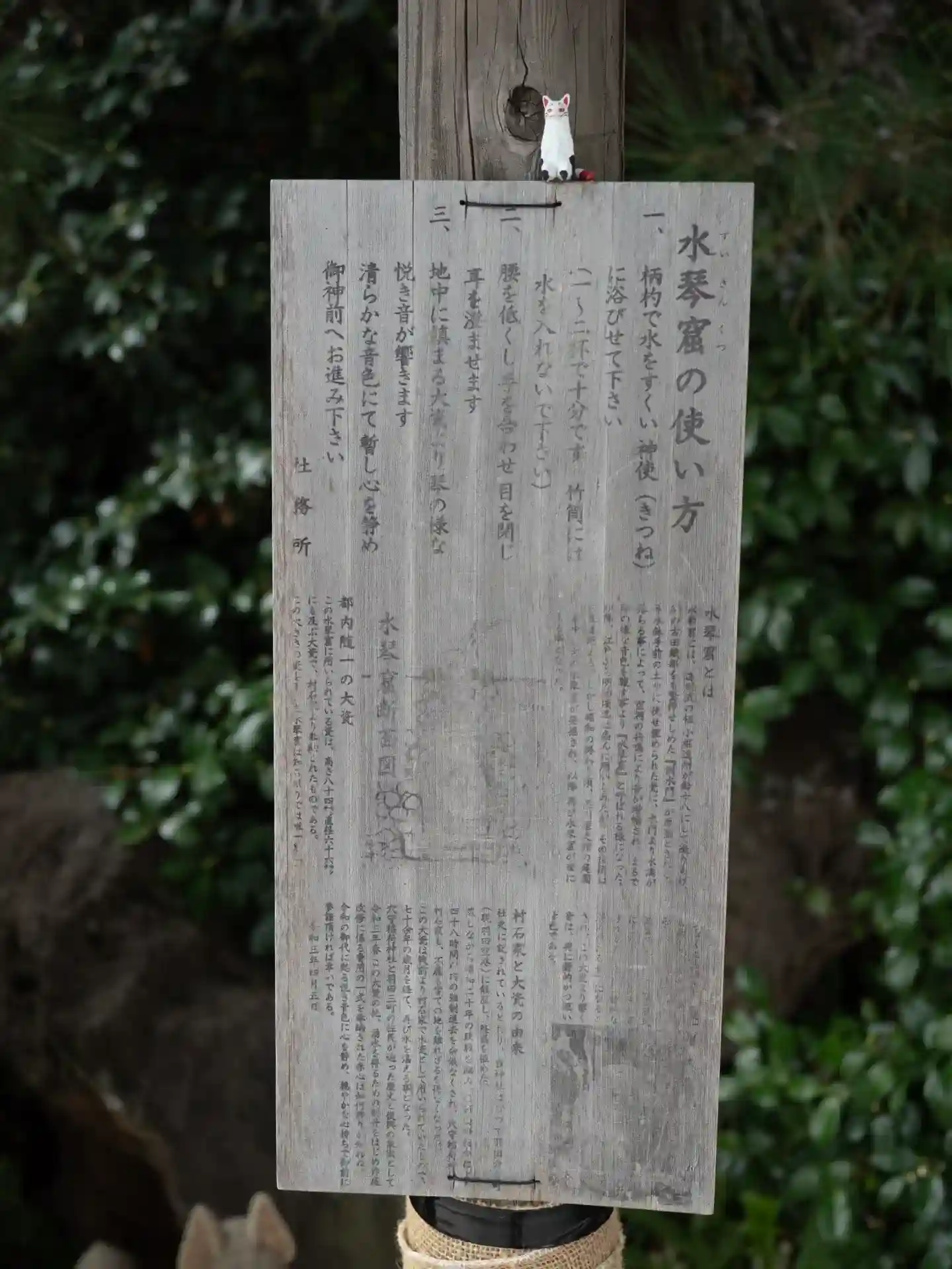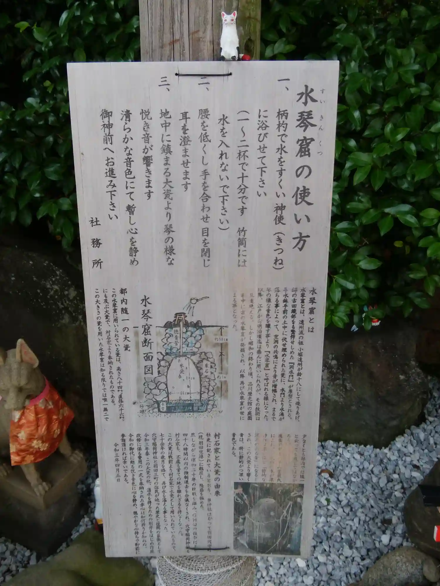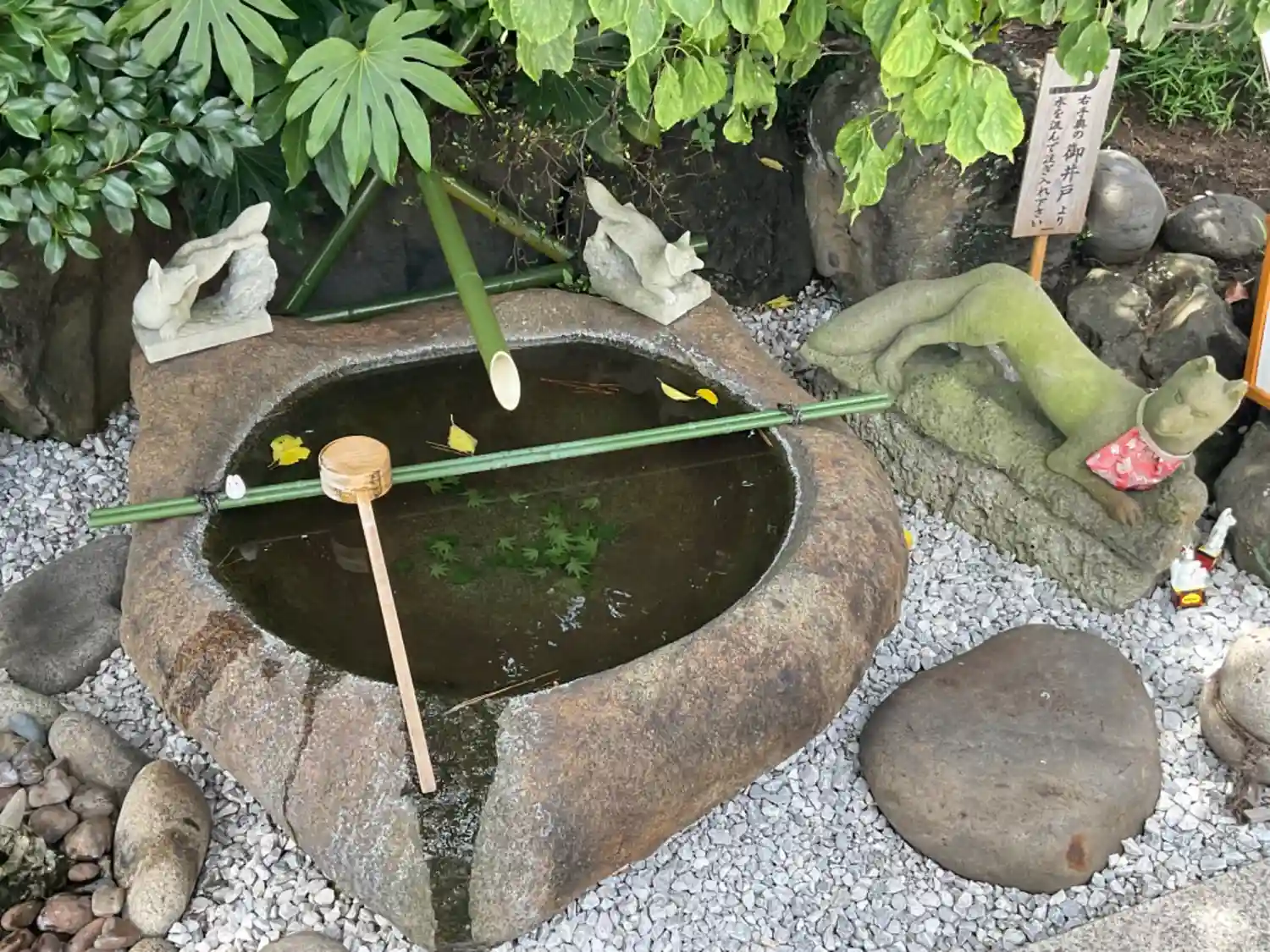 水琴窟。お狐様の背中に水をかけると心地よい音がする。
