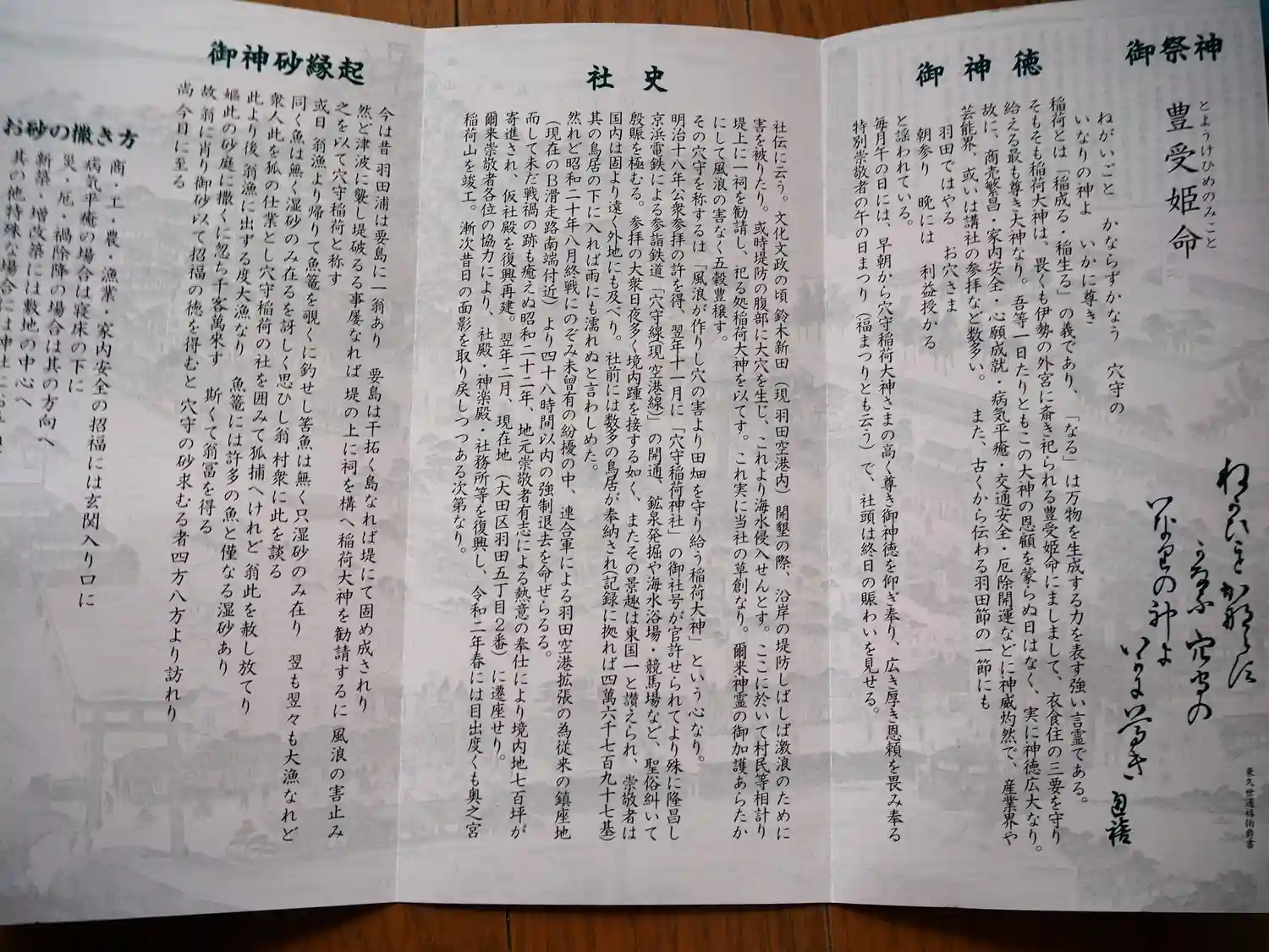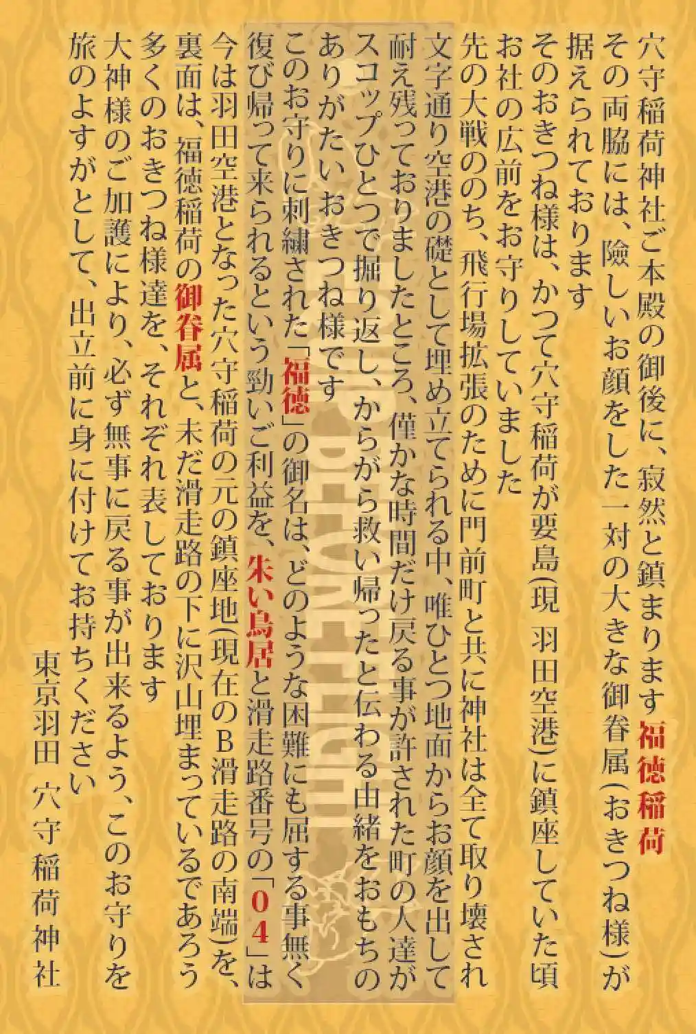「風浪が作りし【穴】の害より田畑を【守】り給う稲荷大神」と神徳を称え、【穴守稲荷神社】となりました。