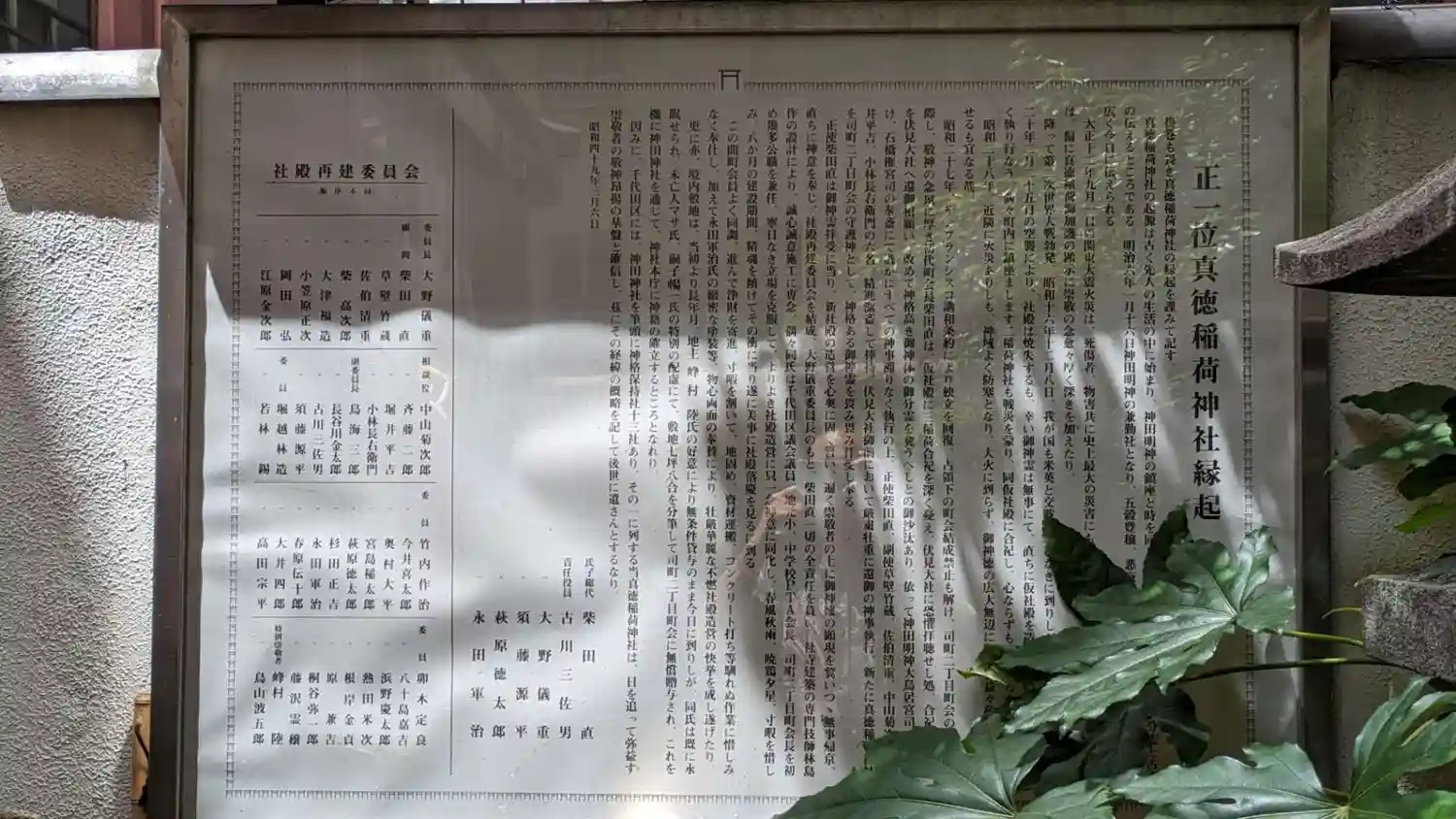 真徳稲荷神社の創建年代は不詳ですが、神田明神の鎮座と同時期に京都伏見稲荷大明神の御分霊を勧請したものと伝えられています。明治6年に神田明神の兼務社となり、第二次世界大戦では戦災により焼失、神田司町内の2稲荷神社を仮社殿に合祀したといいます。昭和27年に町会結成禁止の解除に伴い、3稲荷神社を伏見大社へ還座、改めて御分霊を勧請し、真徳稲荷神社として発足しました。(境内掲示より抜粋)