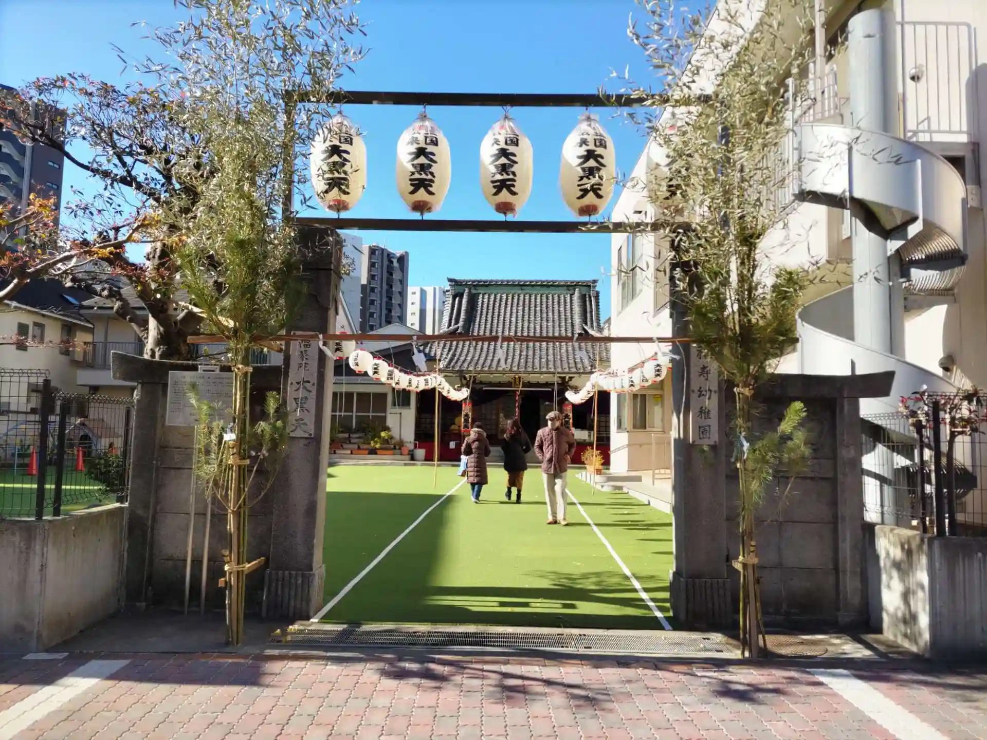 福寿幼稚園の中に祭られており、普段は入ることができないので正月ならではの参拝となります。